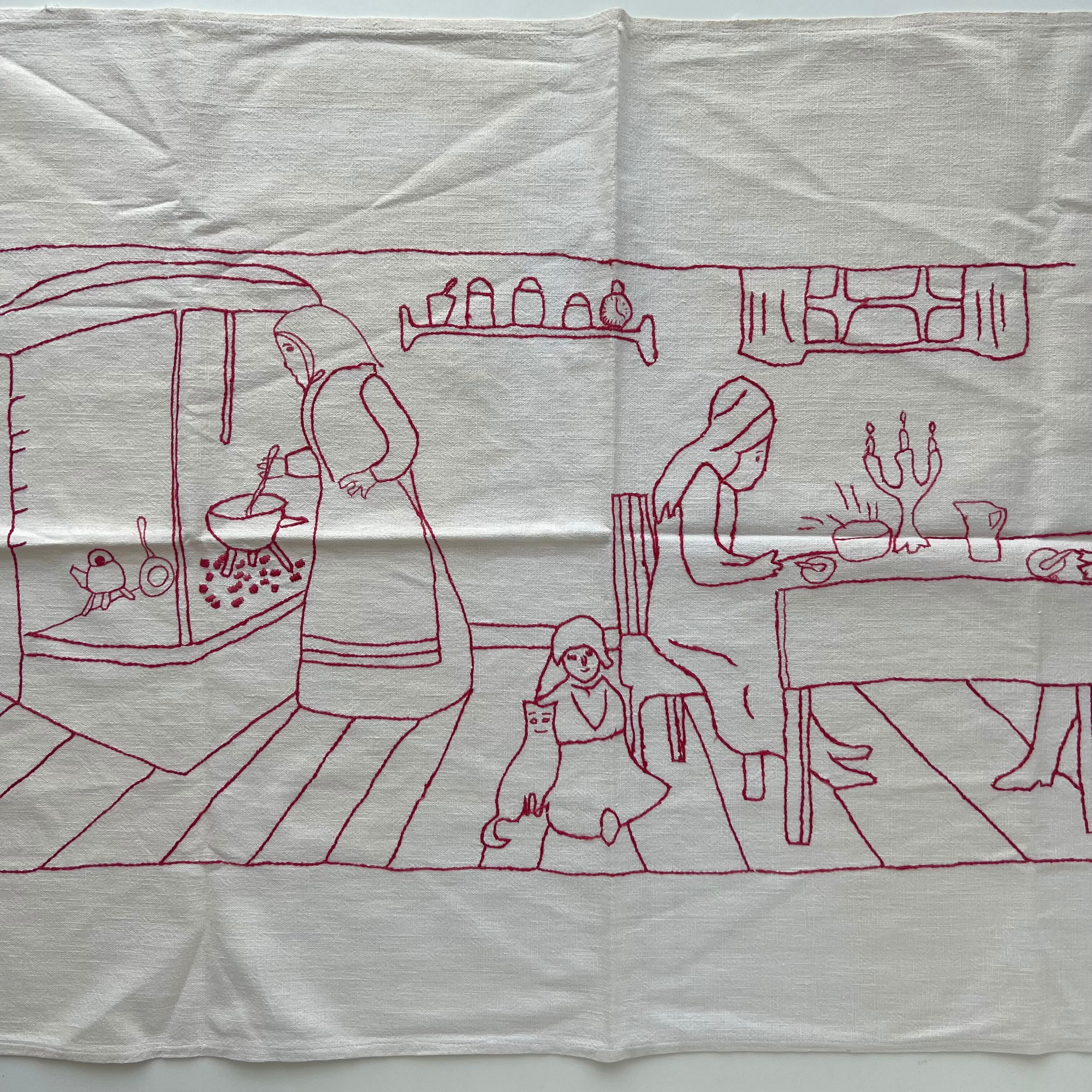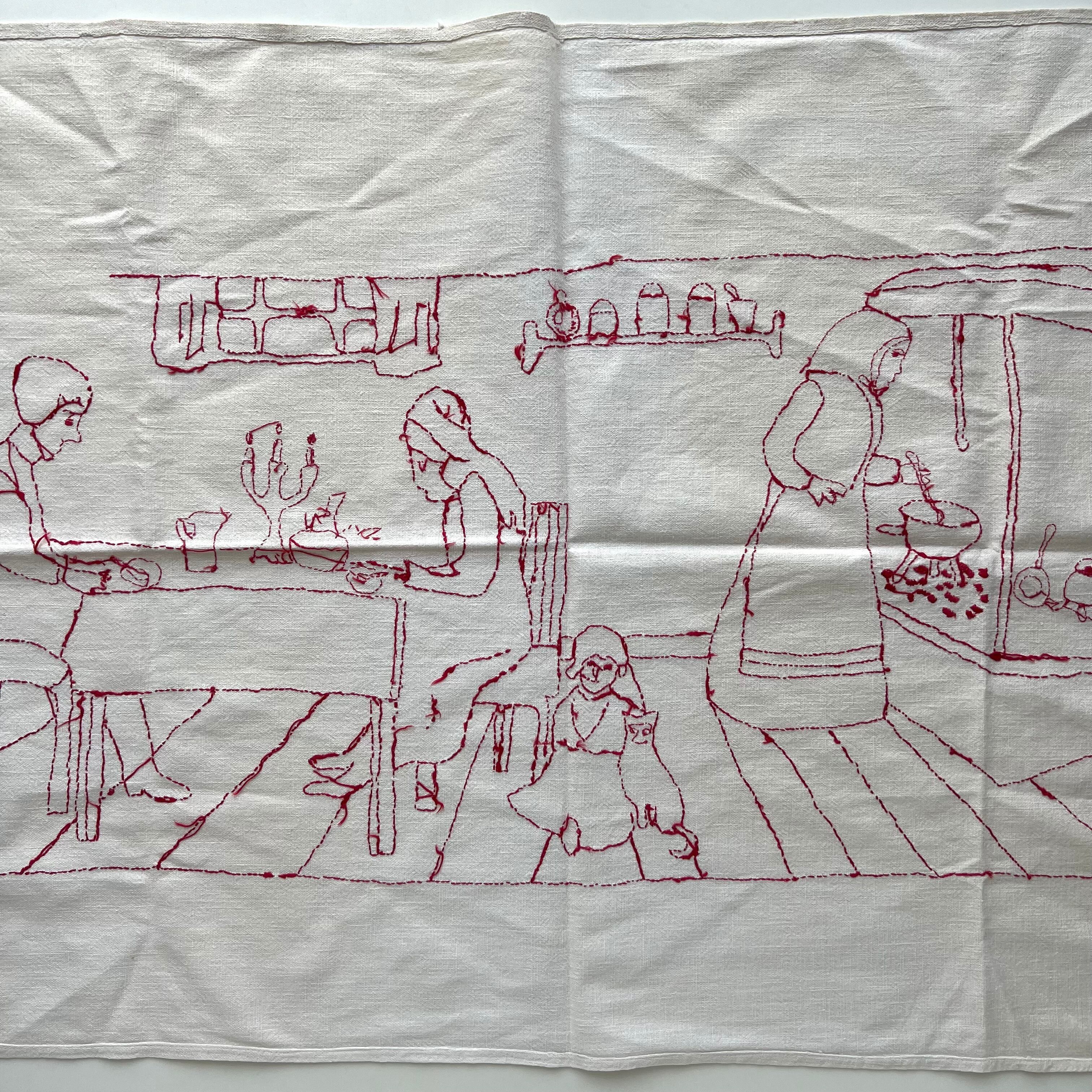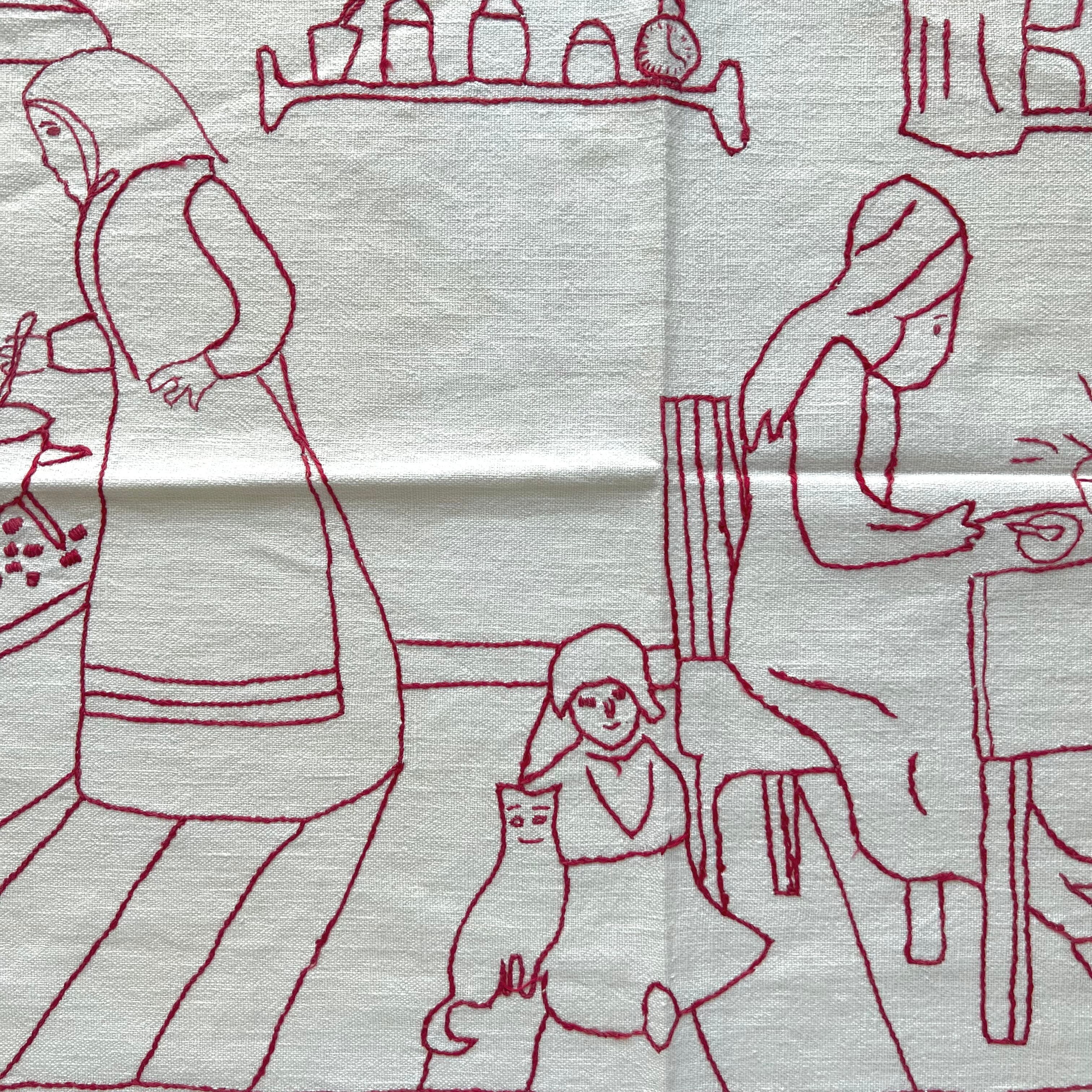 1800年代から1900年代頃の農村の家の風景が一色の糸で表現されています。
