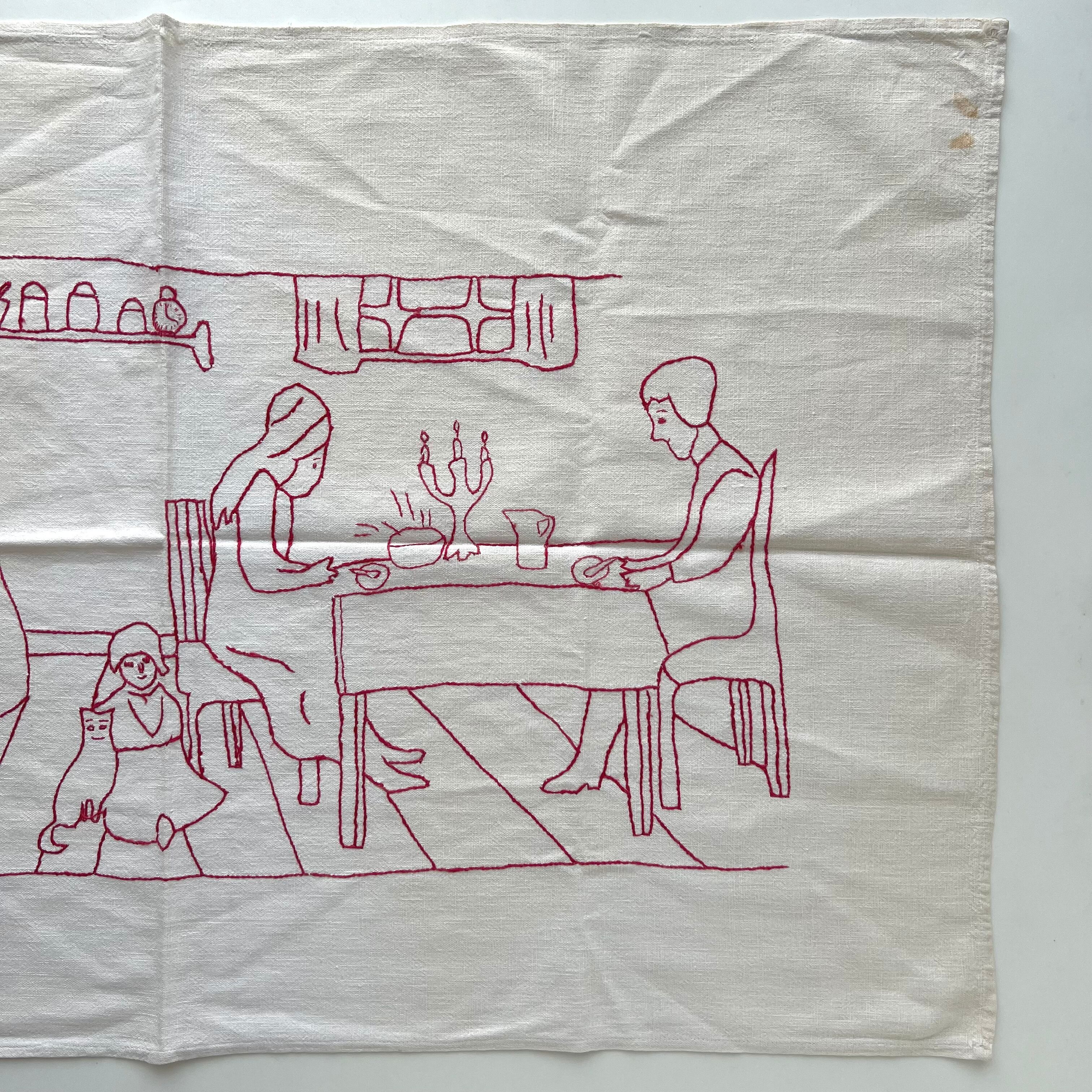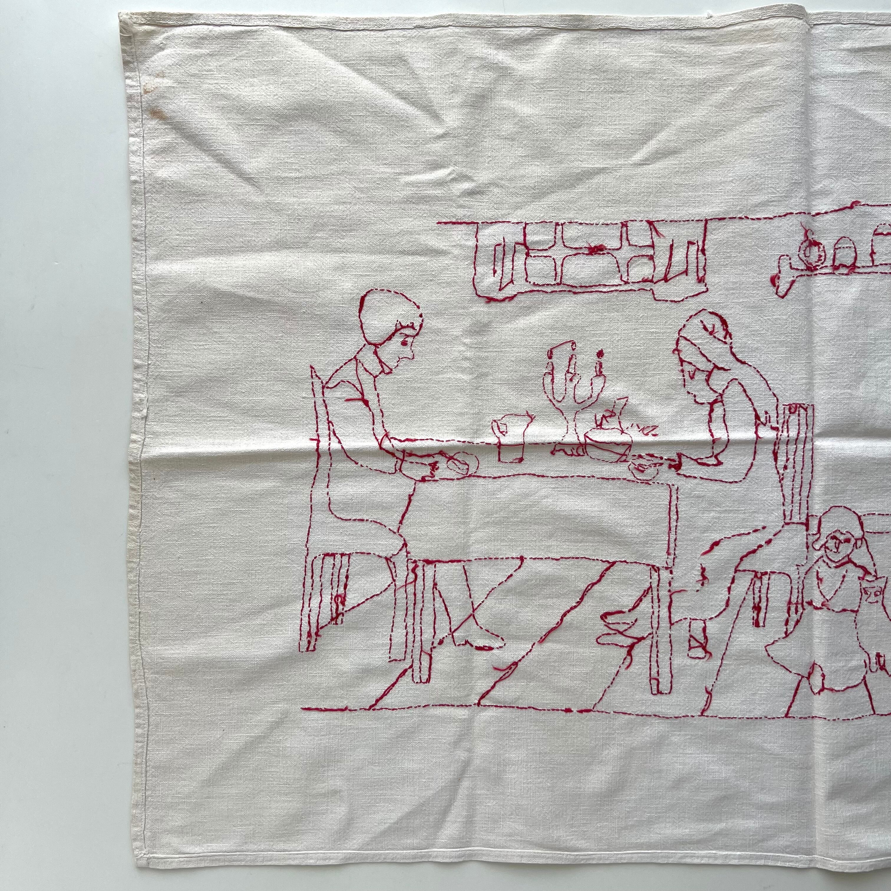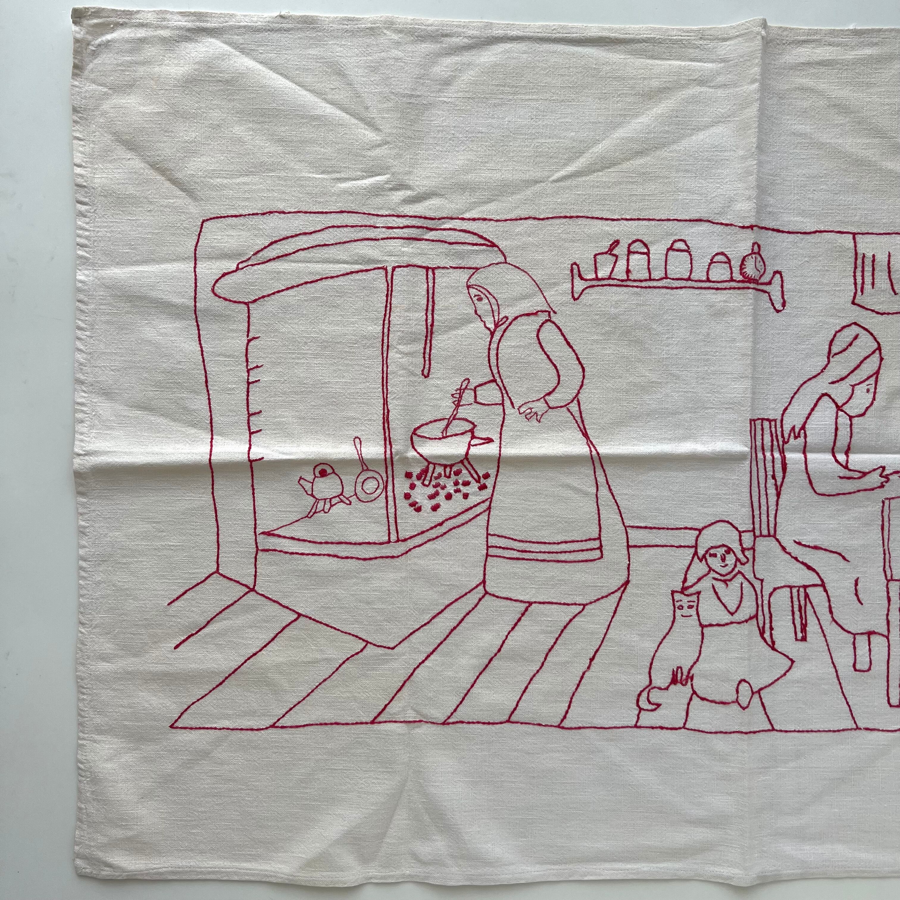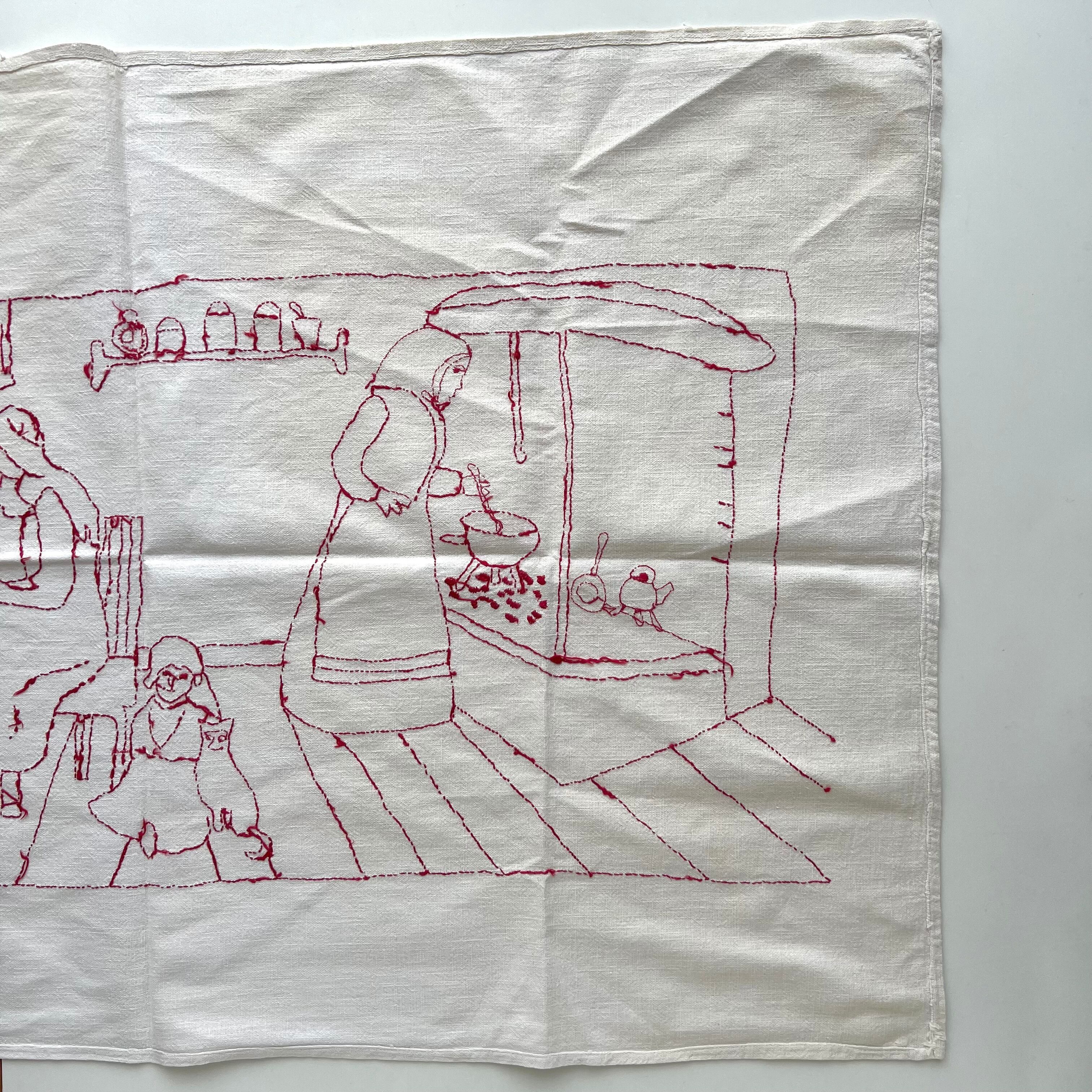 1800年代から1900年代頃の農村の家の風景が一色の糸で表現されています。