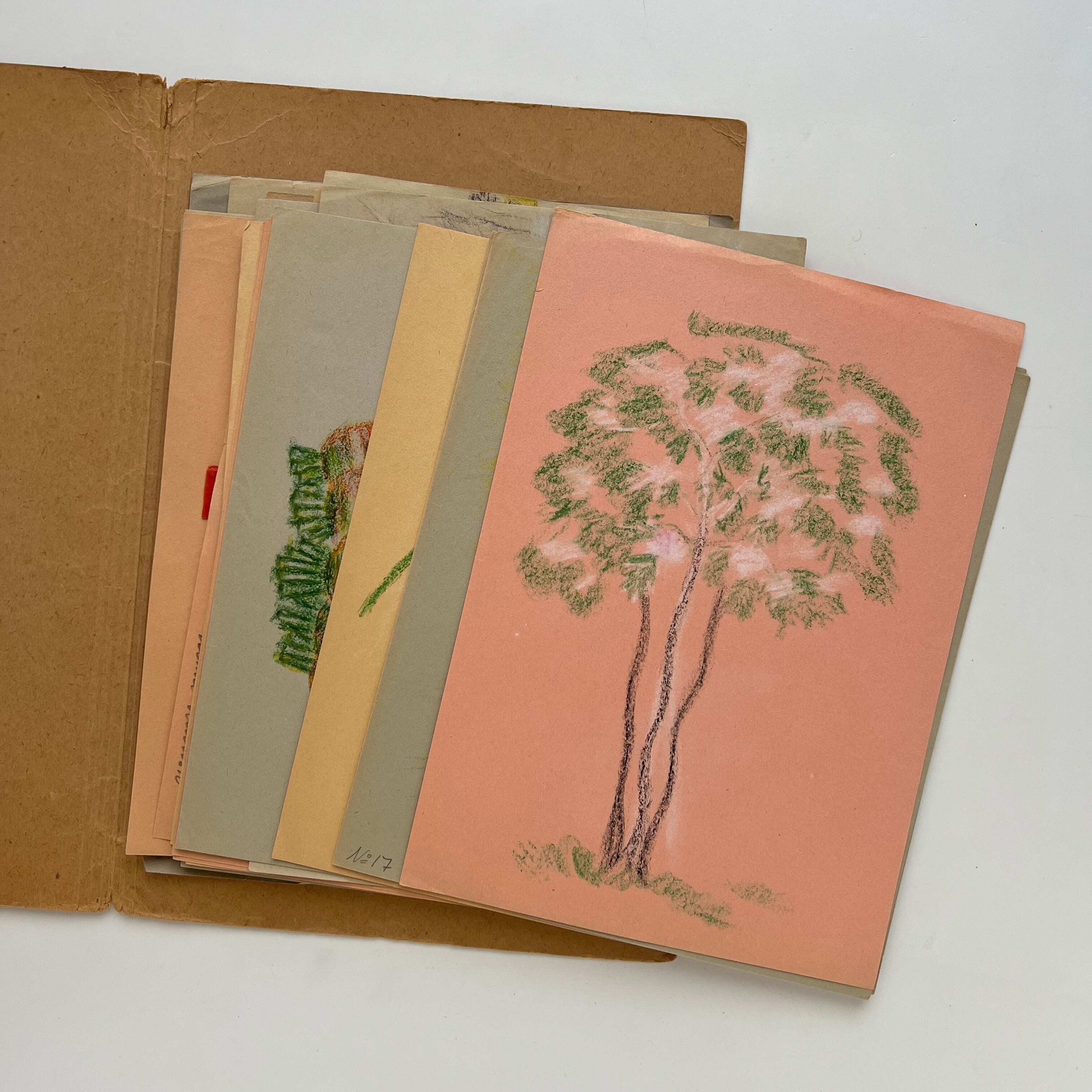パステル画を中心に、切り絵や折り紙など多彩な作品が一冊のフォルダーにまとめられています。個人制作のポートフォリオや美術の学習課題として作られたものと考えられます。