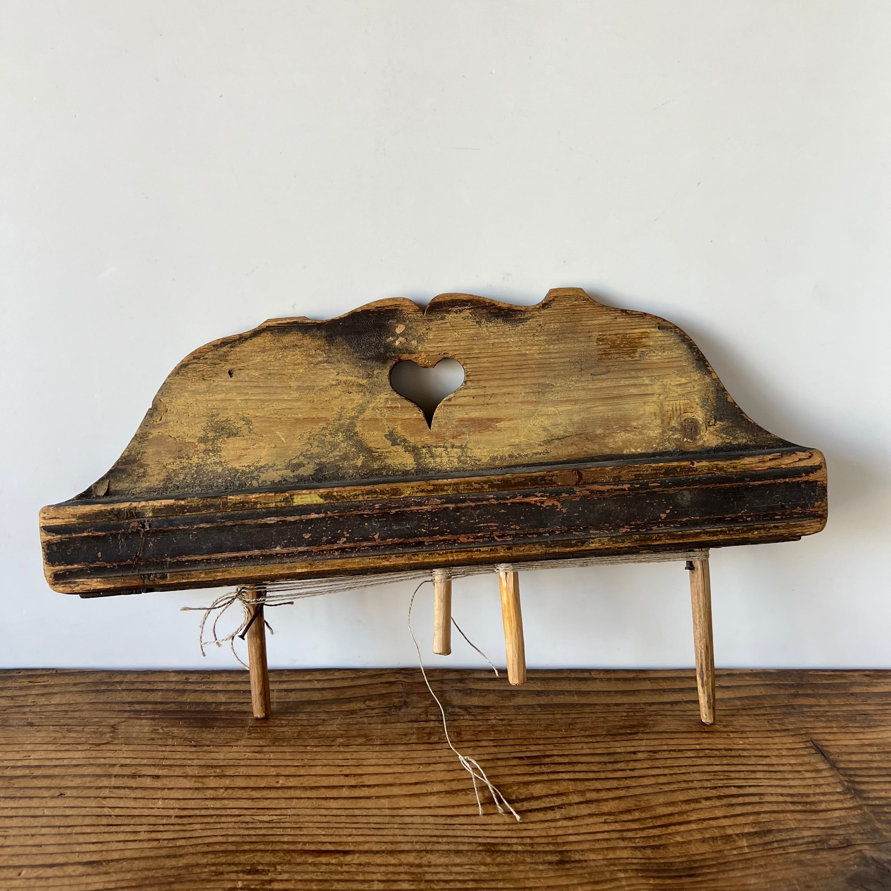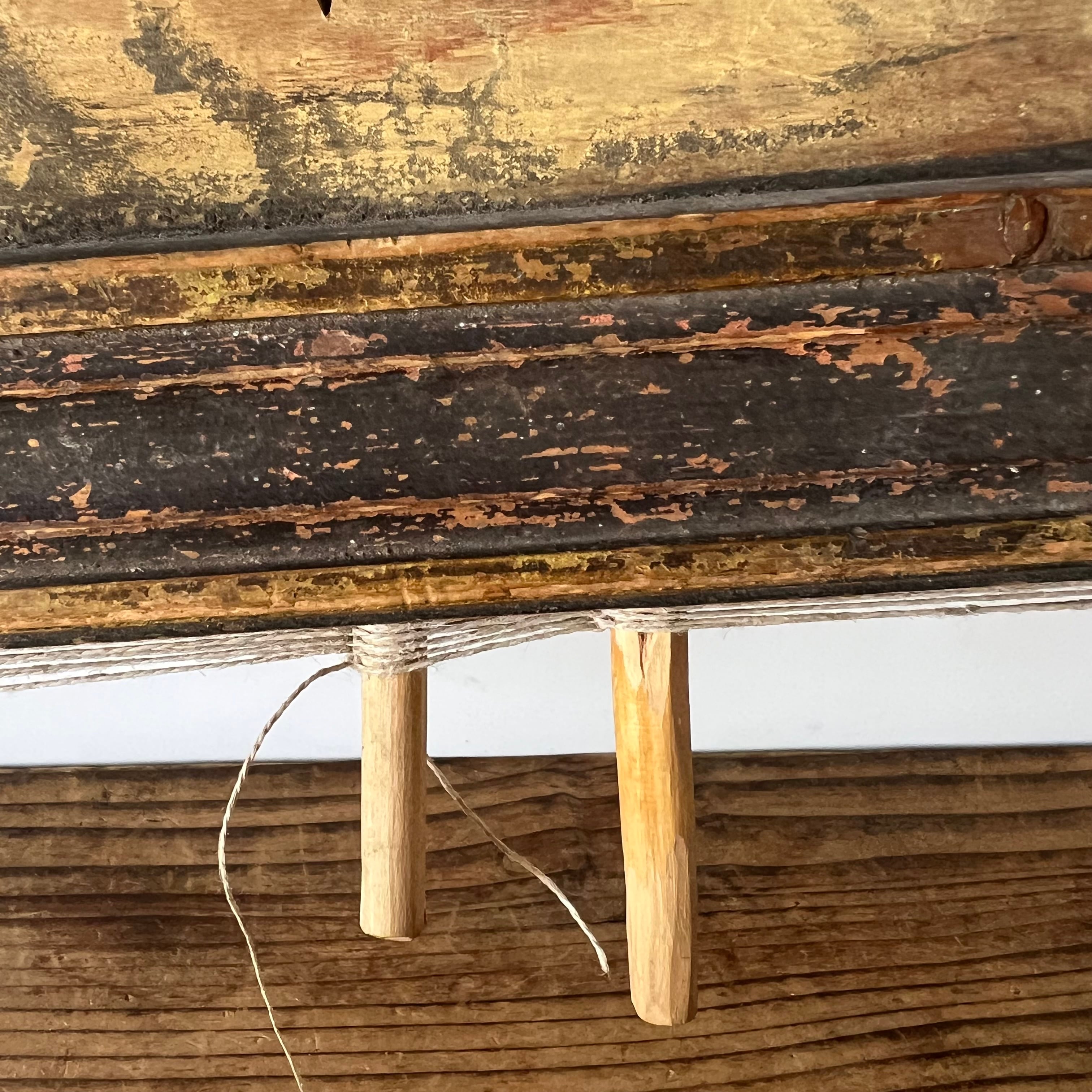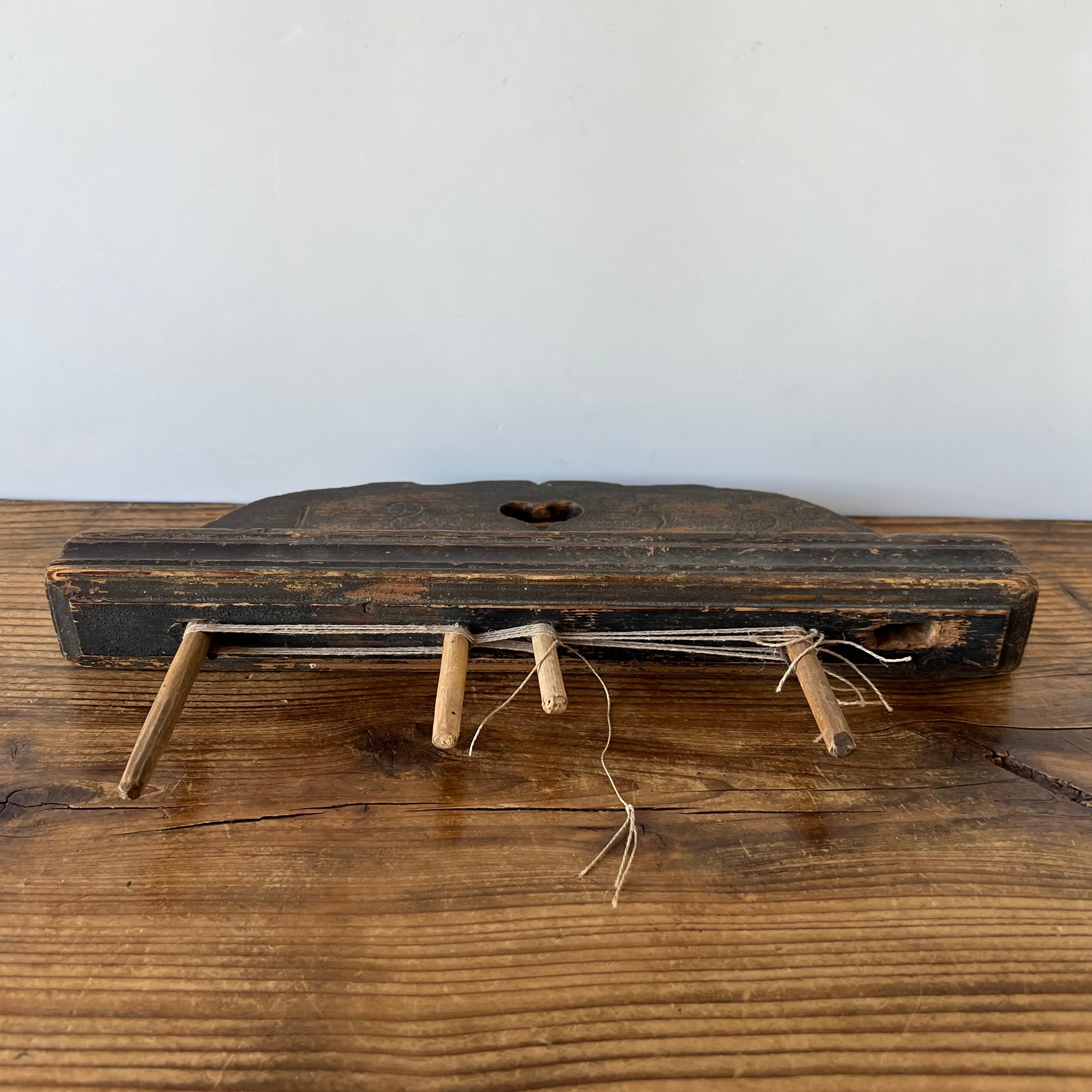 下に付いている4本の棒は家具から外された後に取り付けられ、誰かが糸巻きのように使っていたのかと思います。