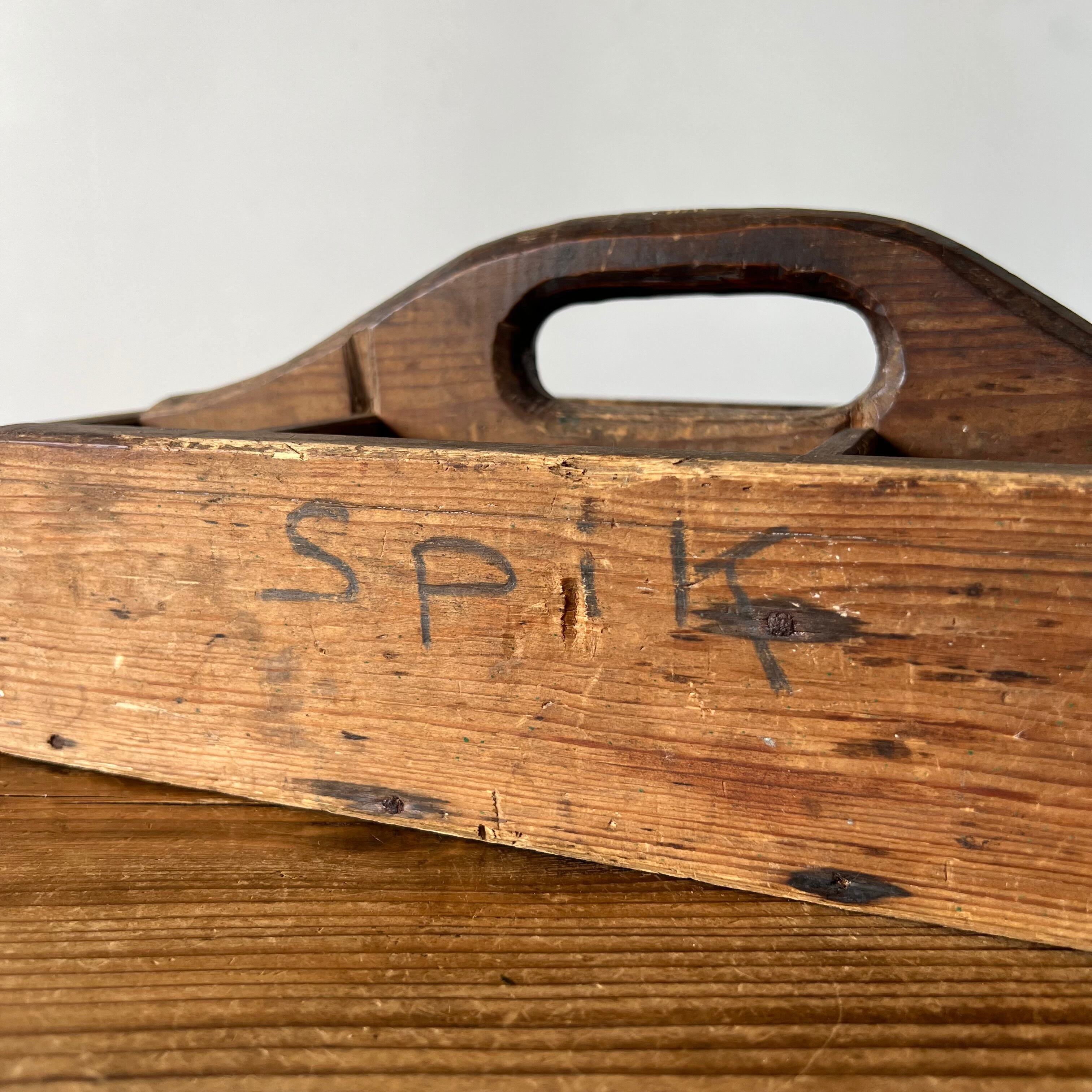 側面には手書きで「SPIK」(スウェーデン語で「釘」)と記されており、当時は釘や金具などを収納するために使われていたことが分かります。