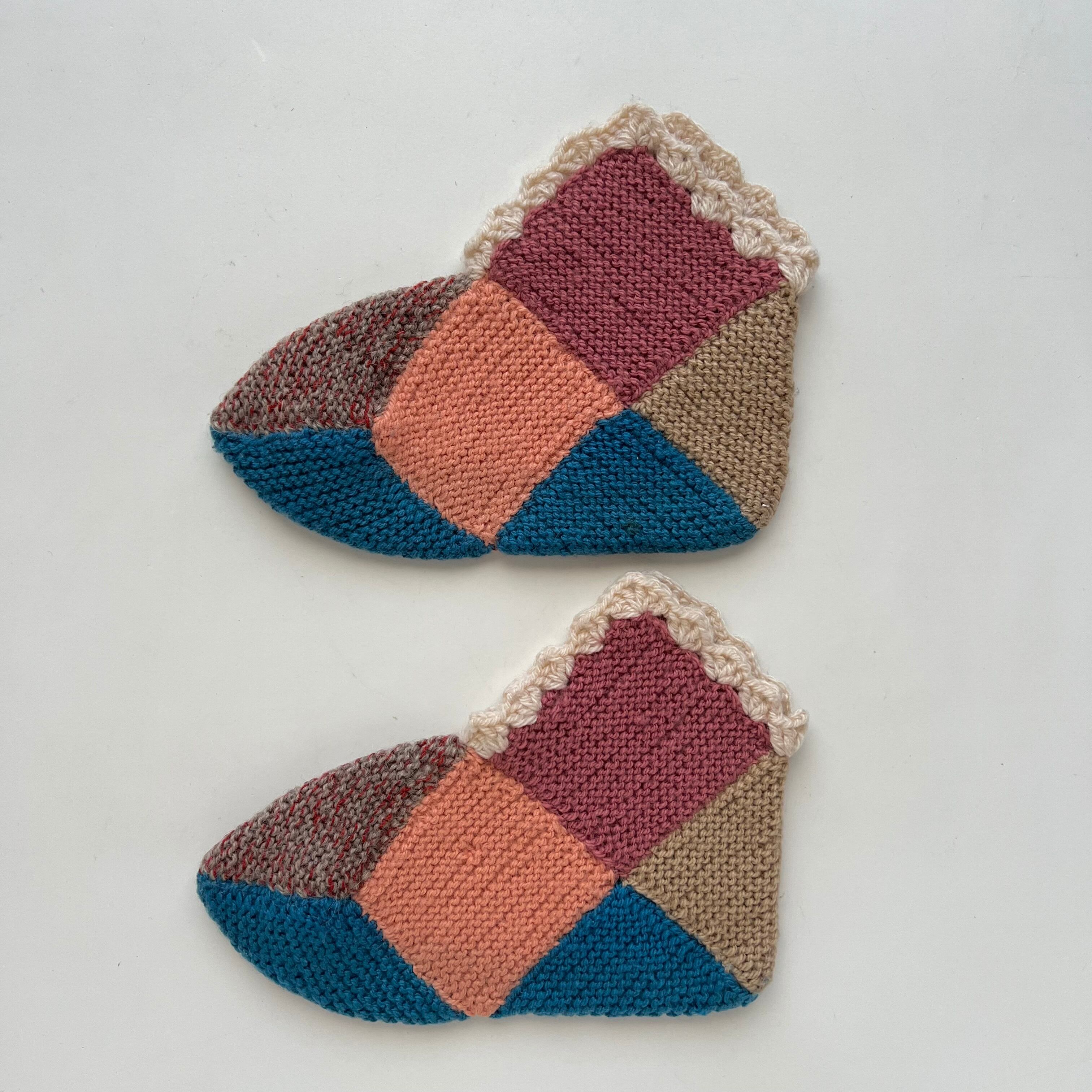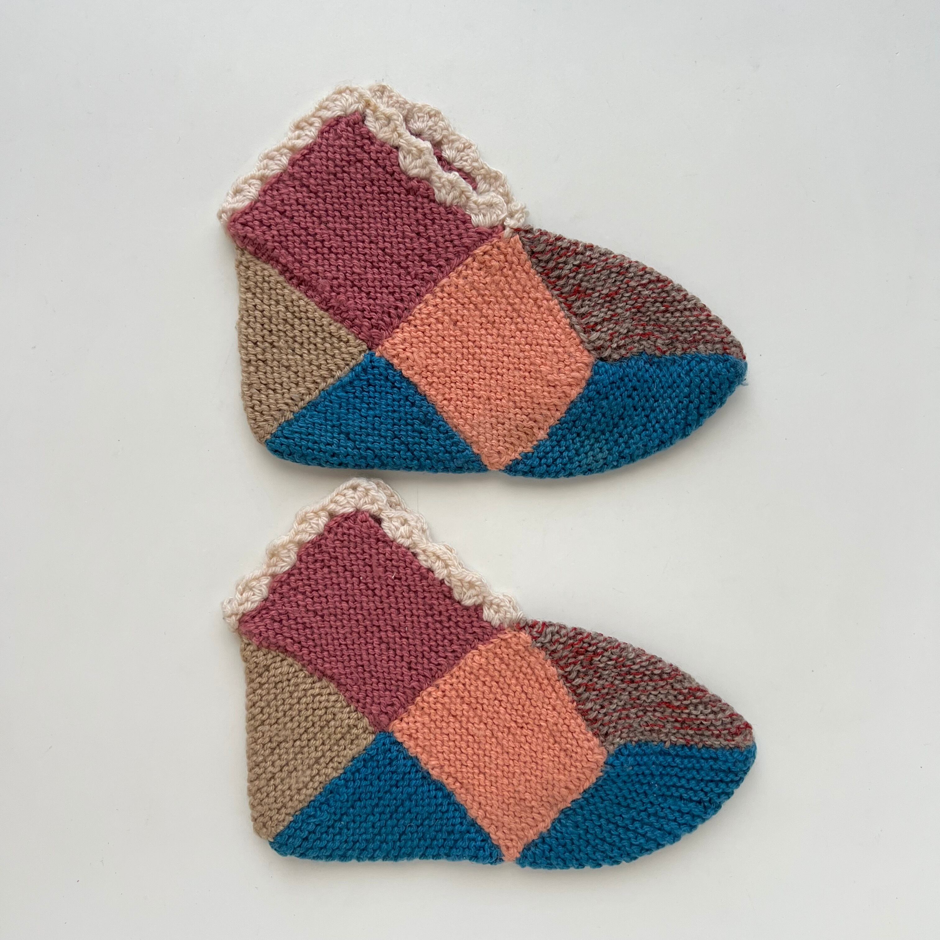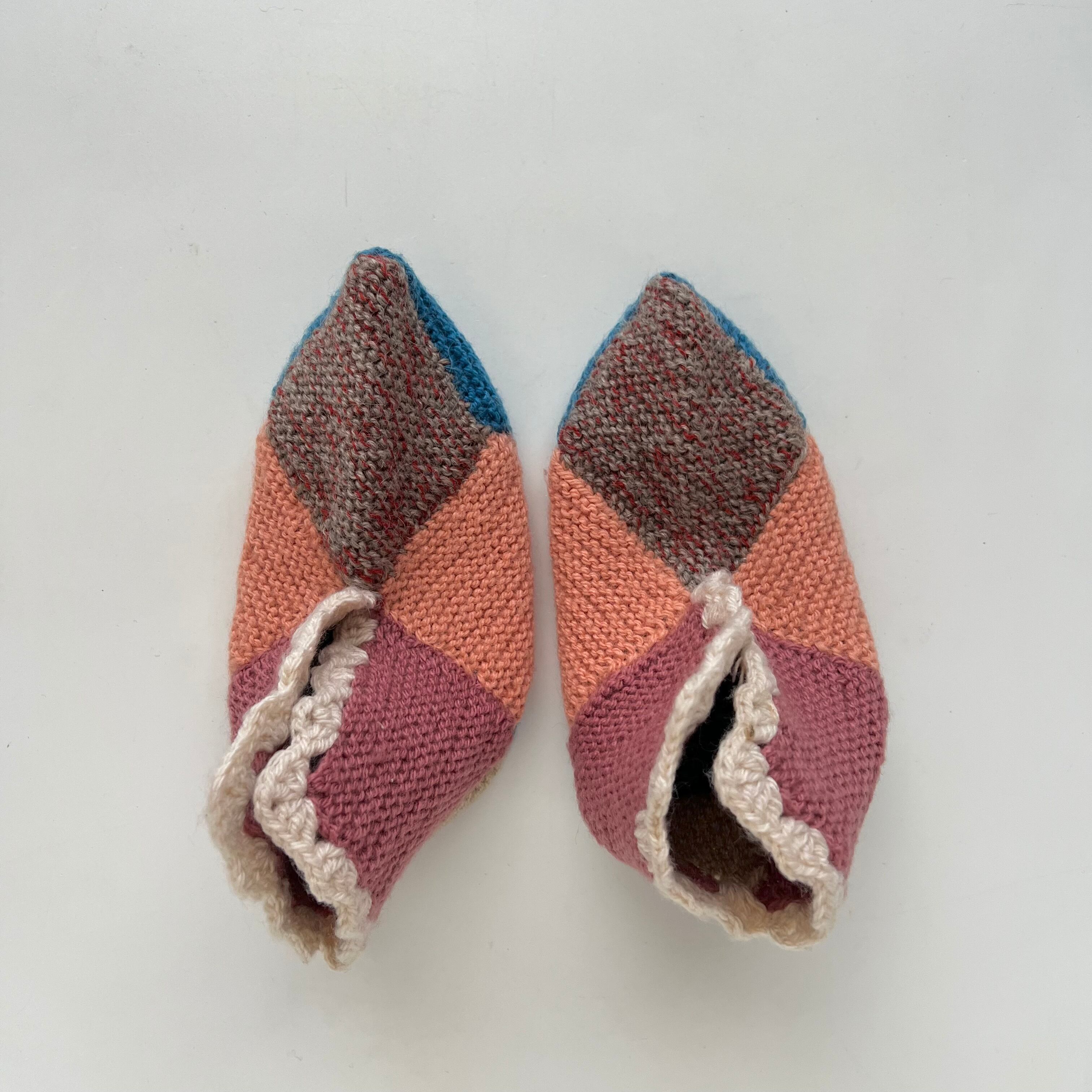 ピンクやブルー、ベージュなどの配色がとても可愛らしく、フィンランドのおばあちゃんが編んでくれたような温かみを感じる一足です。