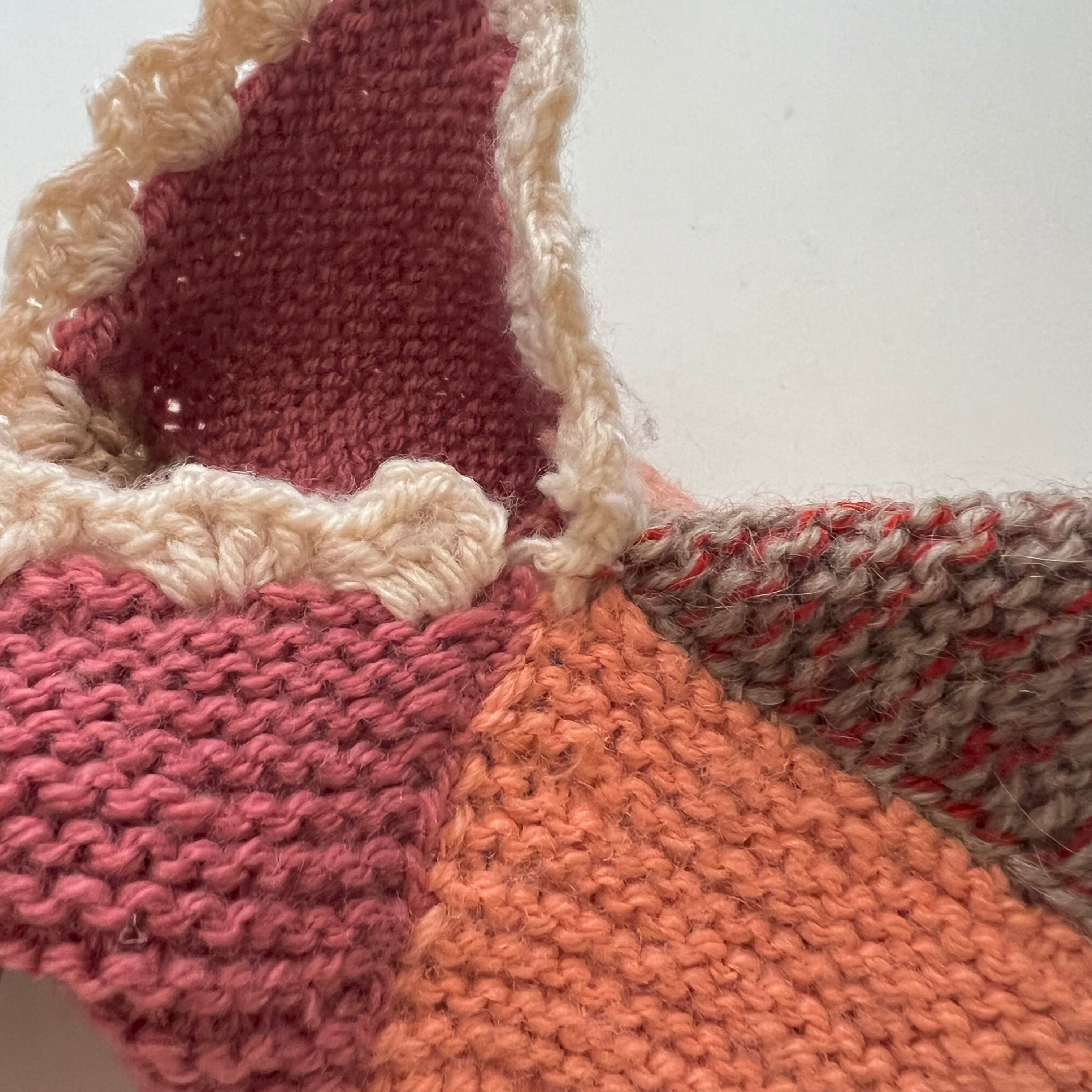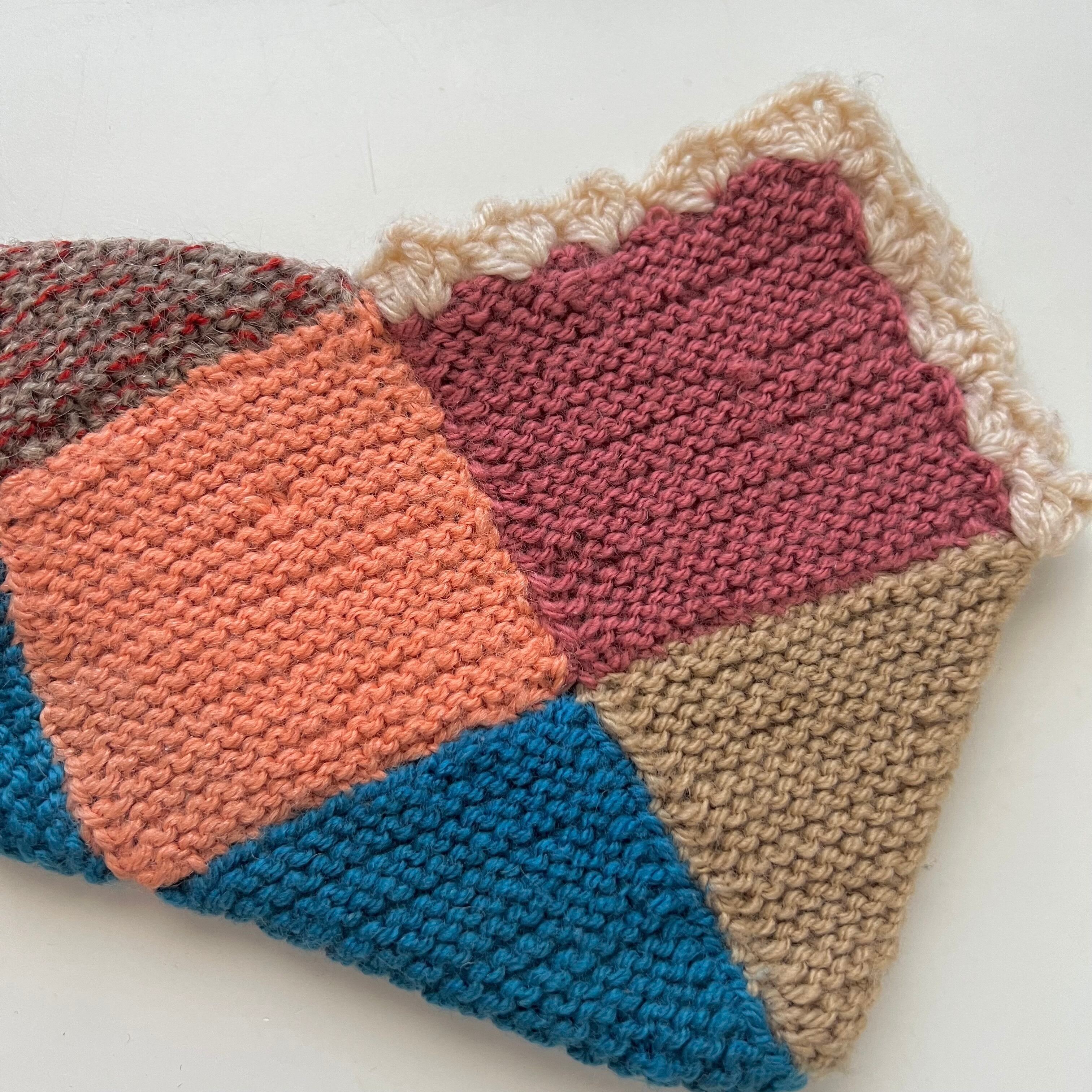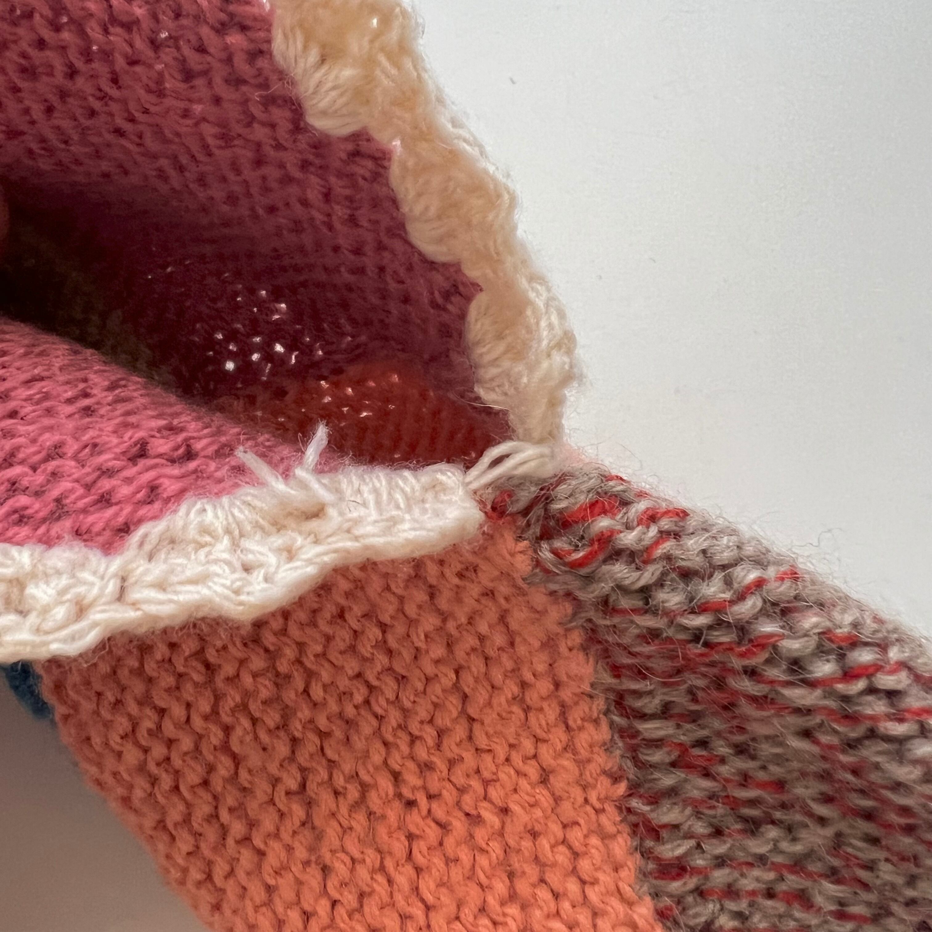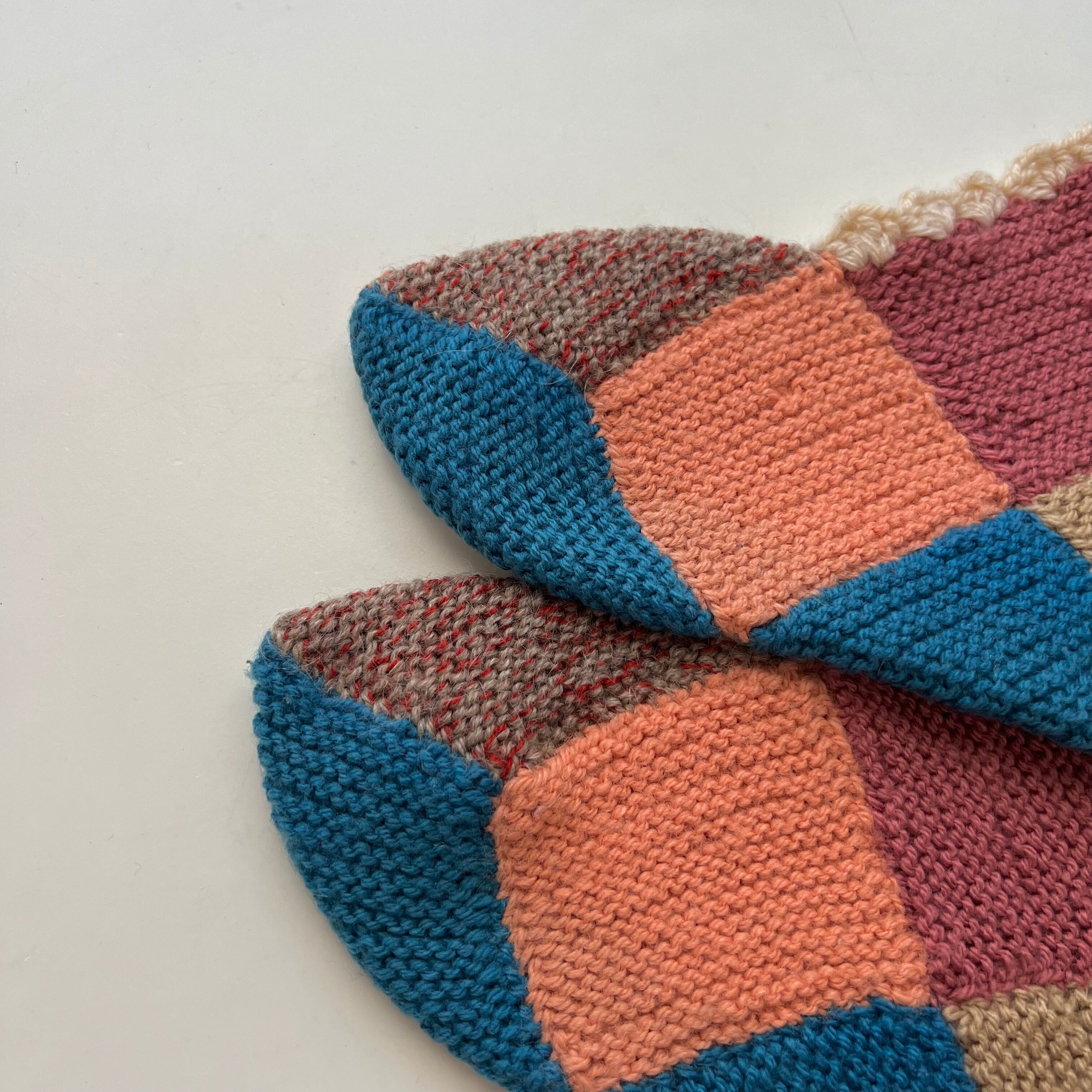ピンクやブルー、ベージュなどの配色がとても可愛らしく、フィンランドのおばあちゃんが編んでくれたような温かみを感じる一足です。