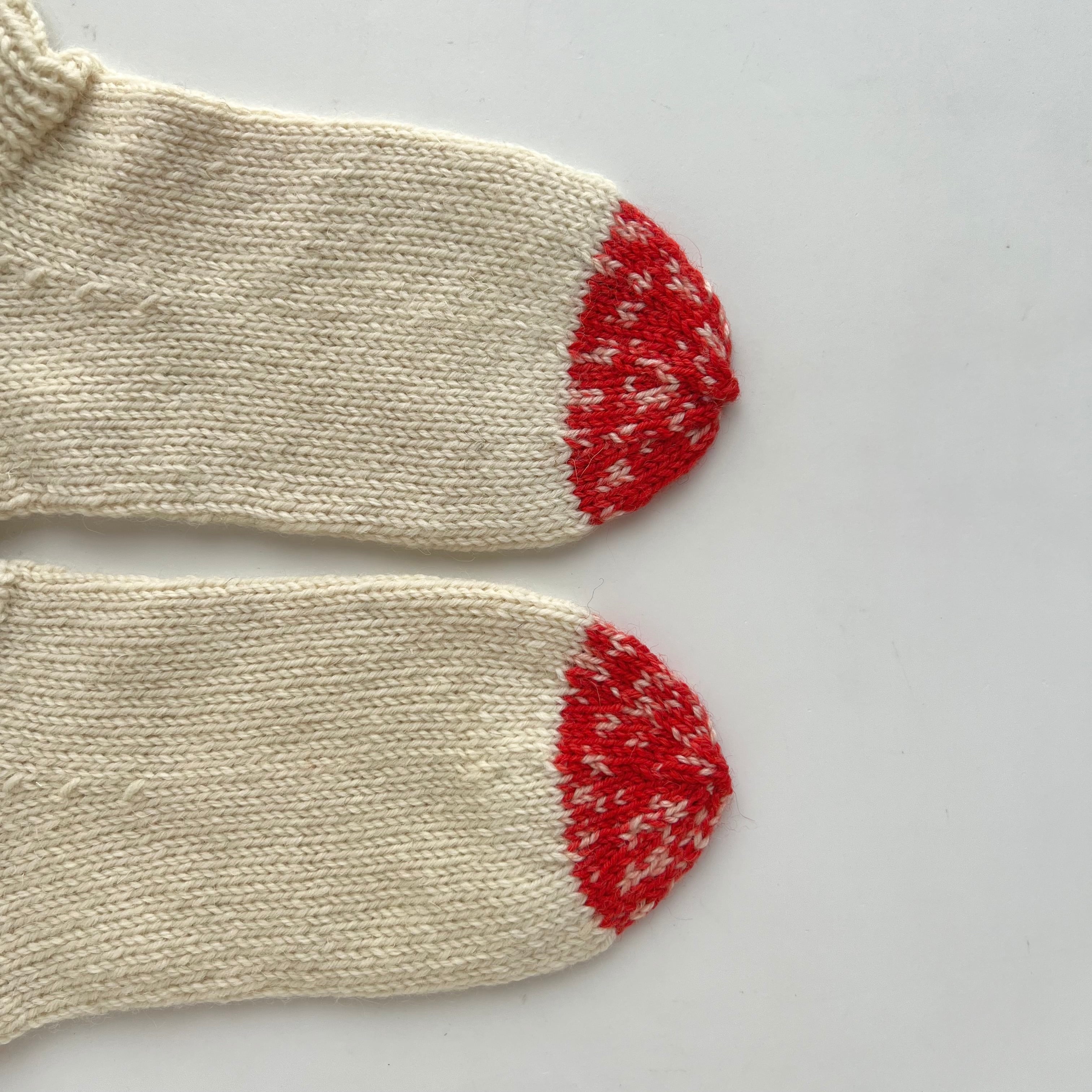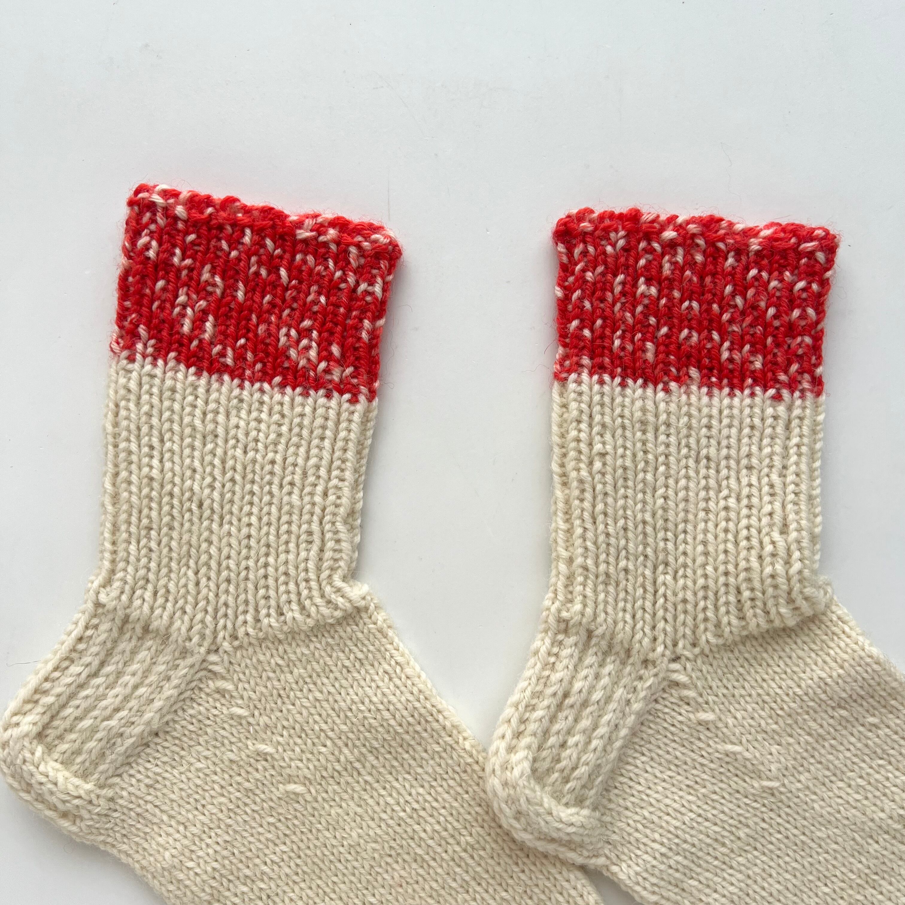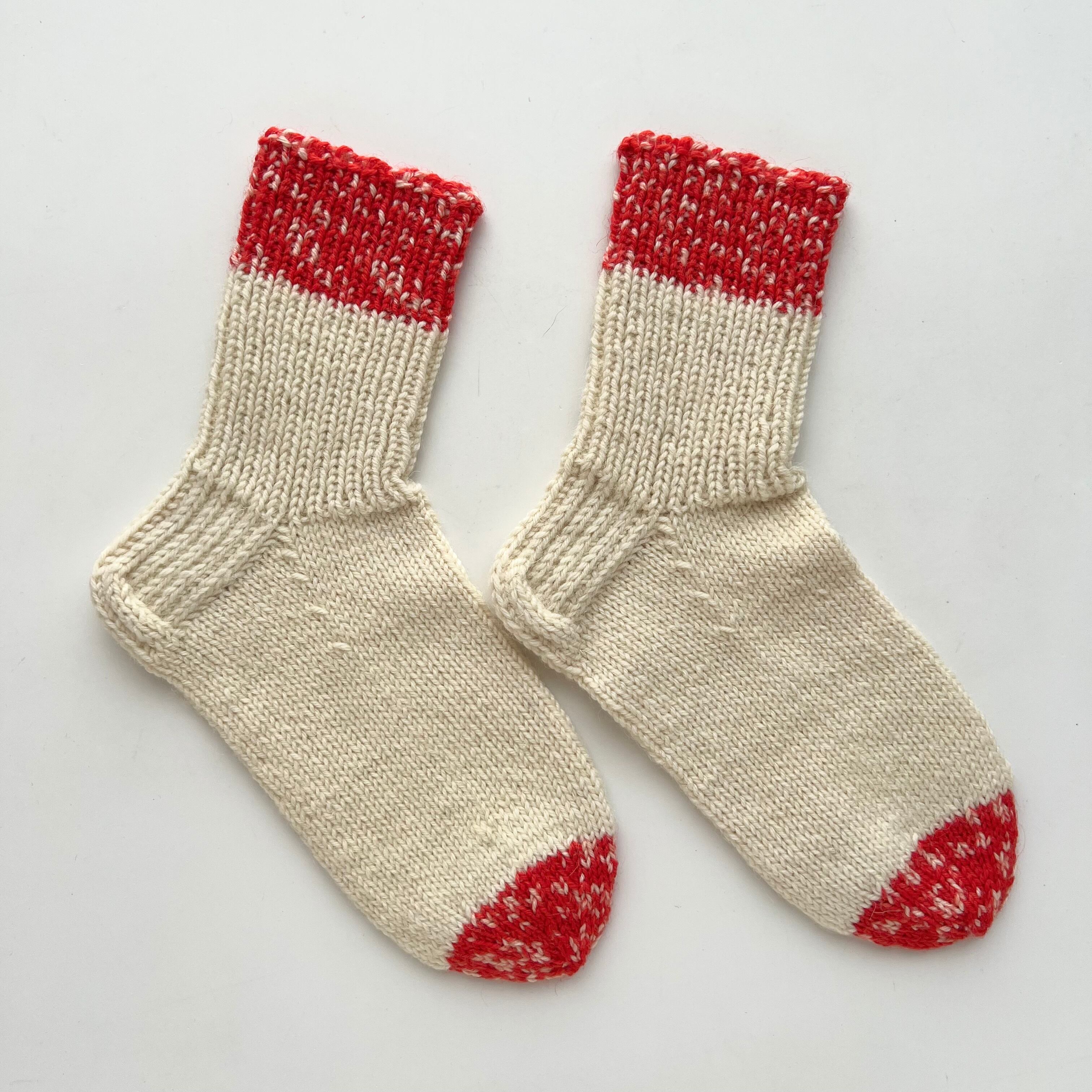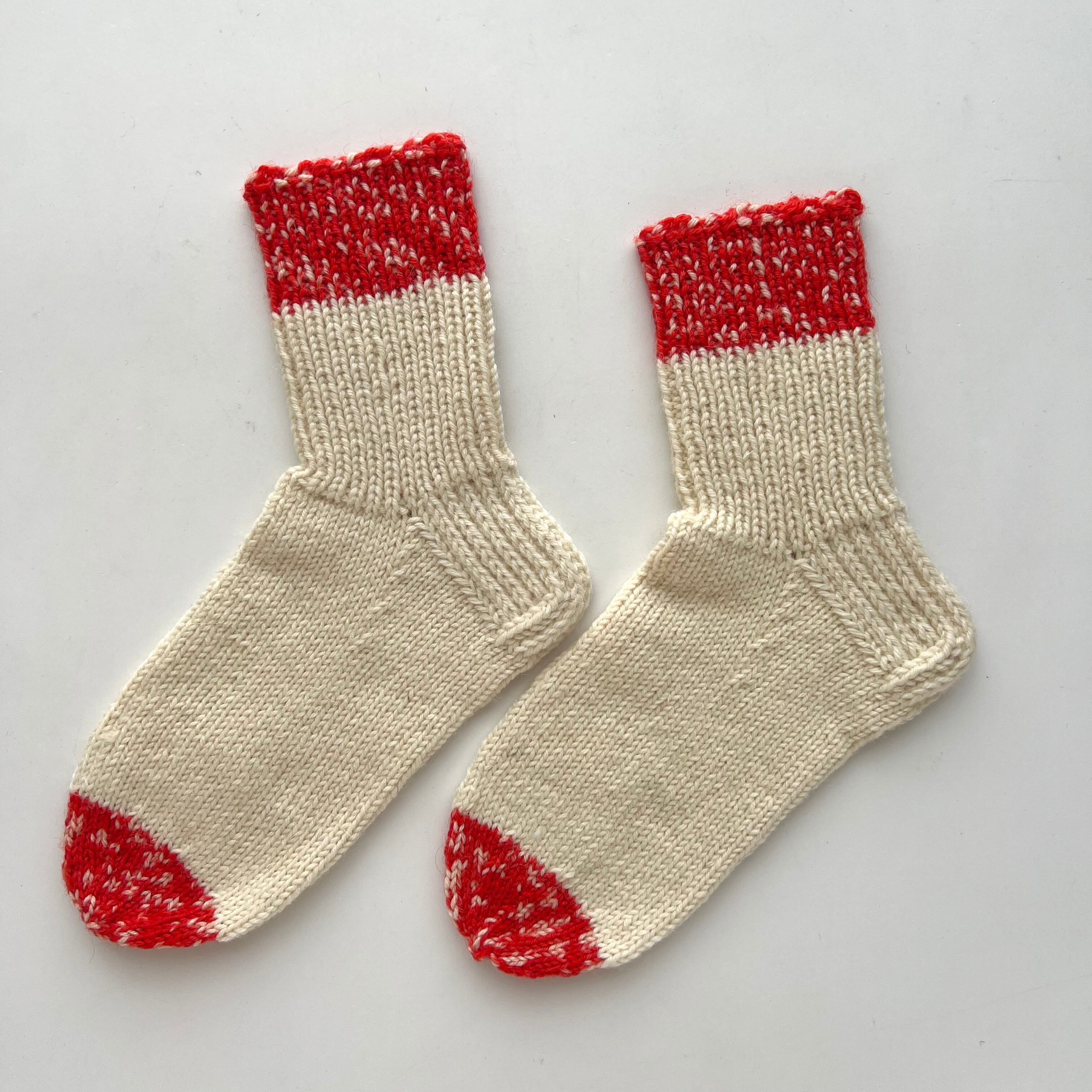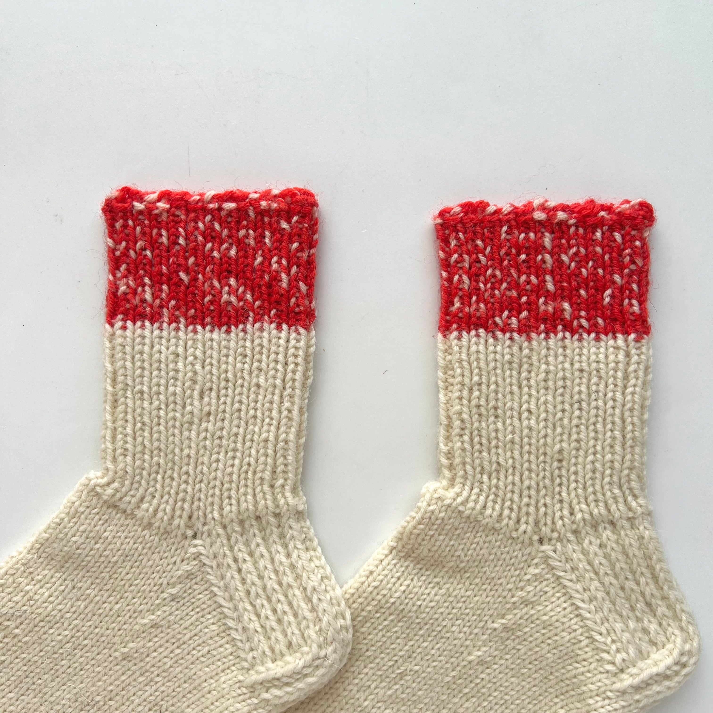赤と白のツートンカラーがアクセントになった、温かみのある一足。