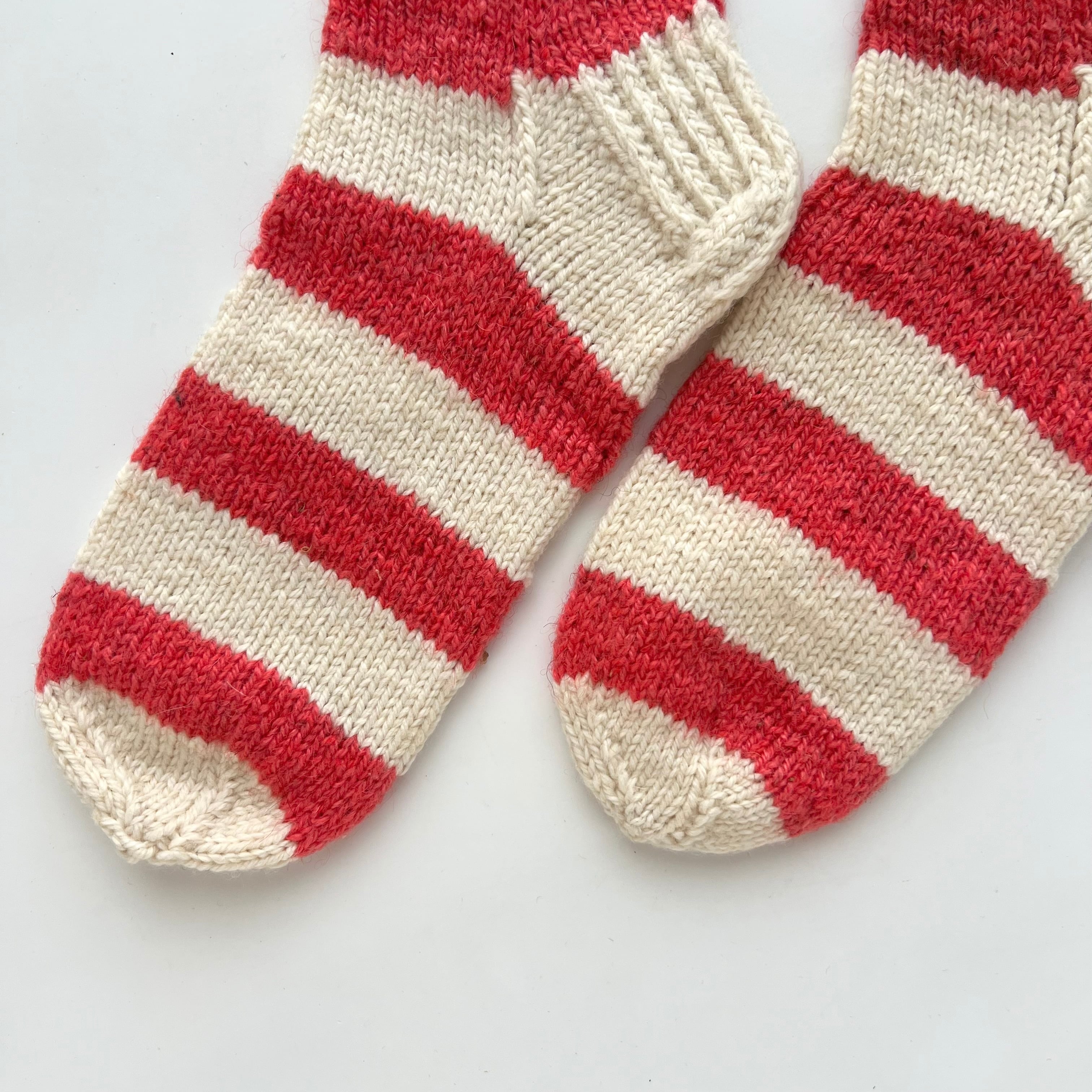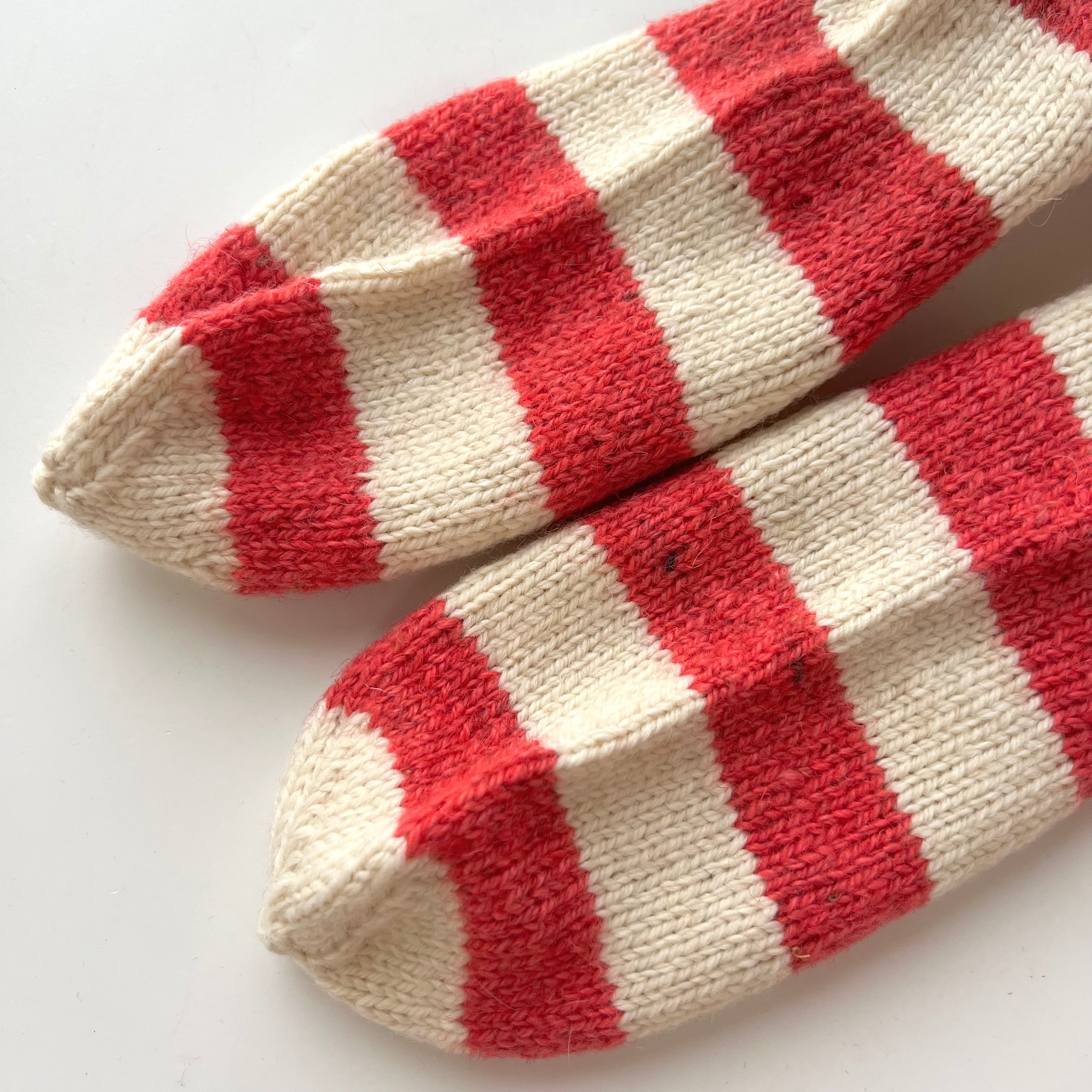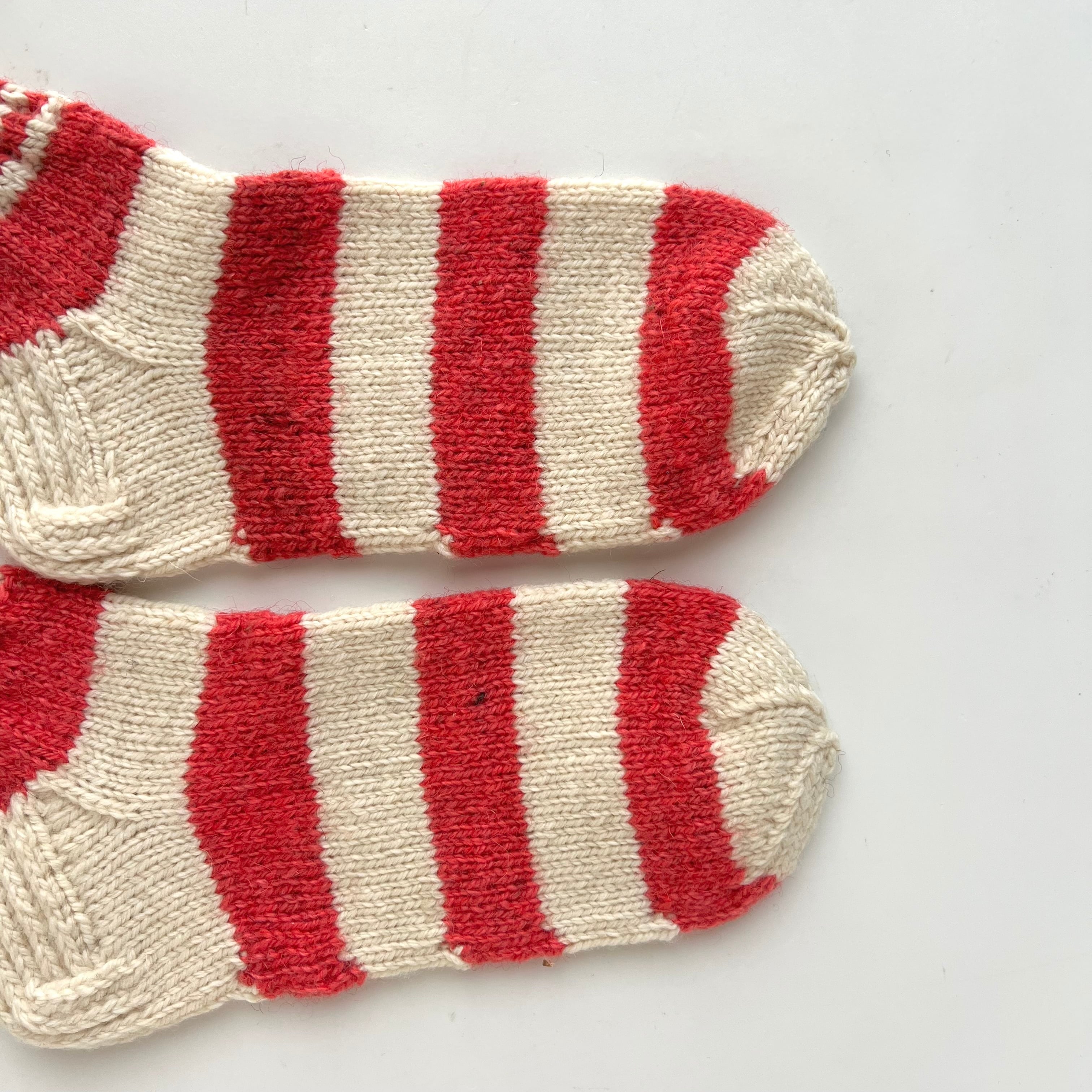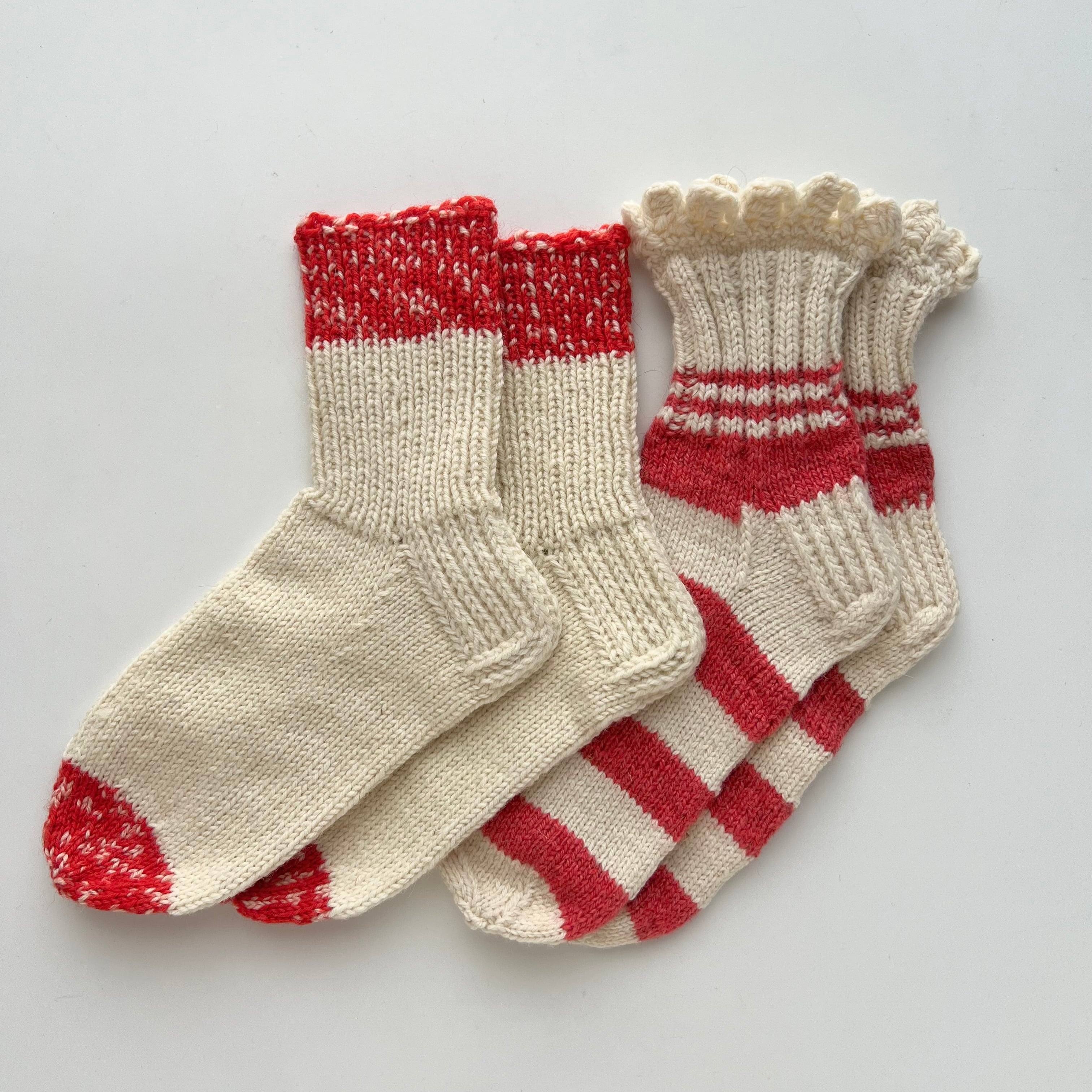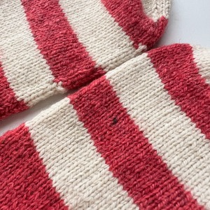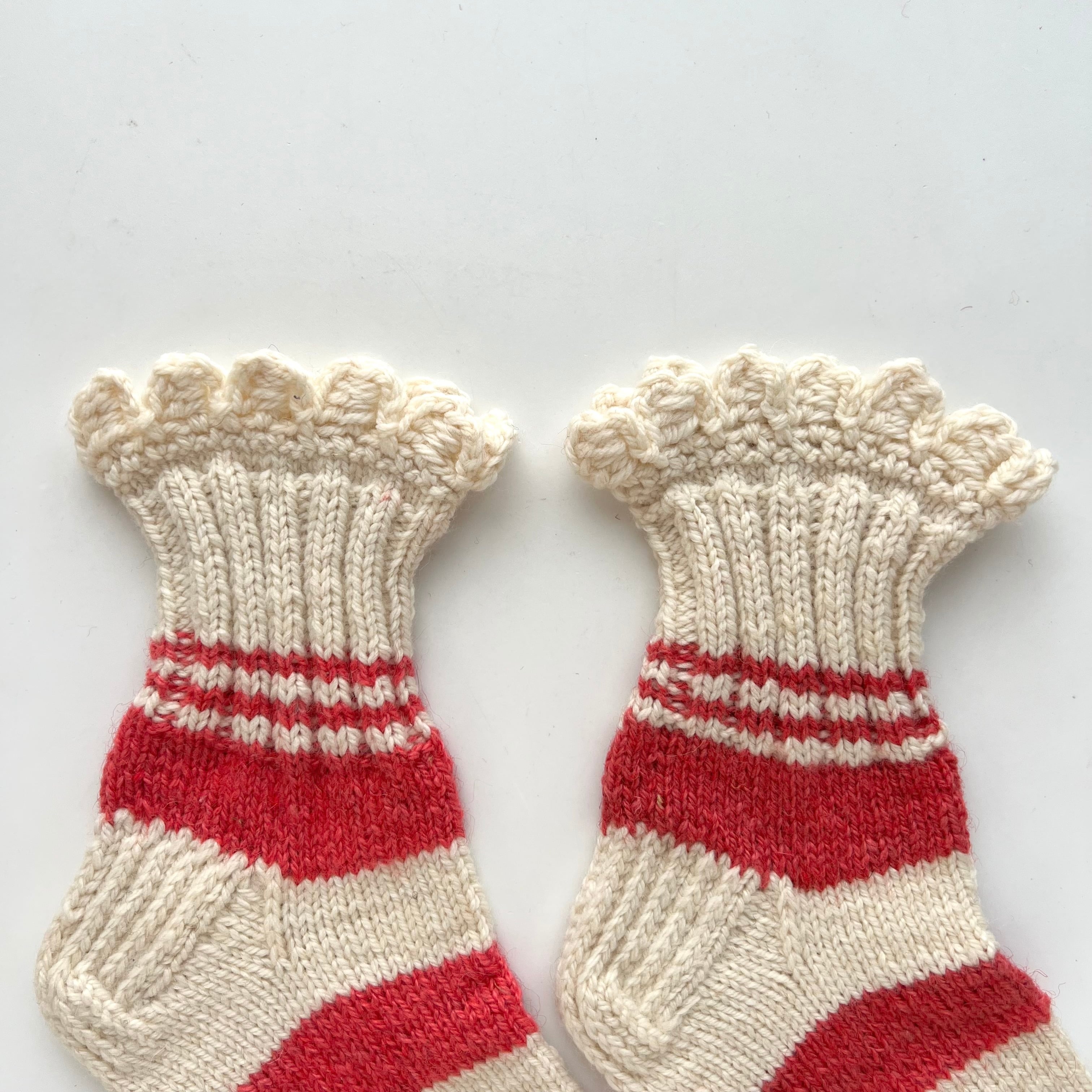 生成りと赤のボーダーが可愛らしく、履き口にはフリル編みがあしらわれています。