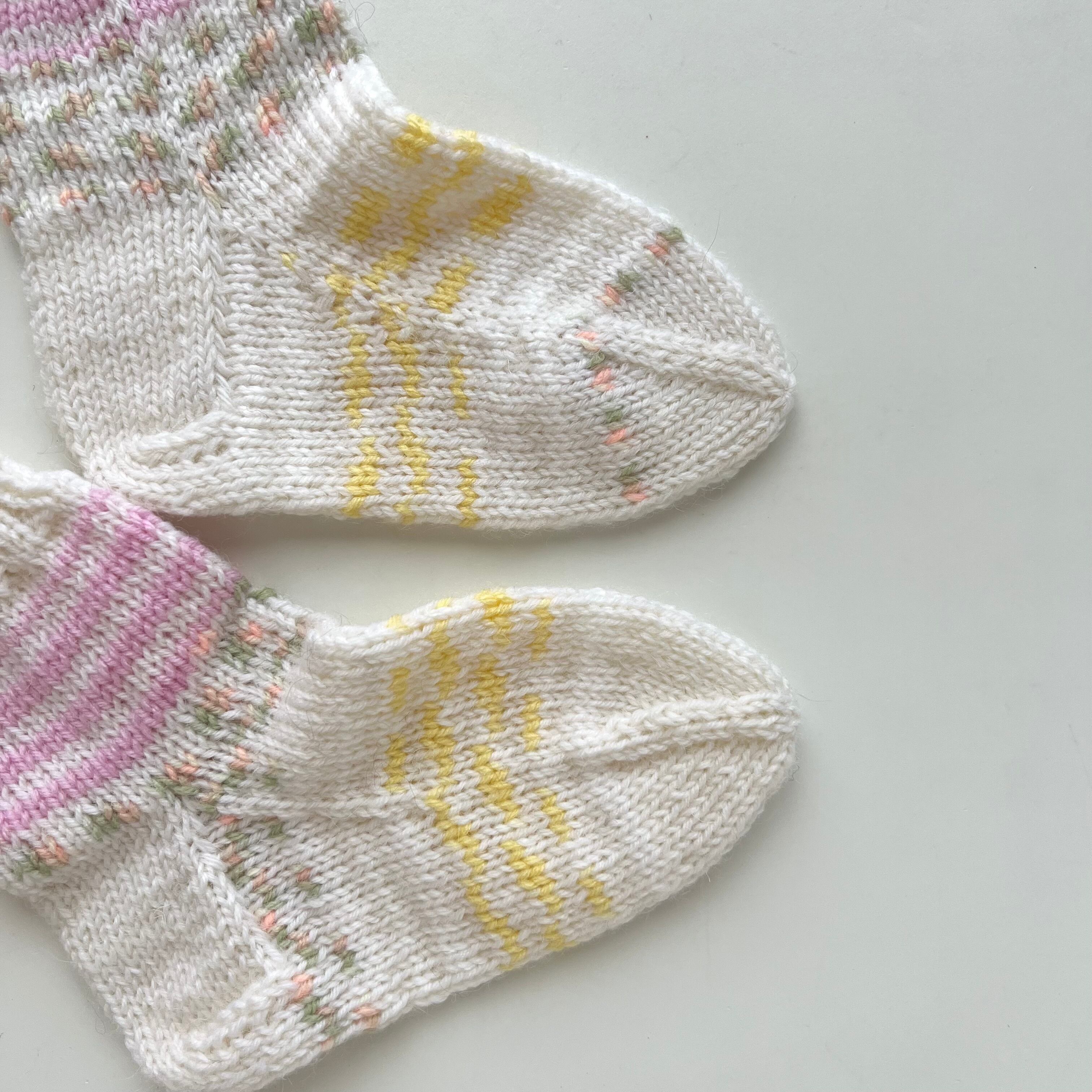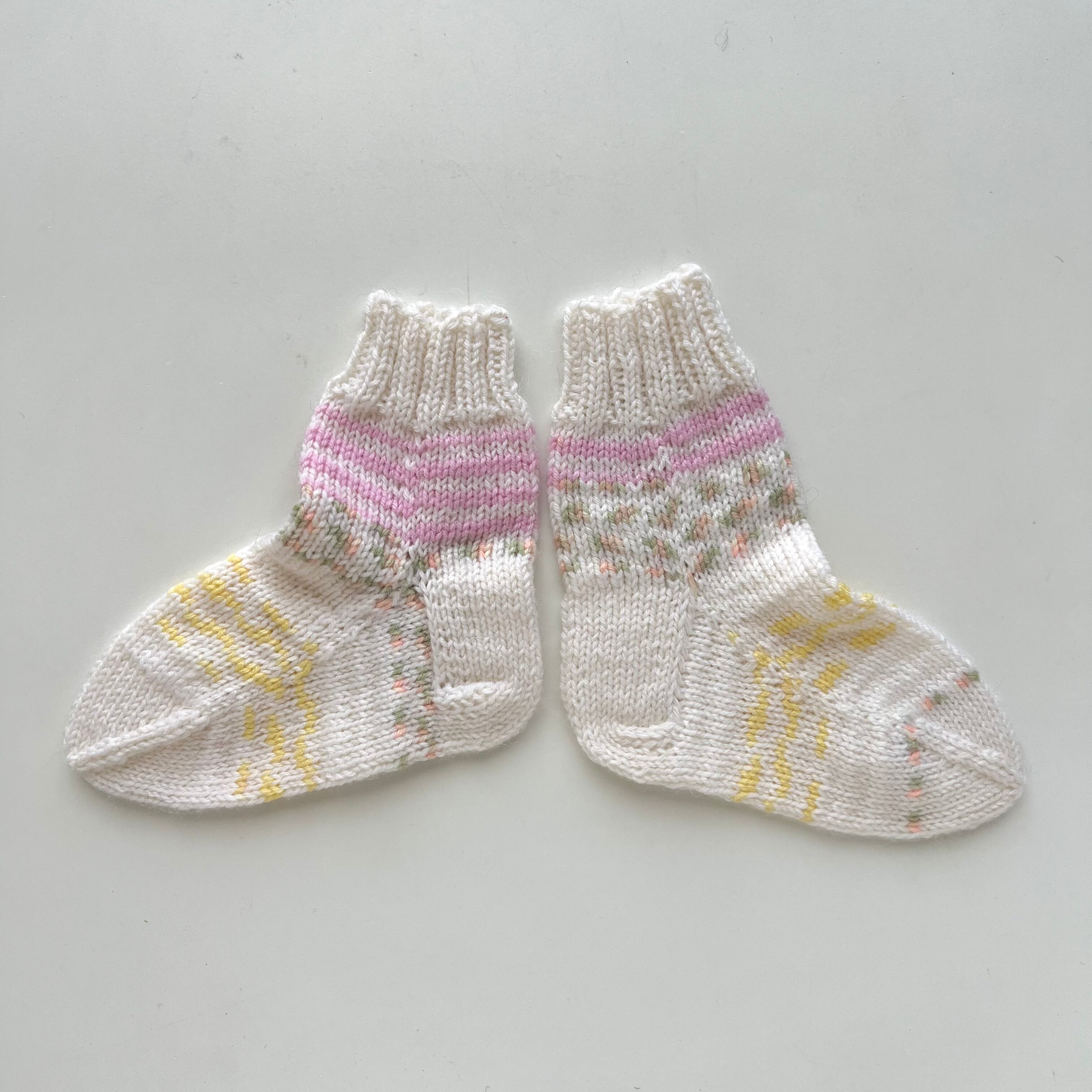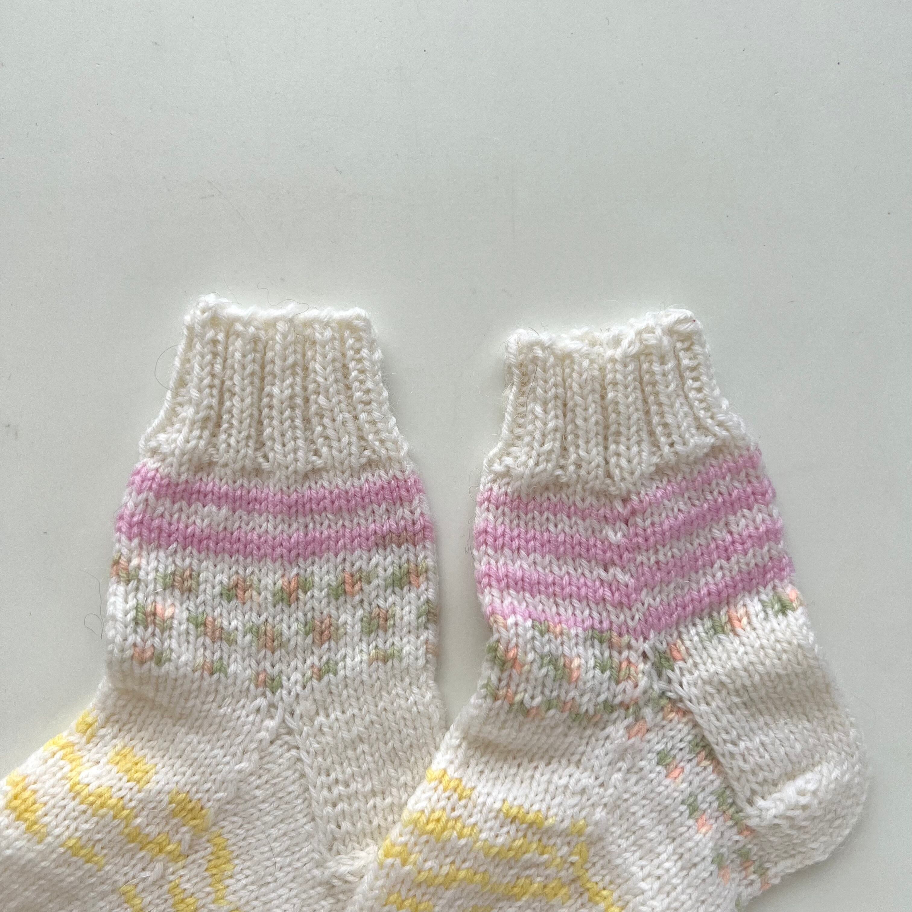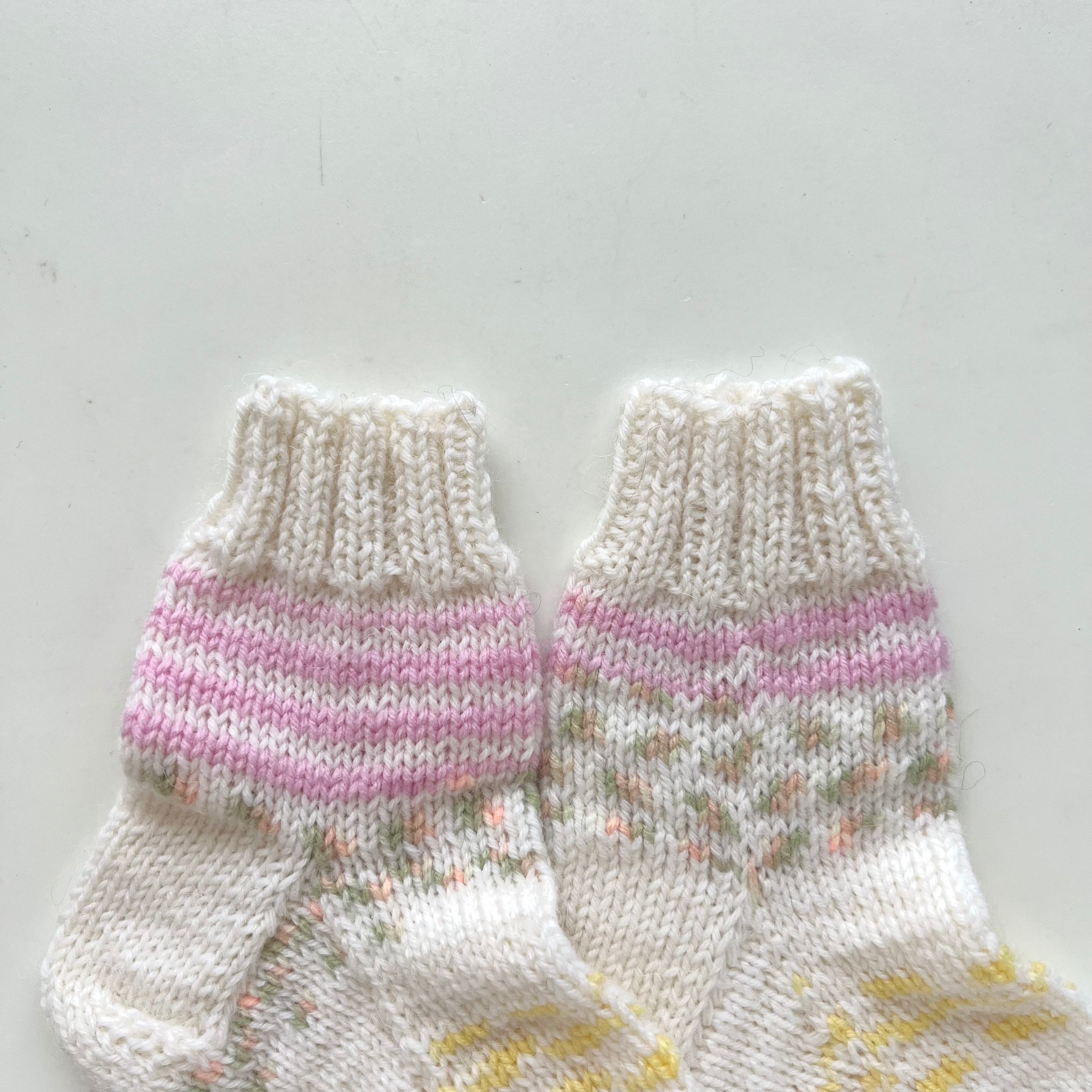 柔らかなホワイトをベースに、履き口にはピンクのライン、さらに淡いグリーンやオレンジを織り交ぜた模様編みが施された、凝ったデザイン。左右で少しずつ異なる表情を楽しめるのも魅力のひとつ。