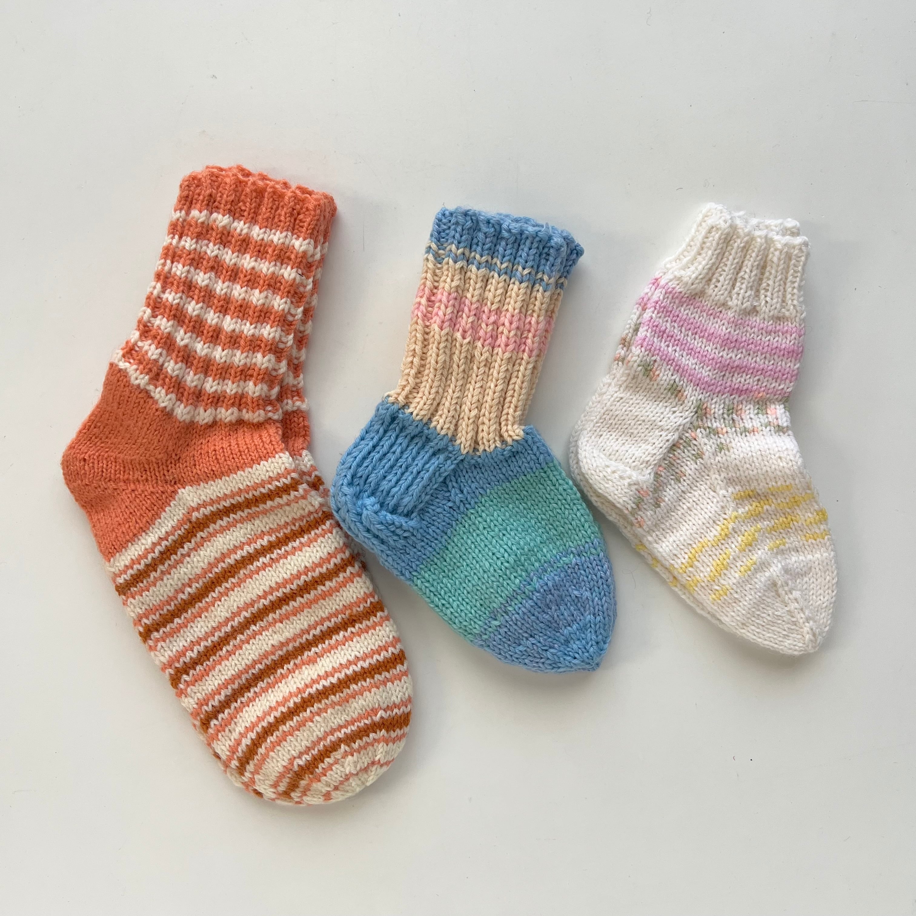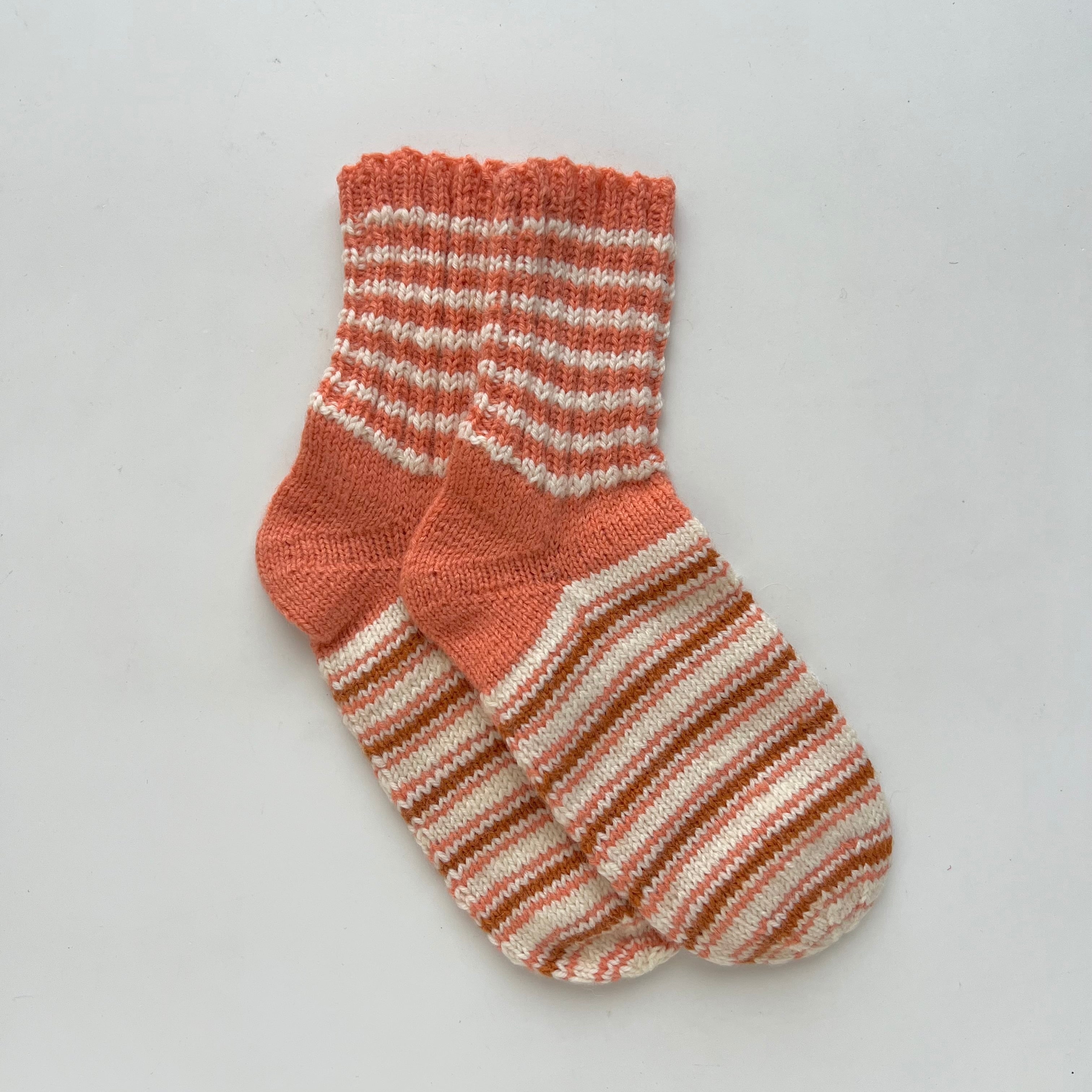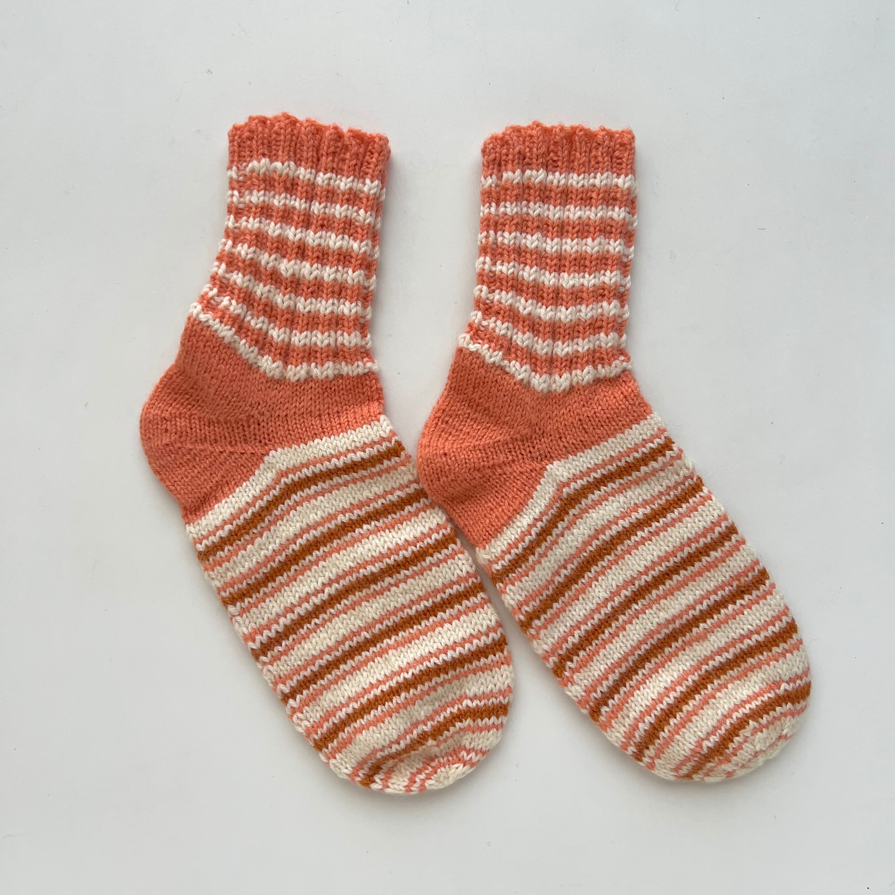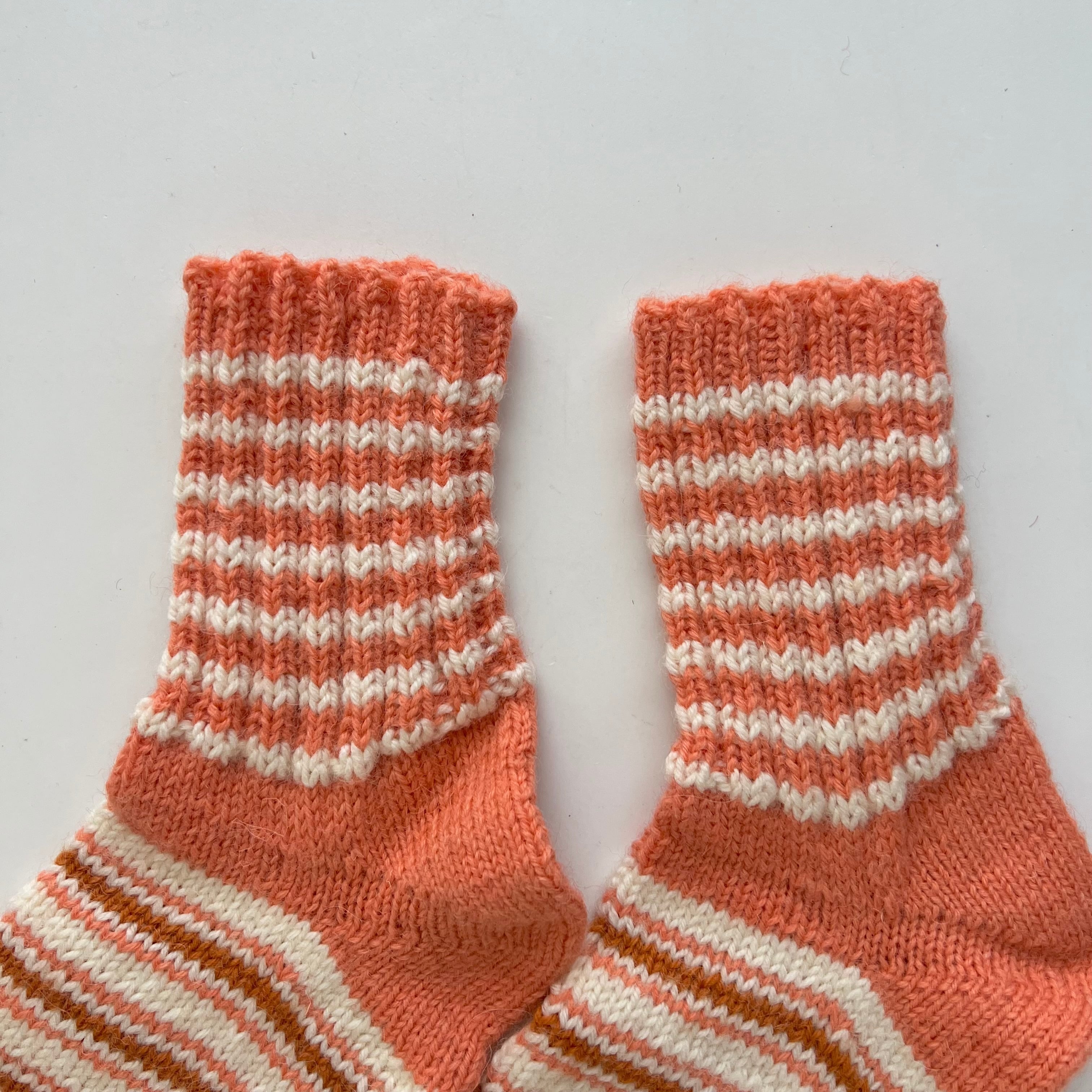 サーモンピンクよりのオレンジ×濃いオレンジ×ホワイトのマルチボーダーがかわいい一足。
