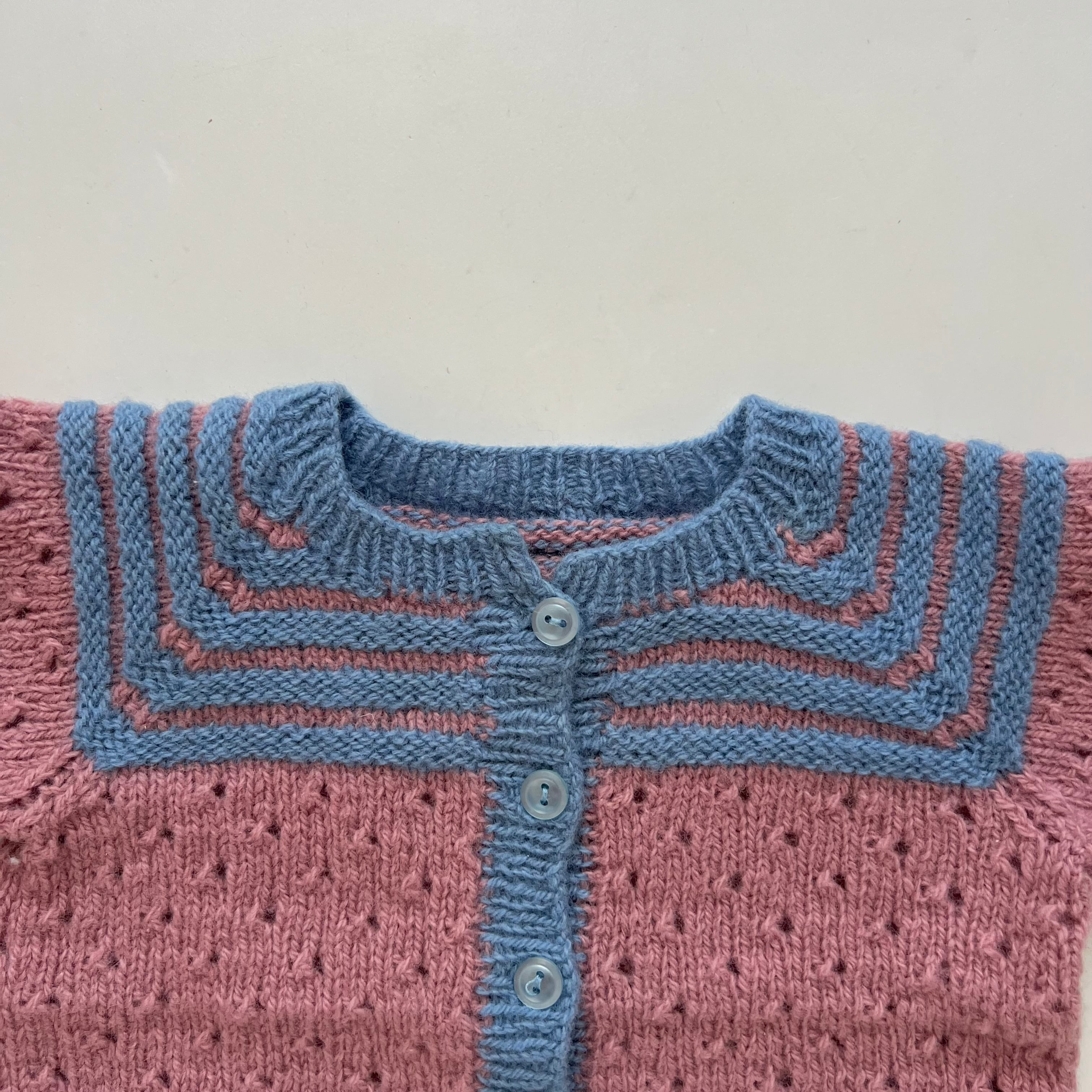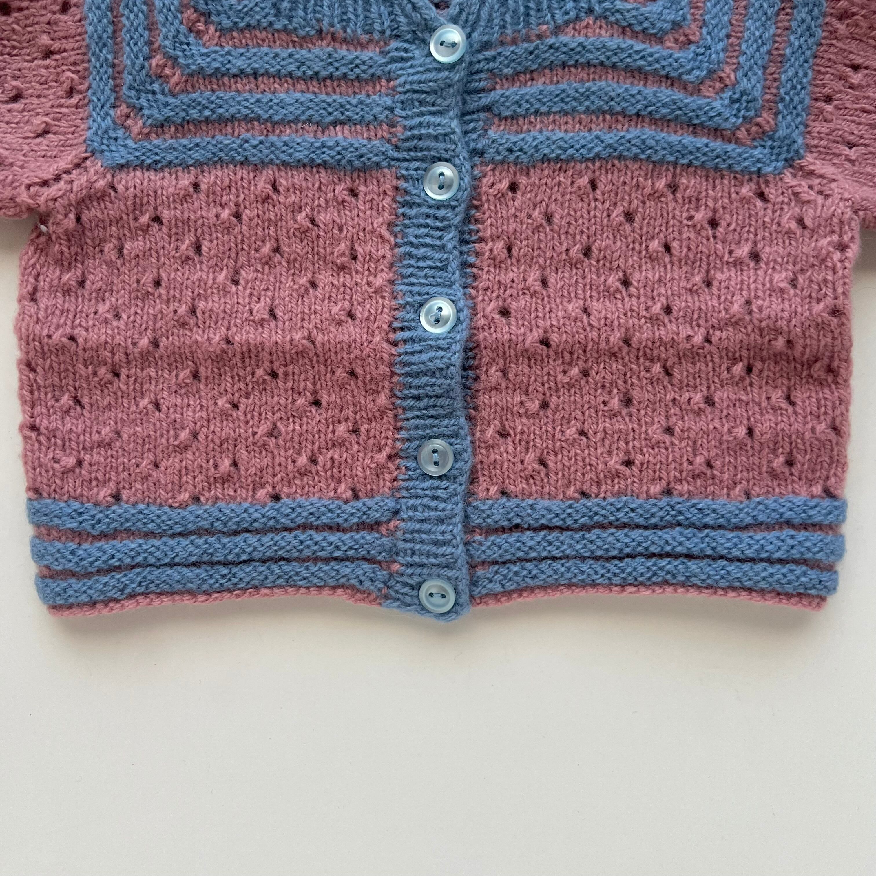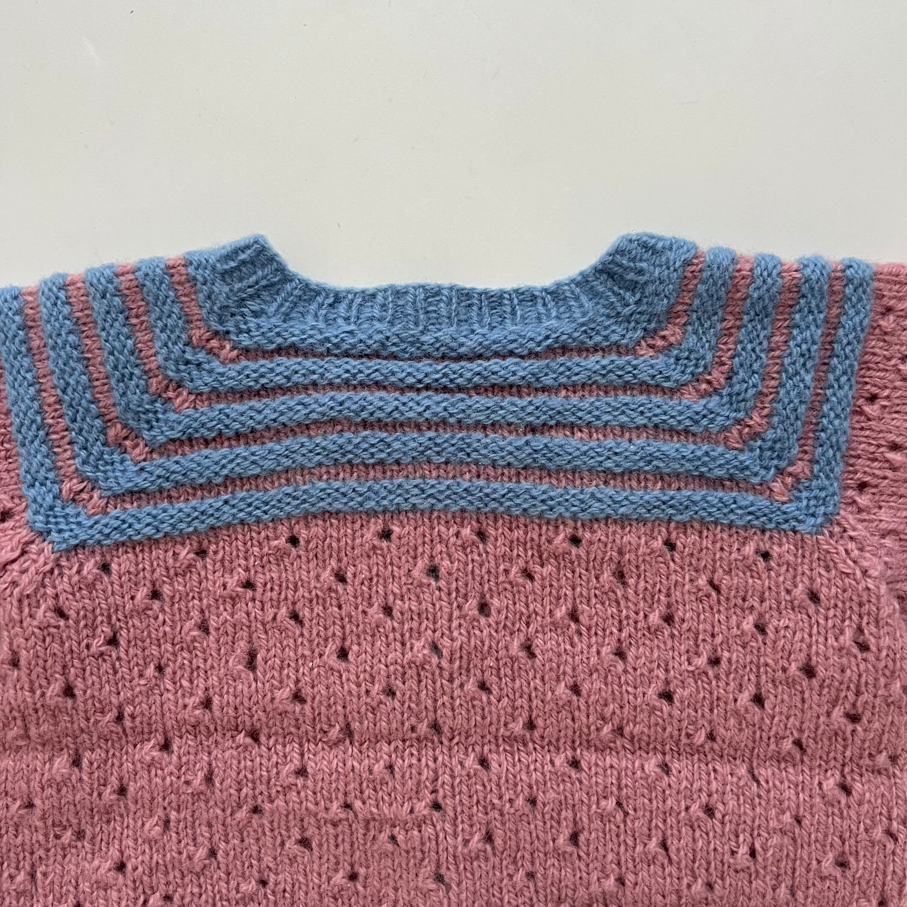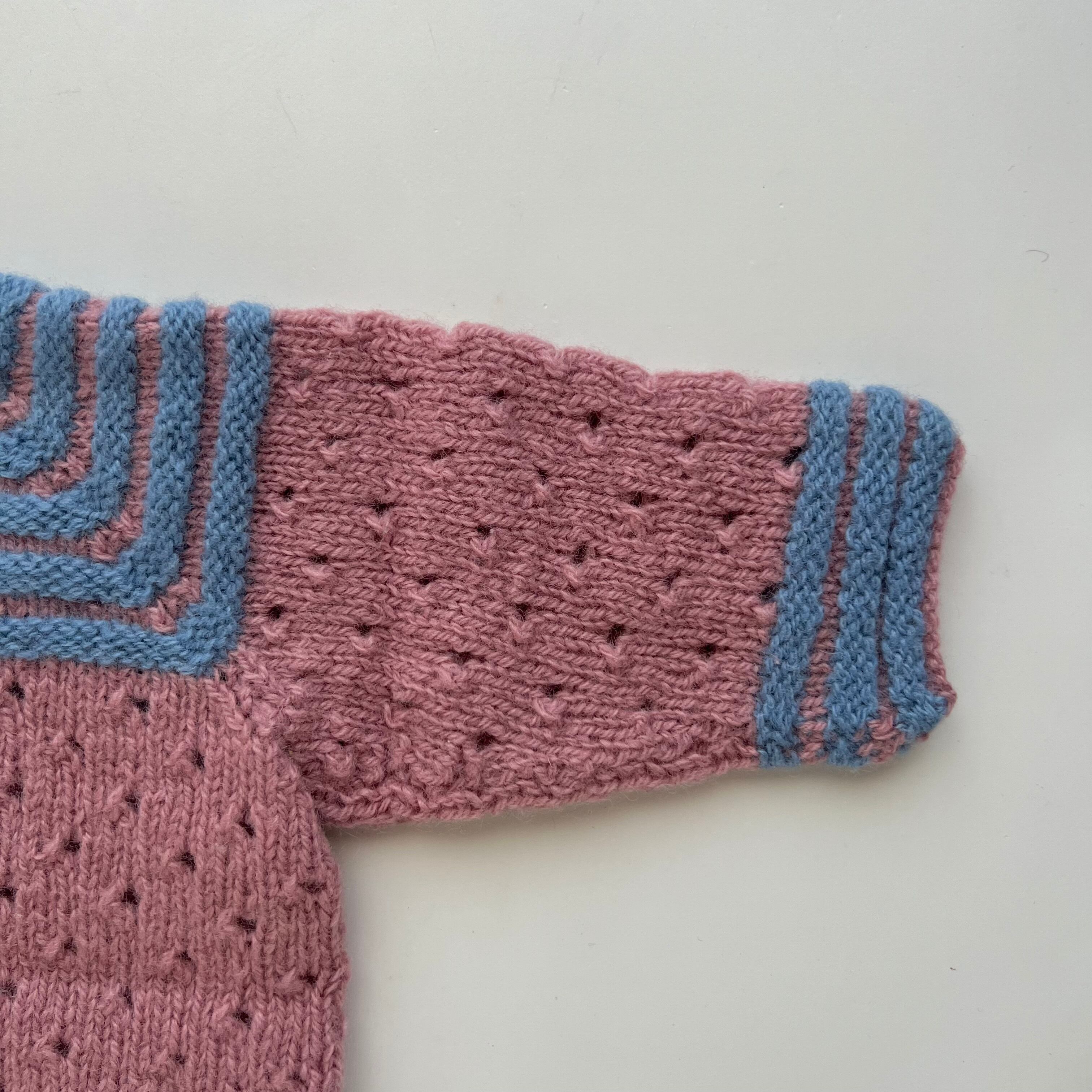 落ち着いたローズピンクをベースに、首まわり・袖口・裾にはグレイッシュブルーのラインをあしらったやさしい色合わせ。