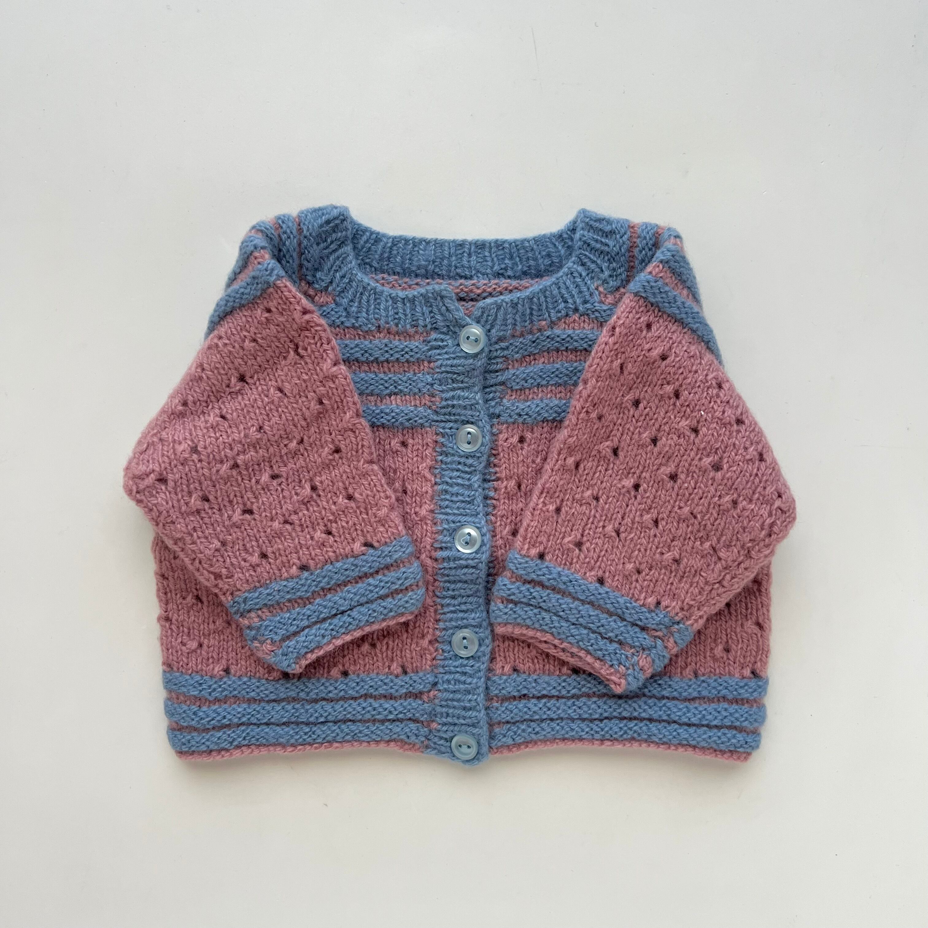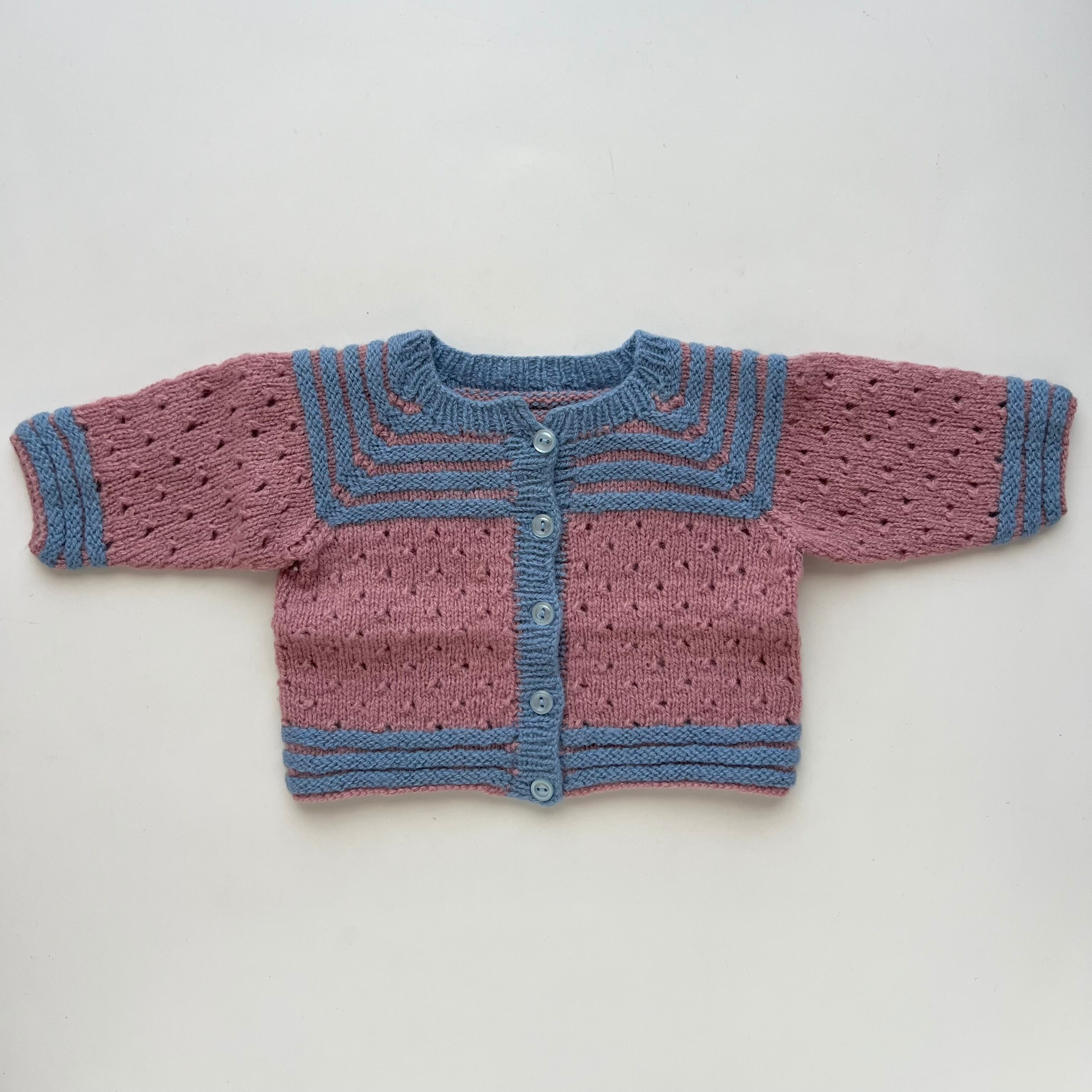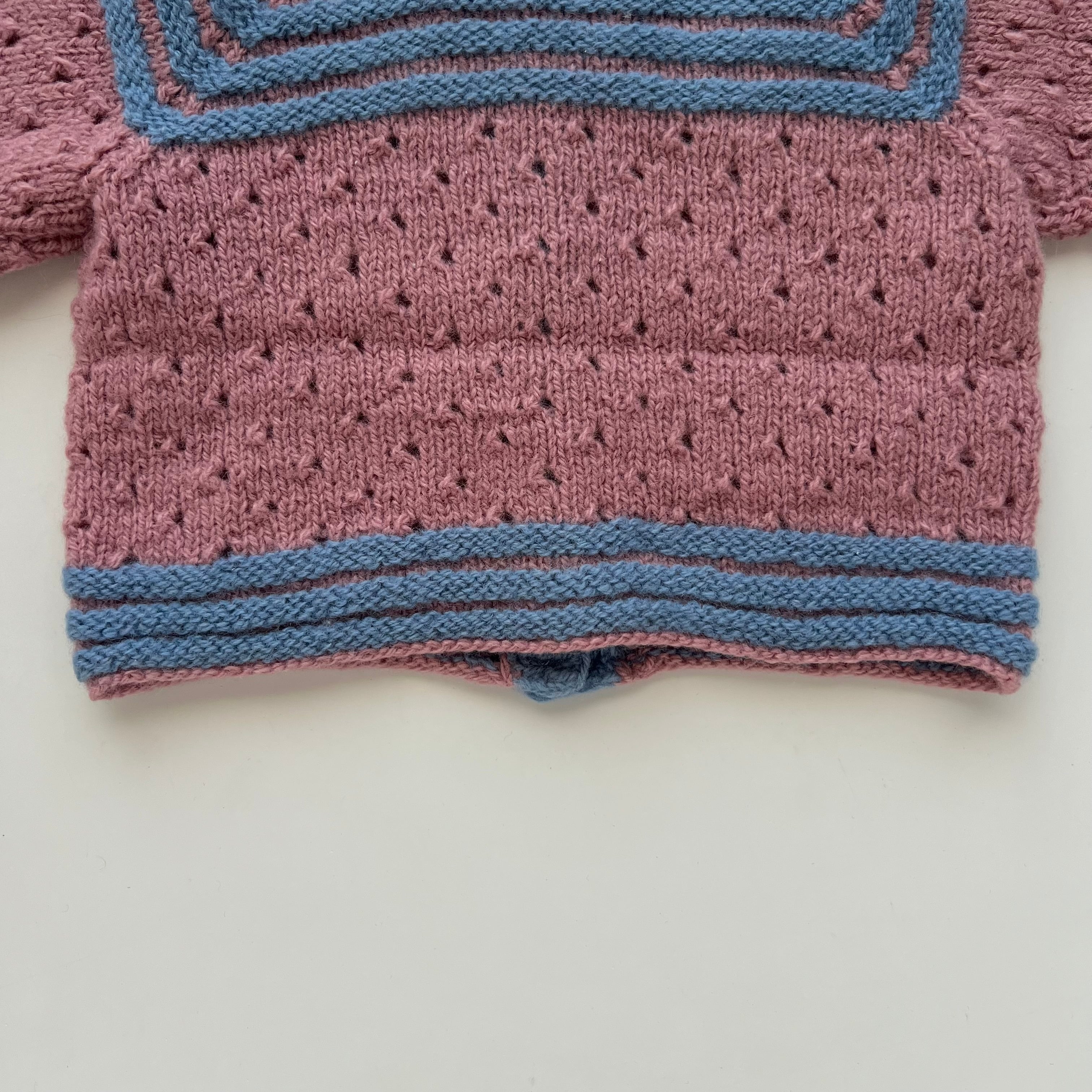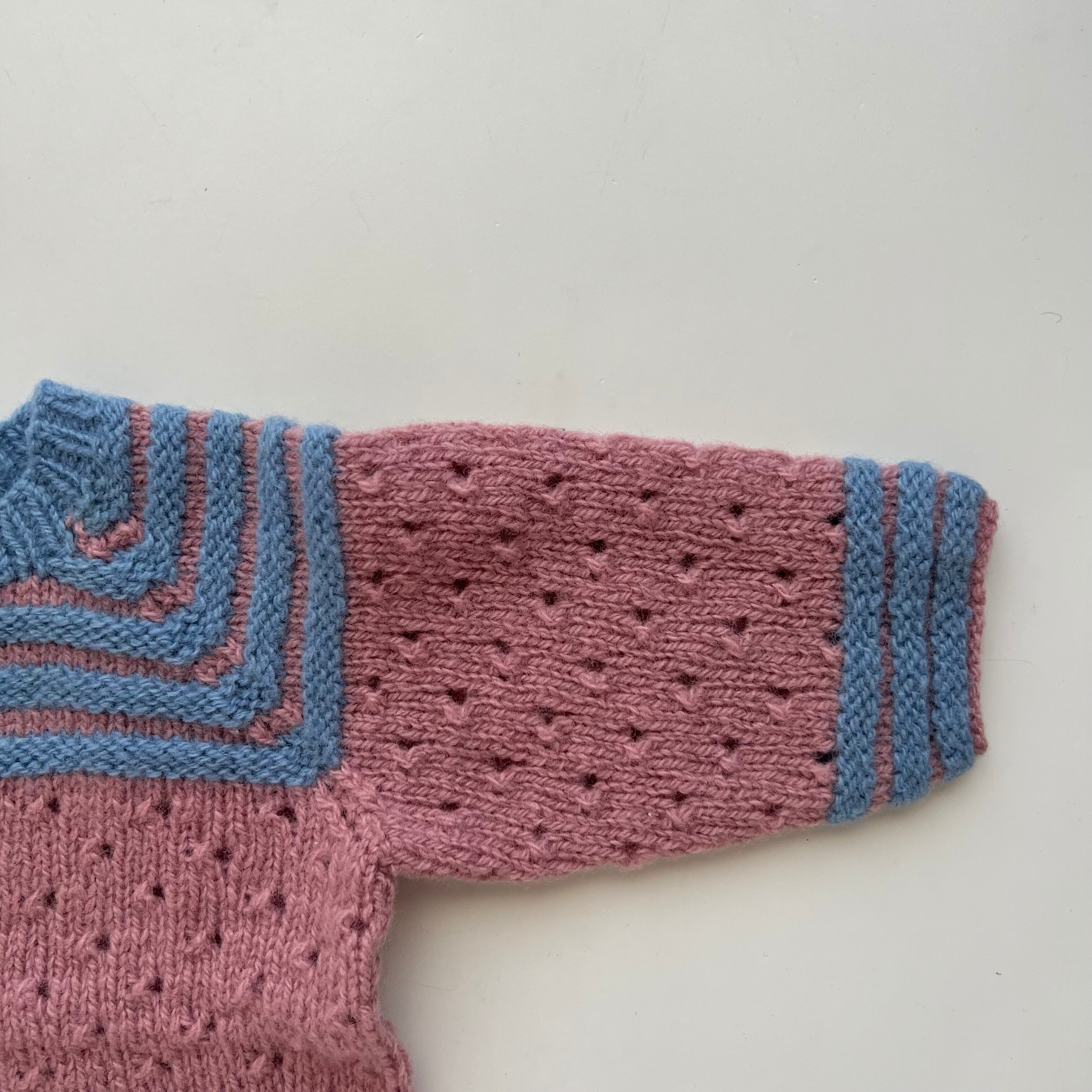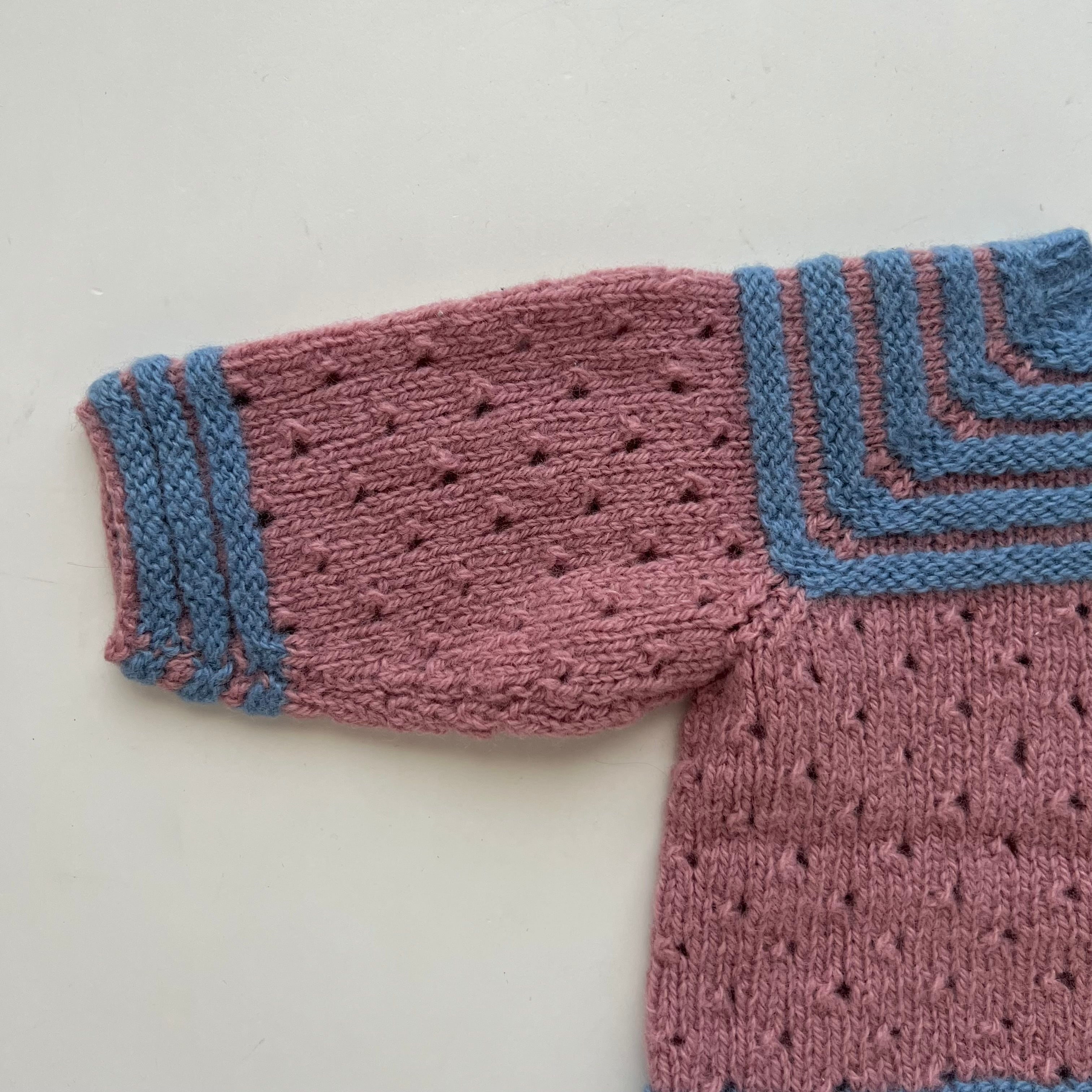 落ち着いたローズピンクをベースに、首まわり・袖口・裾にはグレイッシュブルーのラインをあしらったやさしい色合わせ。