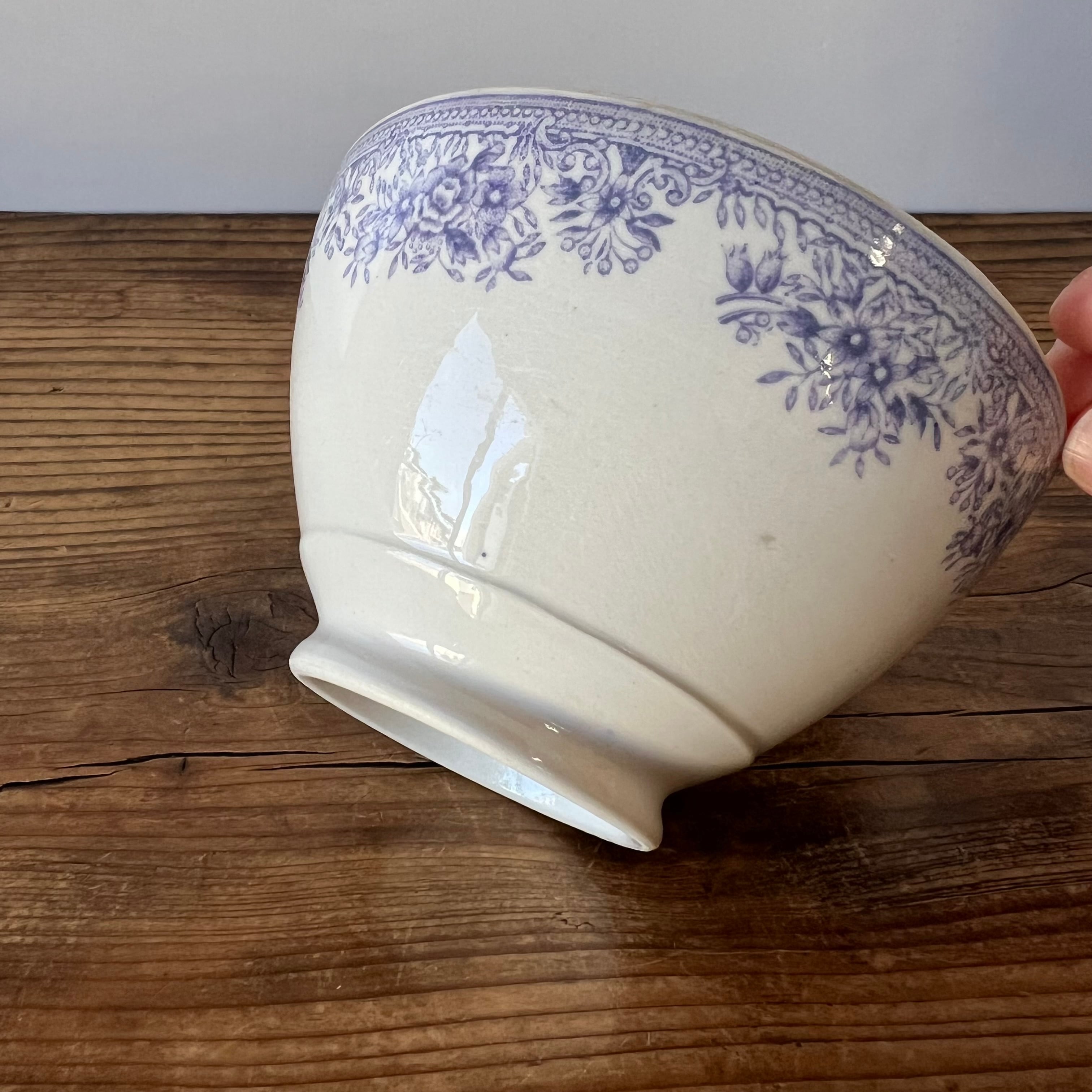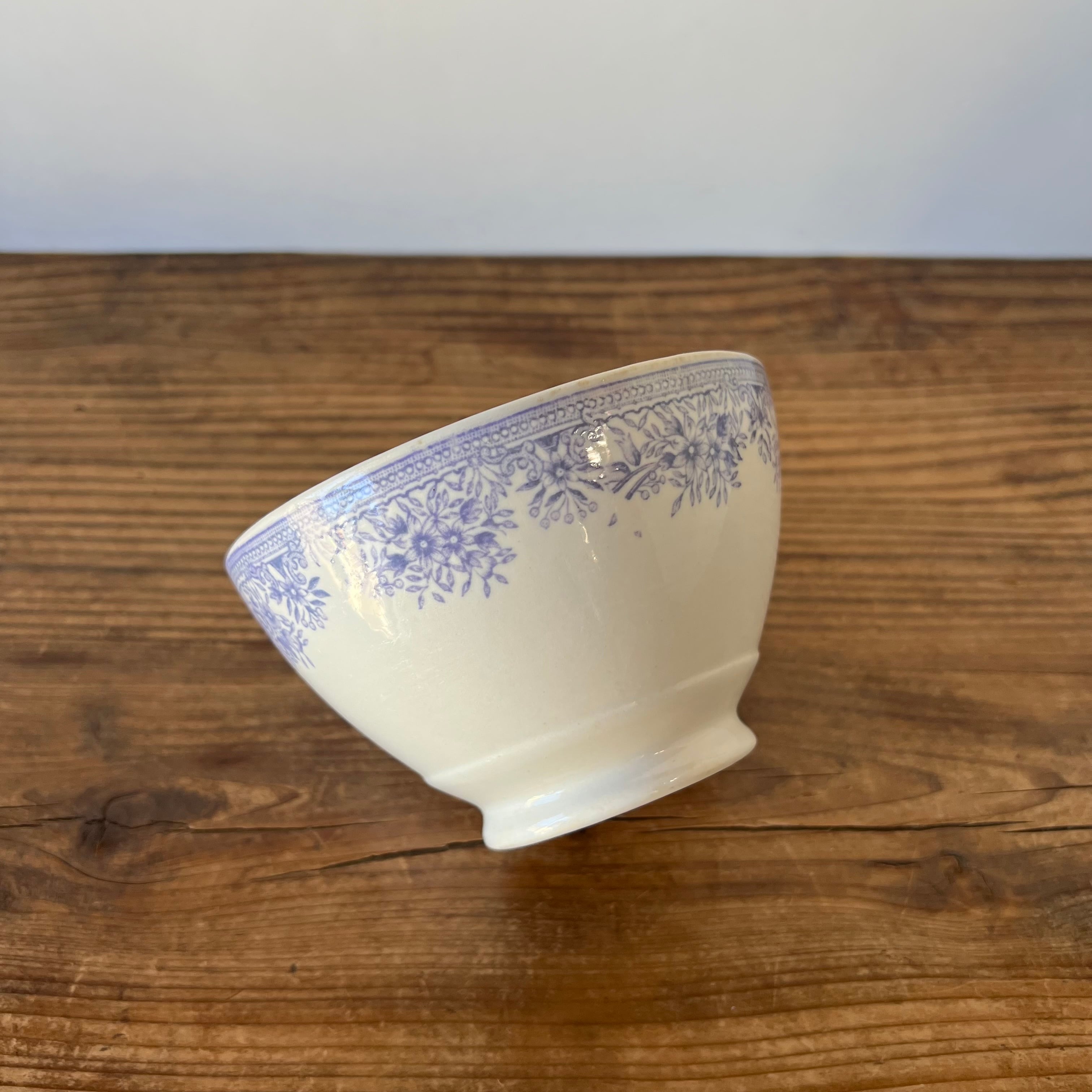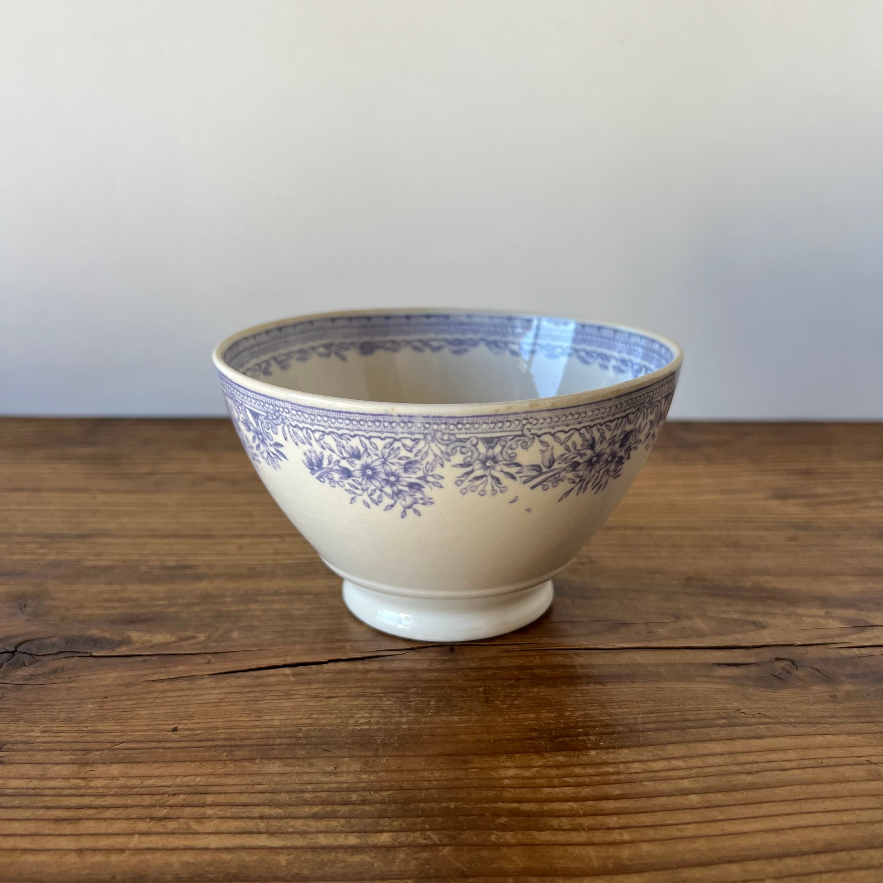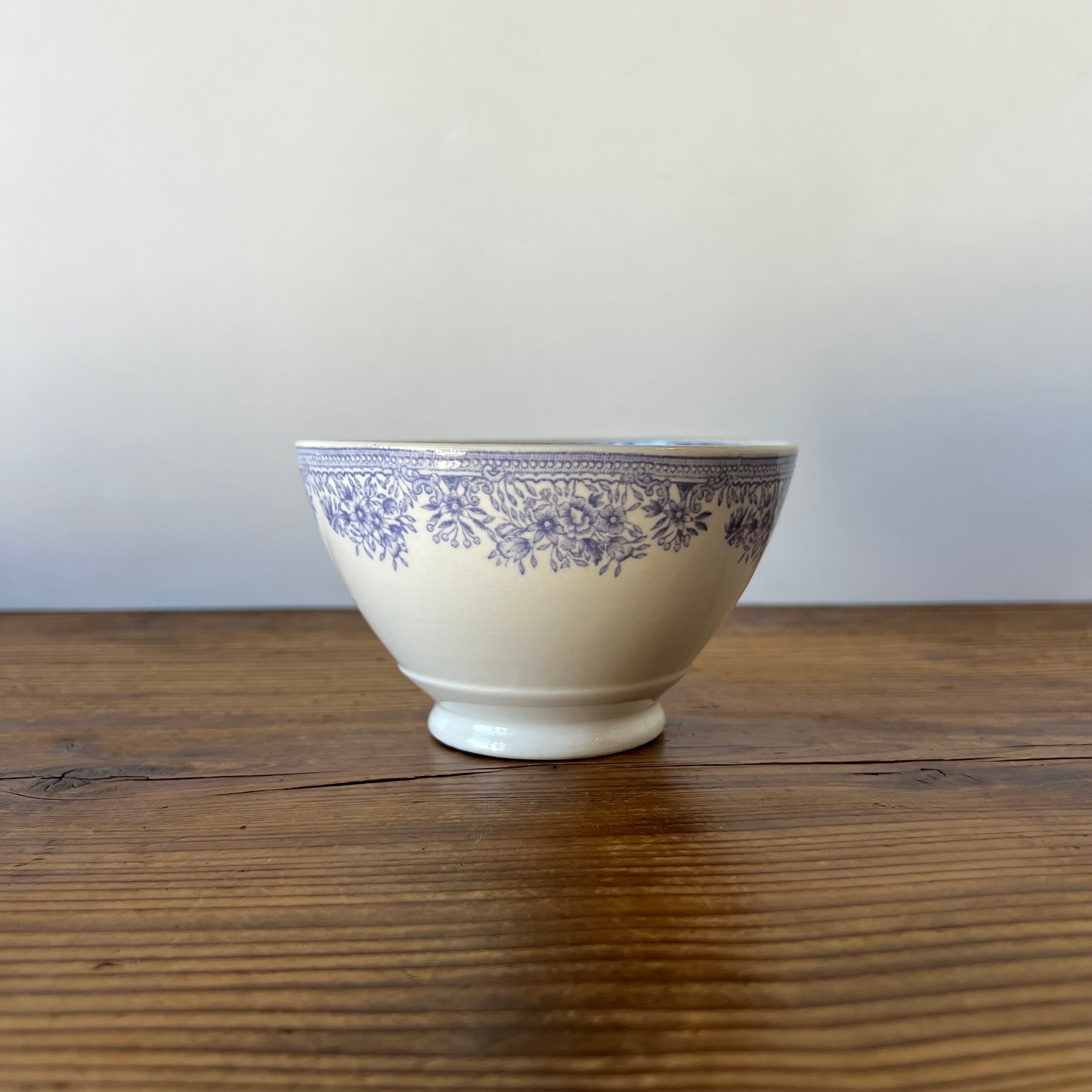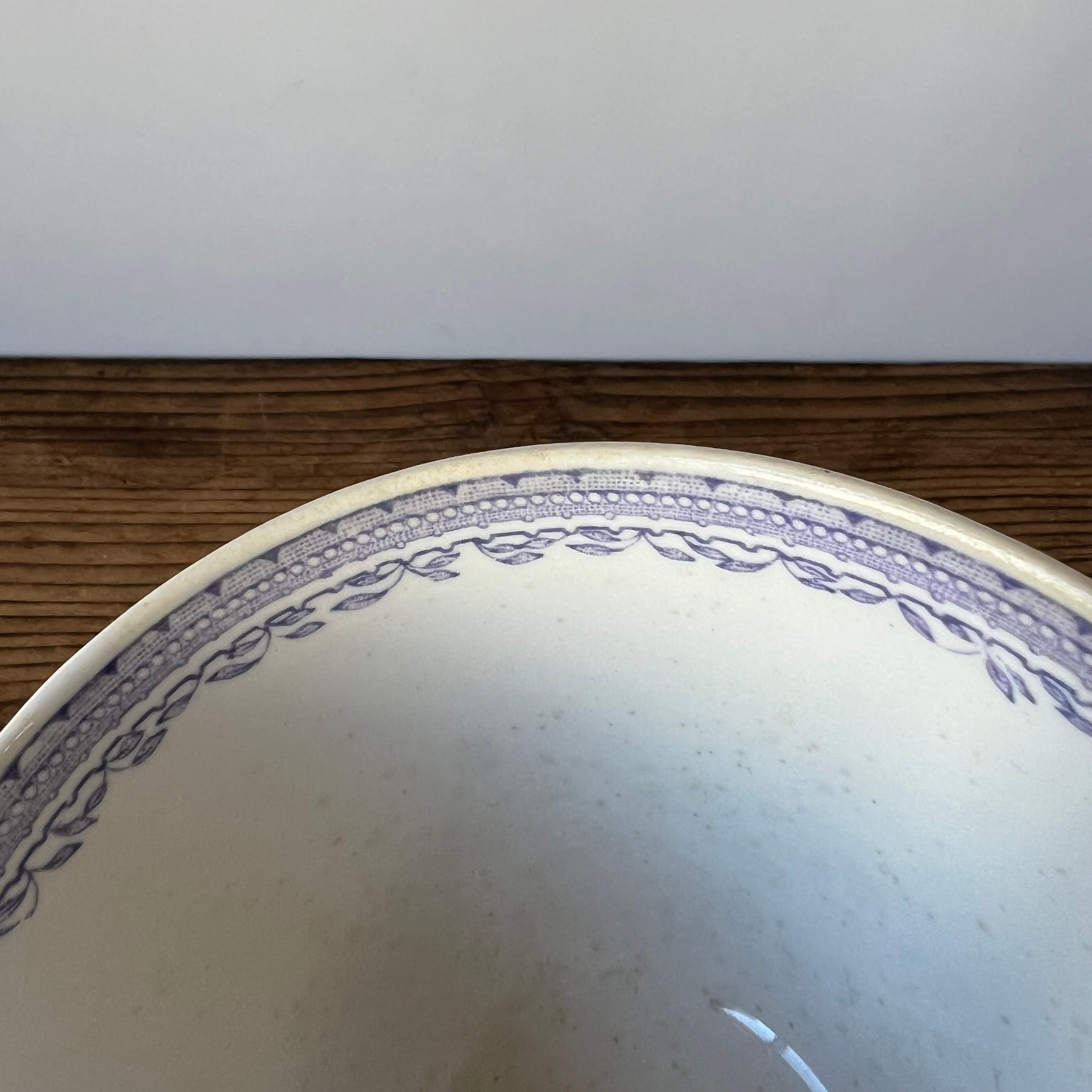 淡いライラック色で描かれた繊細な花模様が縁をぐるりと飾り、クラシカルでエレガントな雰囲気を漂わせています。