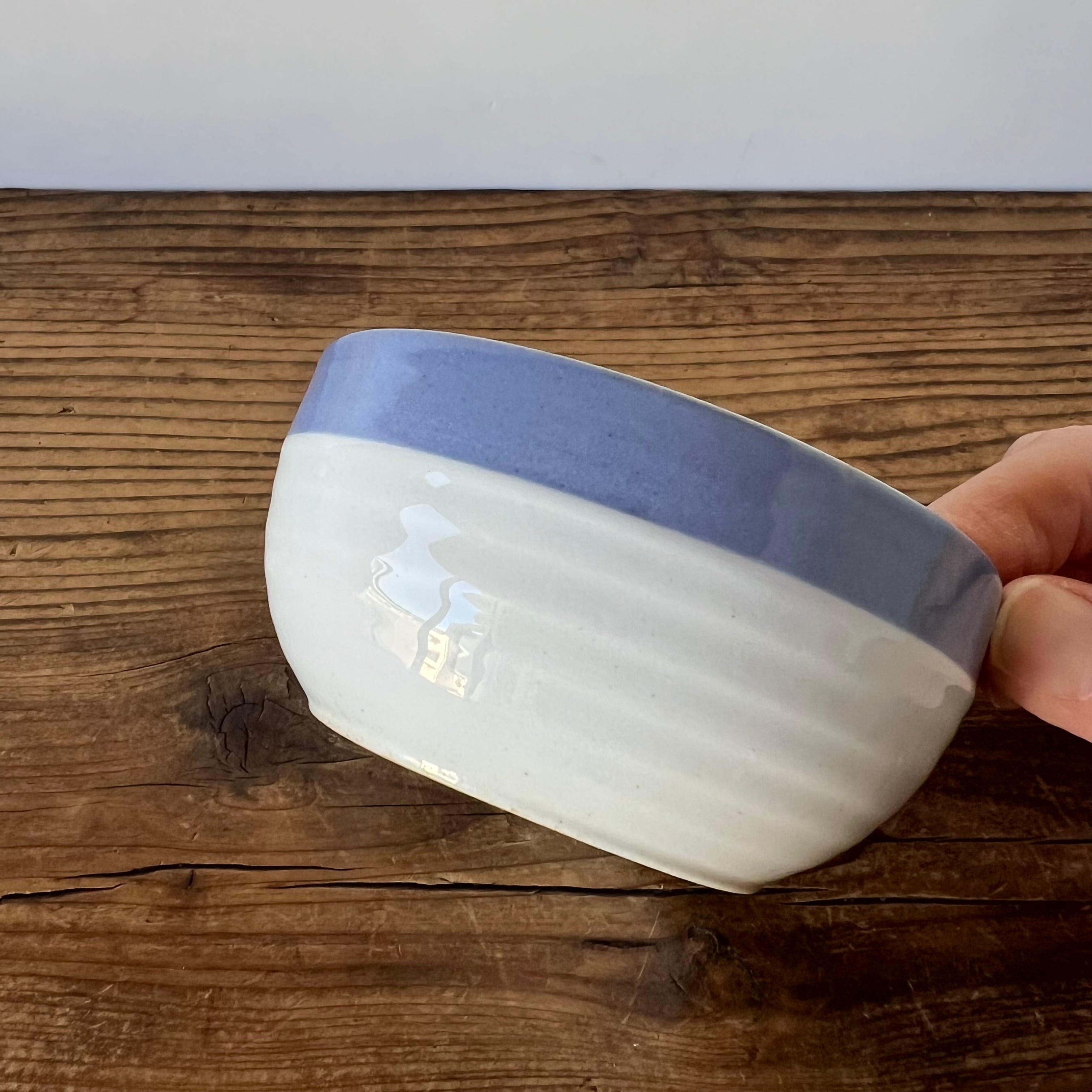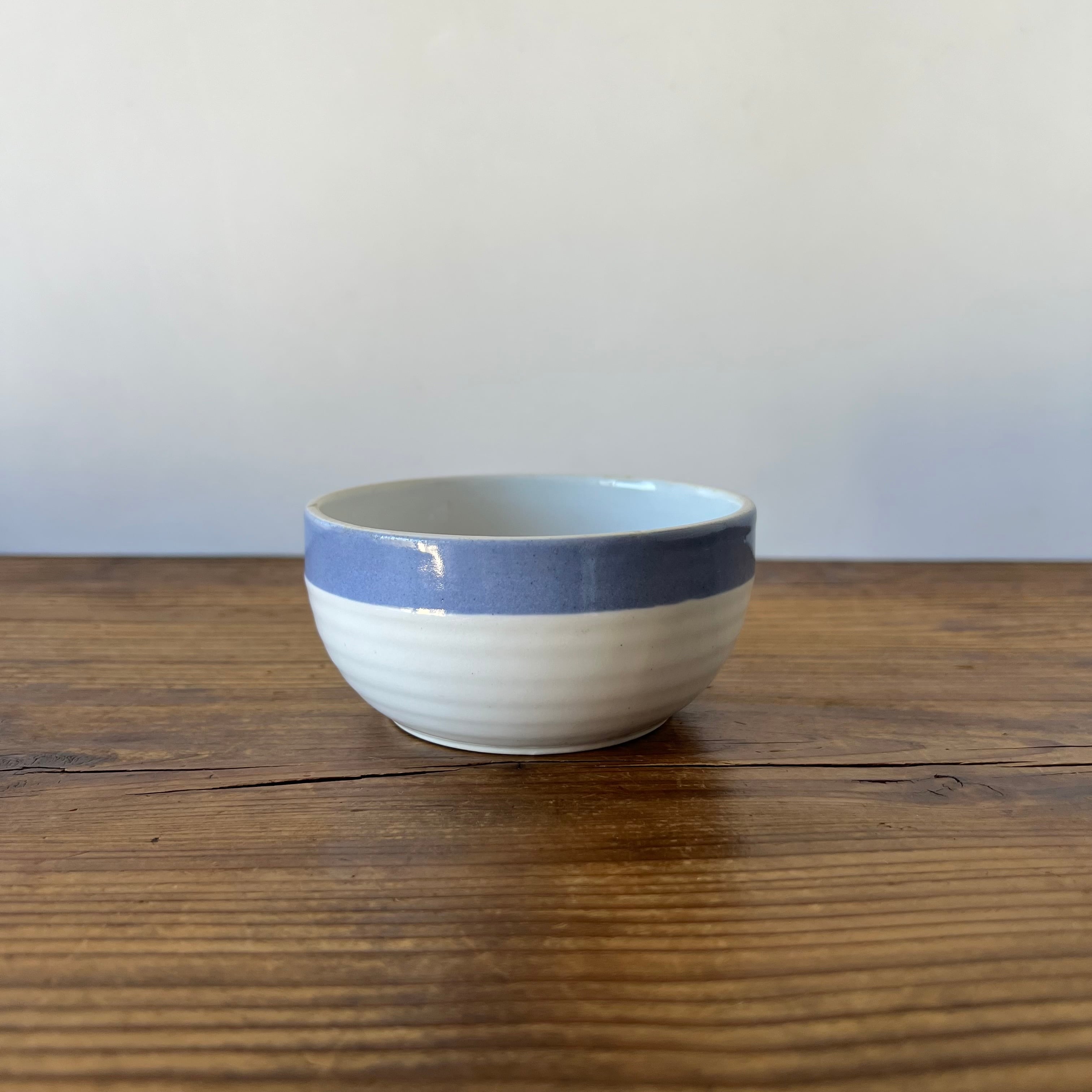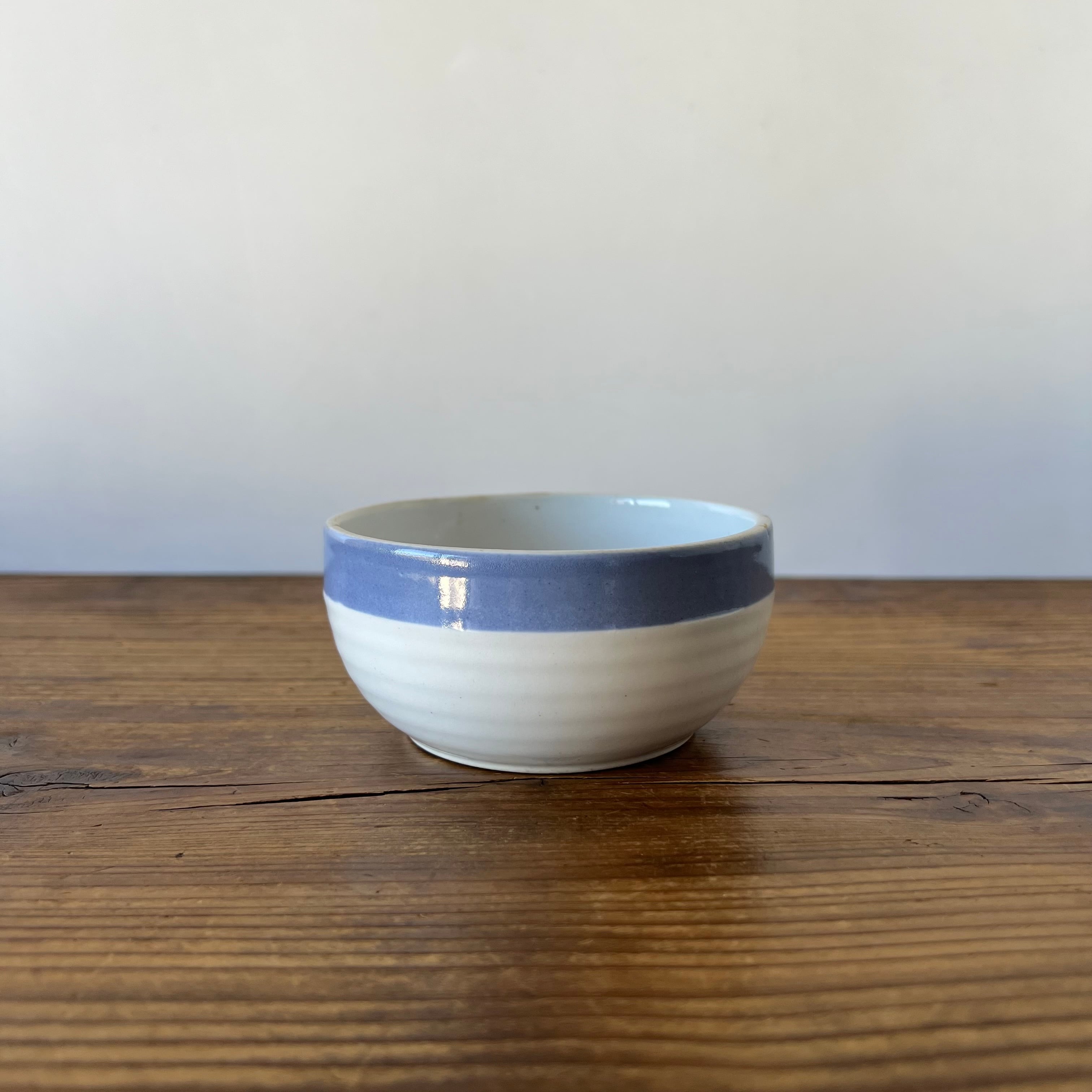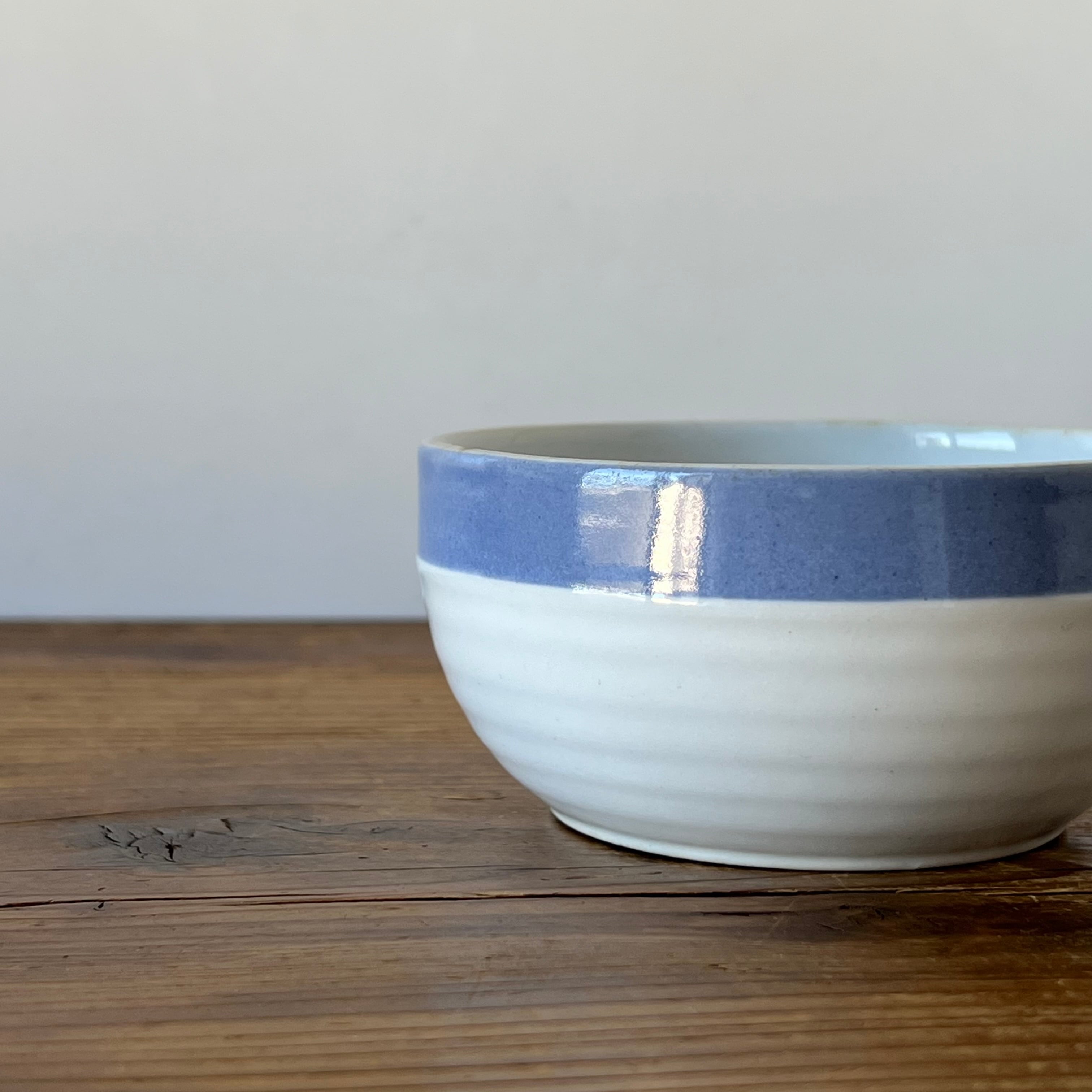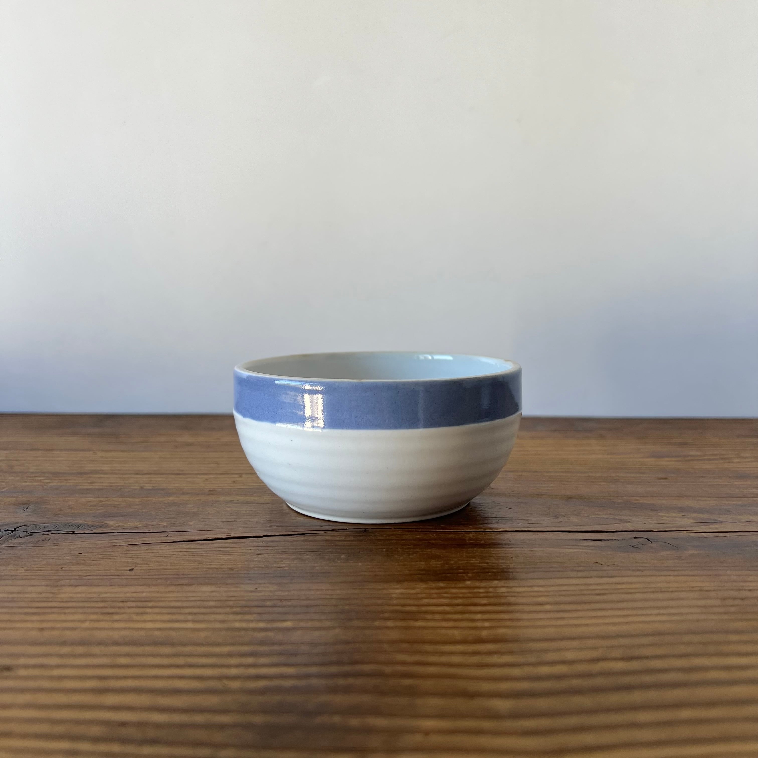こちらのボウルも、縁のわずかな歪みや、青釉の揺らぎなど、当時のクラフトらしい自然な表情が残っています。