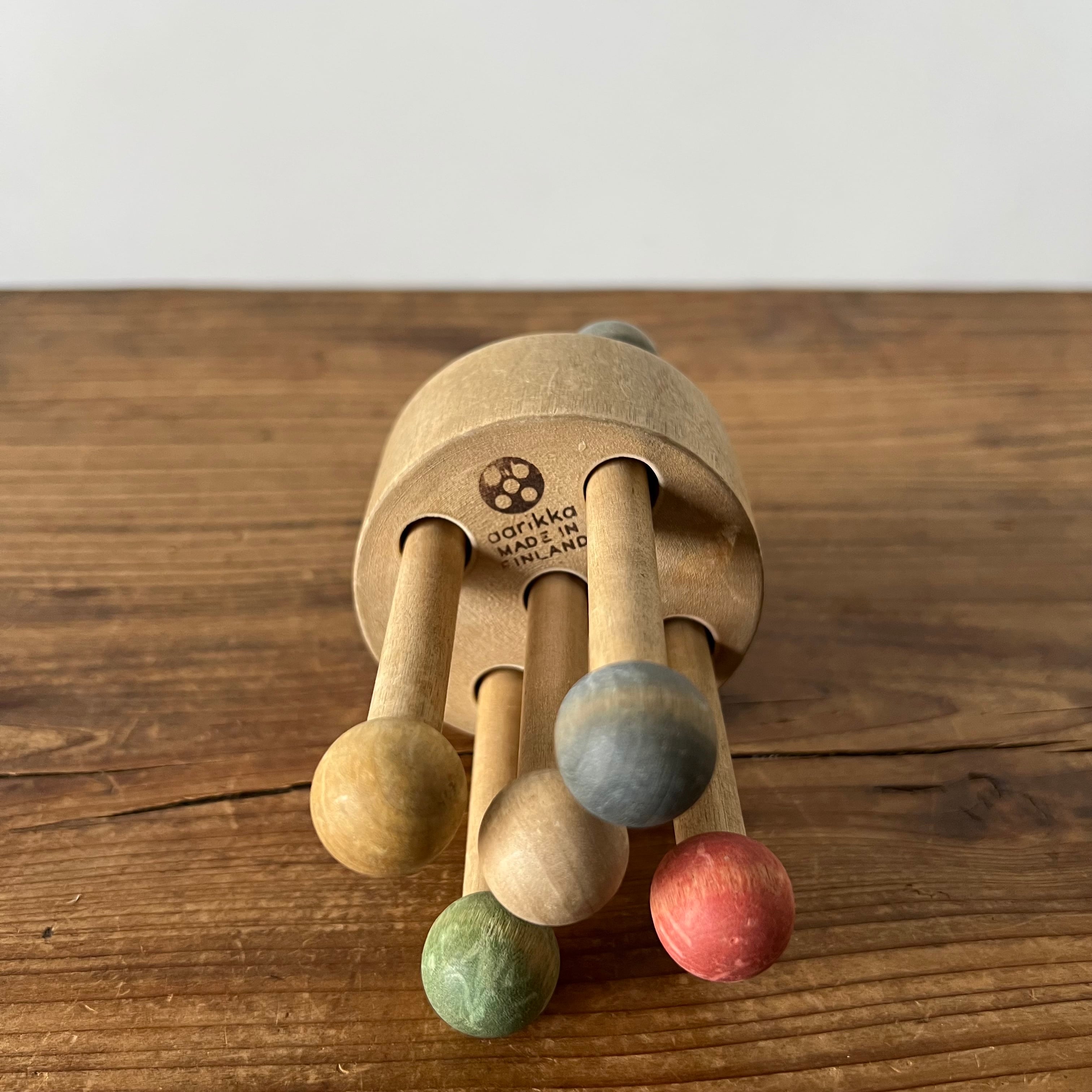 円柱の本体の上下から木の棒が伸び、それぞれの先端にカラフルな丸玉がついた、aarikkaらしい温かみのあるデザインが特徴です。