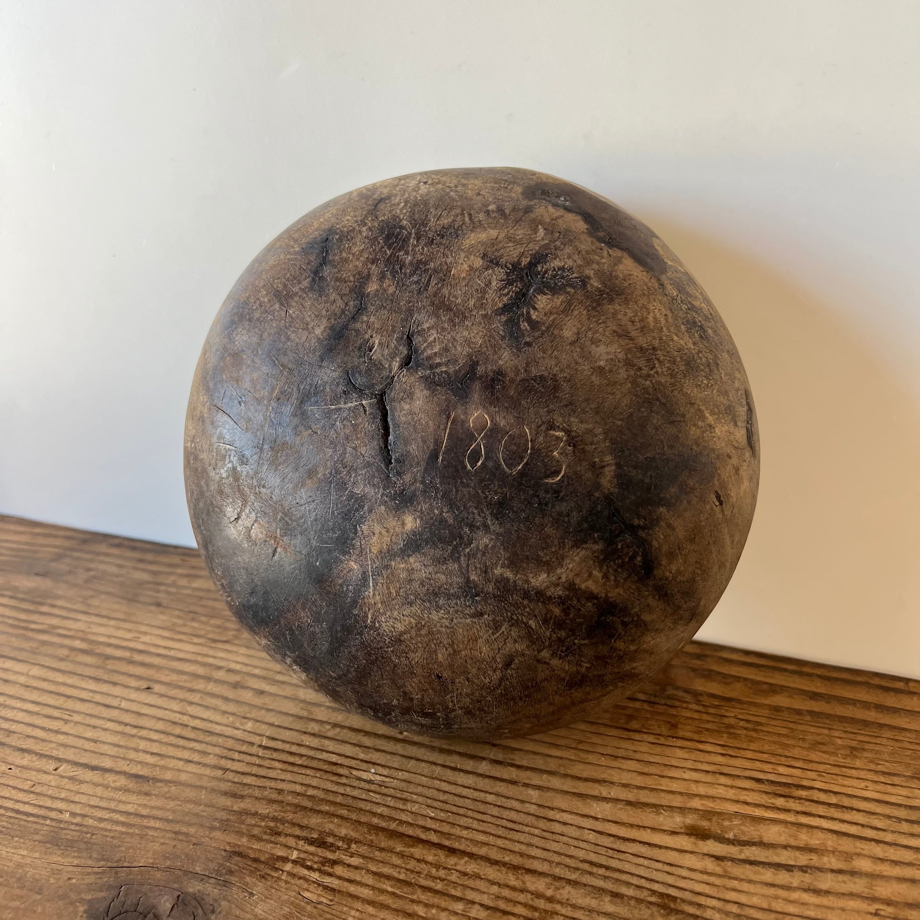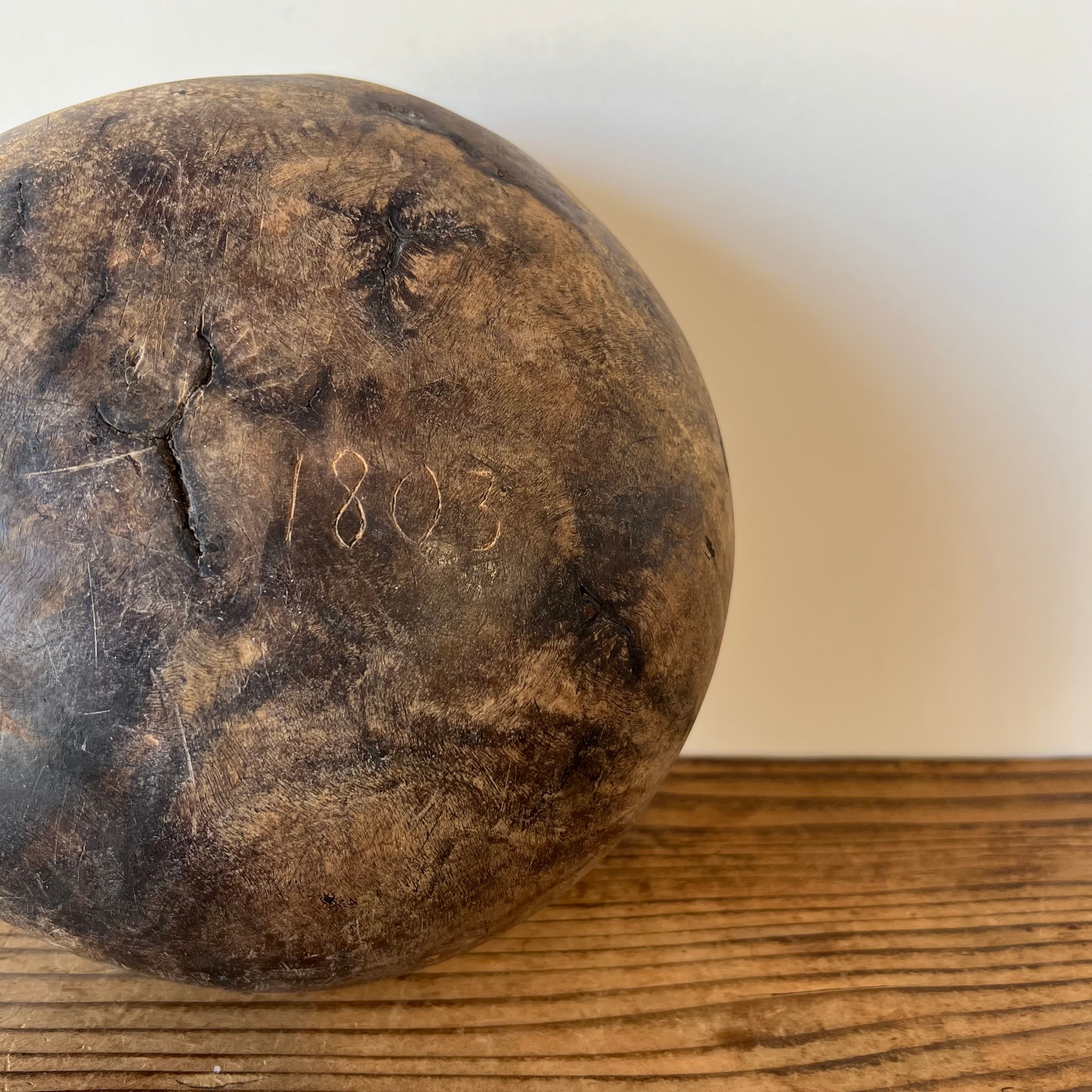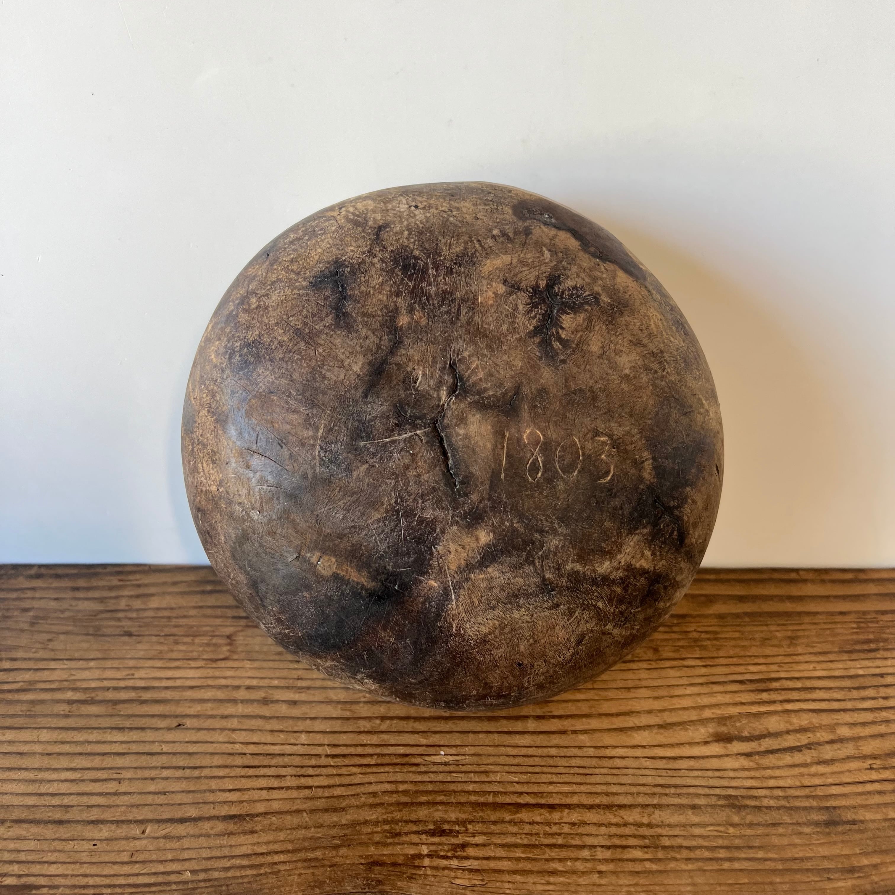 表面には手作業で成形された跡が残り、古い木製食器特有の素朴で温かな表情が感じられます。底面には「1803」と刻まれており、実際の制作年は断定できないものの、長い年月を経た歴史ある佇まいが魅力です。