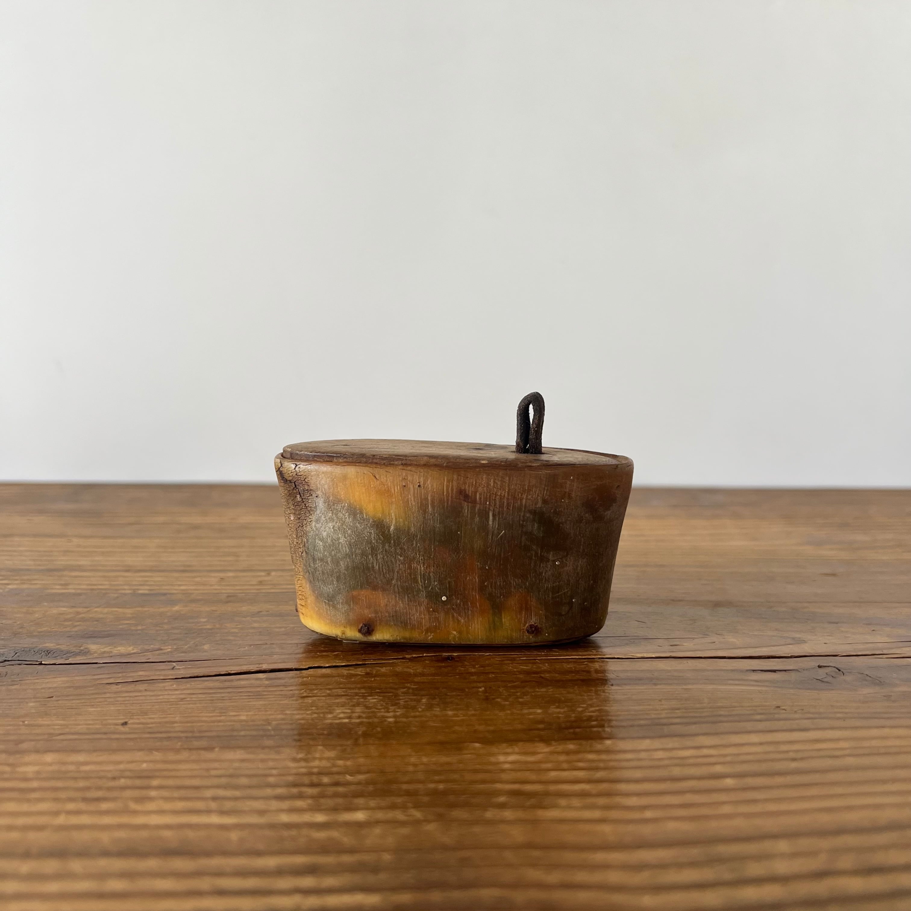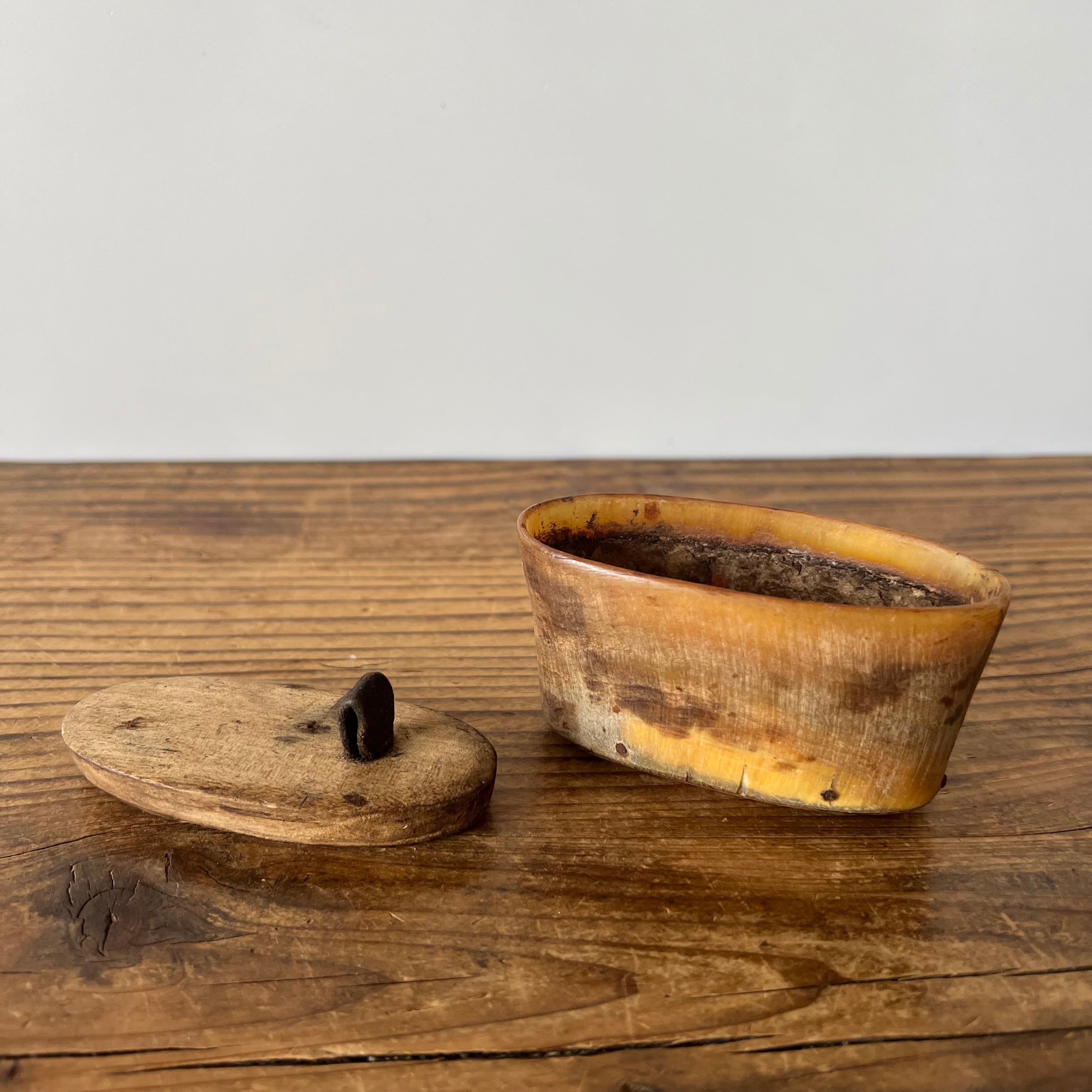 本体は動物の角を削り出して成形され、蓋と底部には木の板が嵌め込まれています。蓋の小さなループは革製です。
