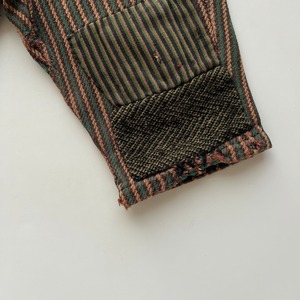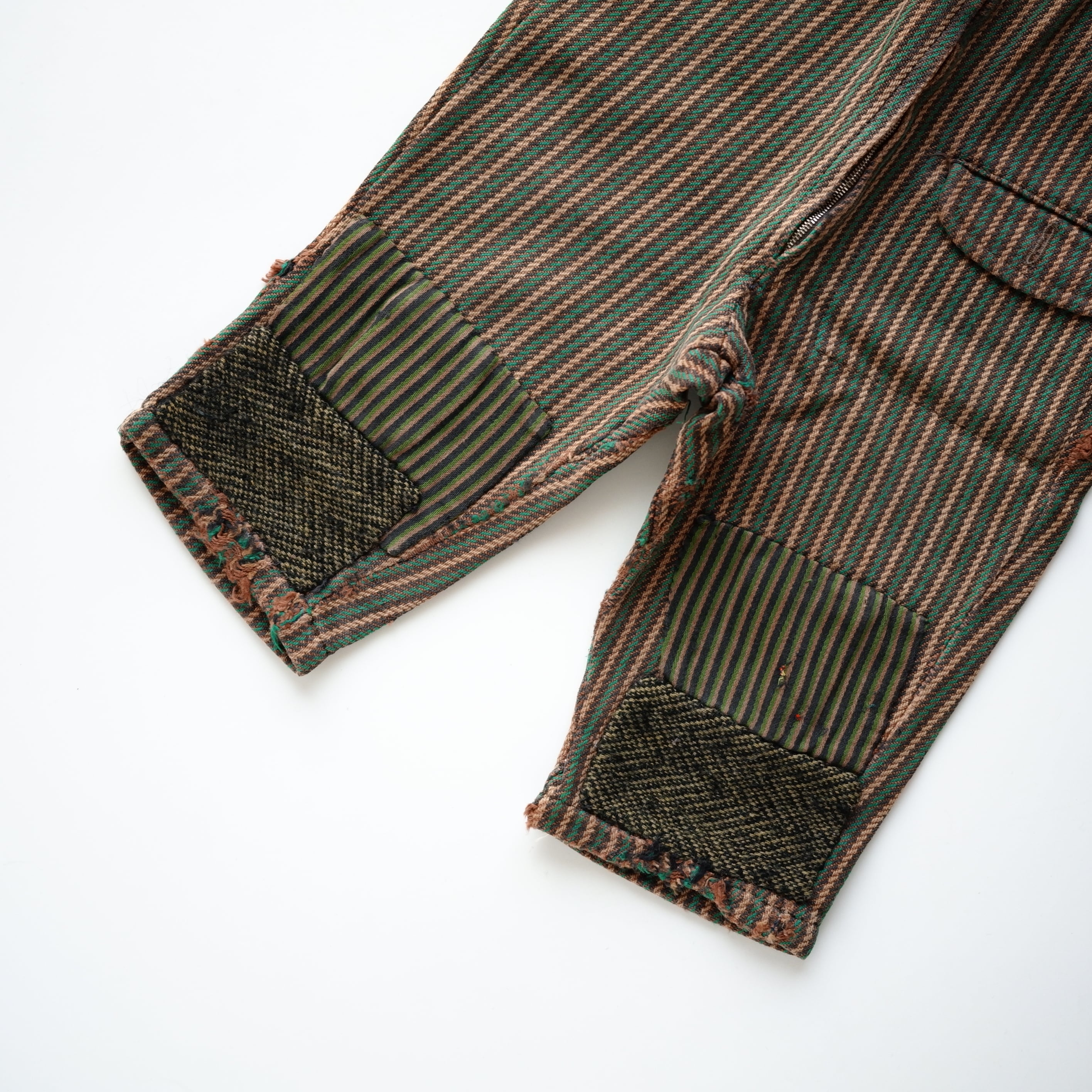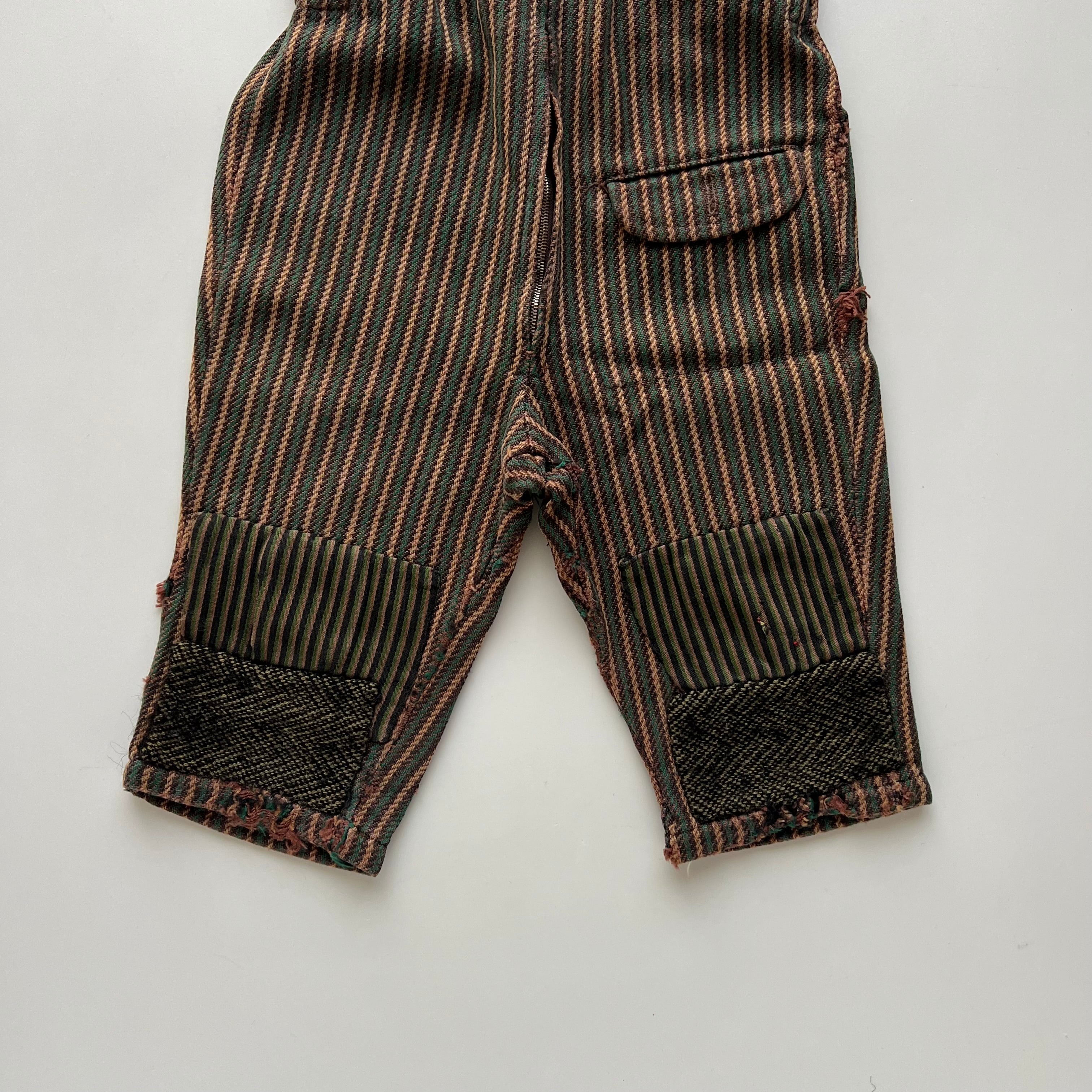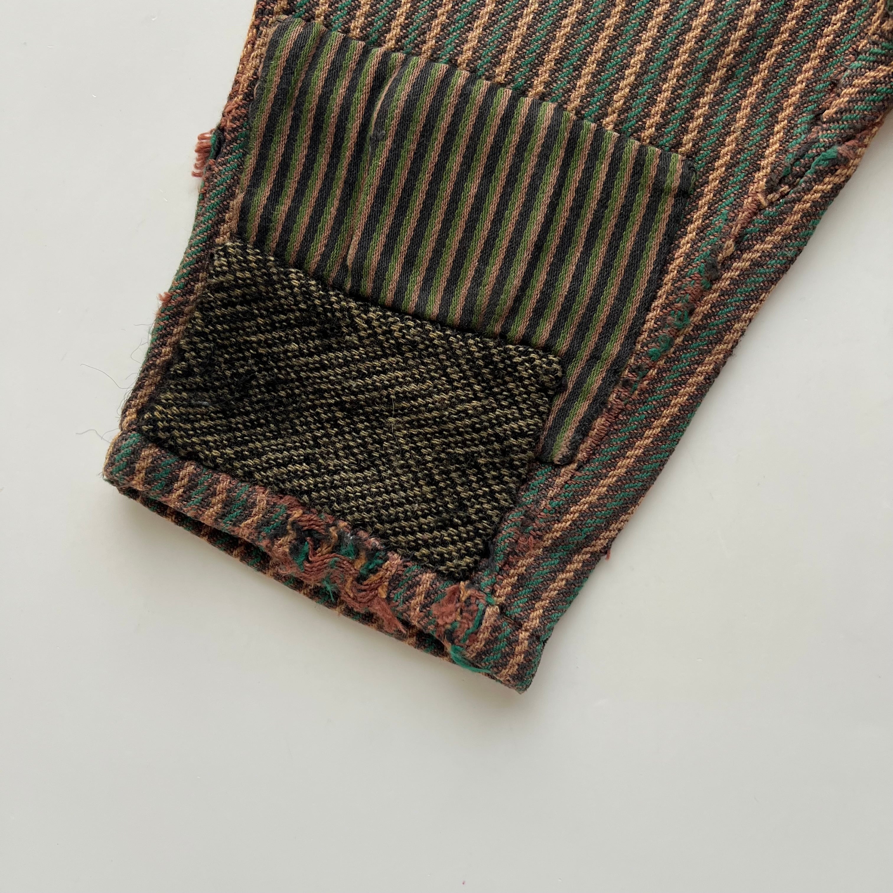 長い年月の中で繰り返し着用され、膝部分には当て布による繕いの跡が残されています。