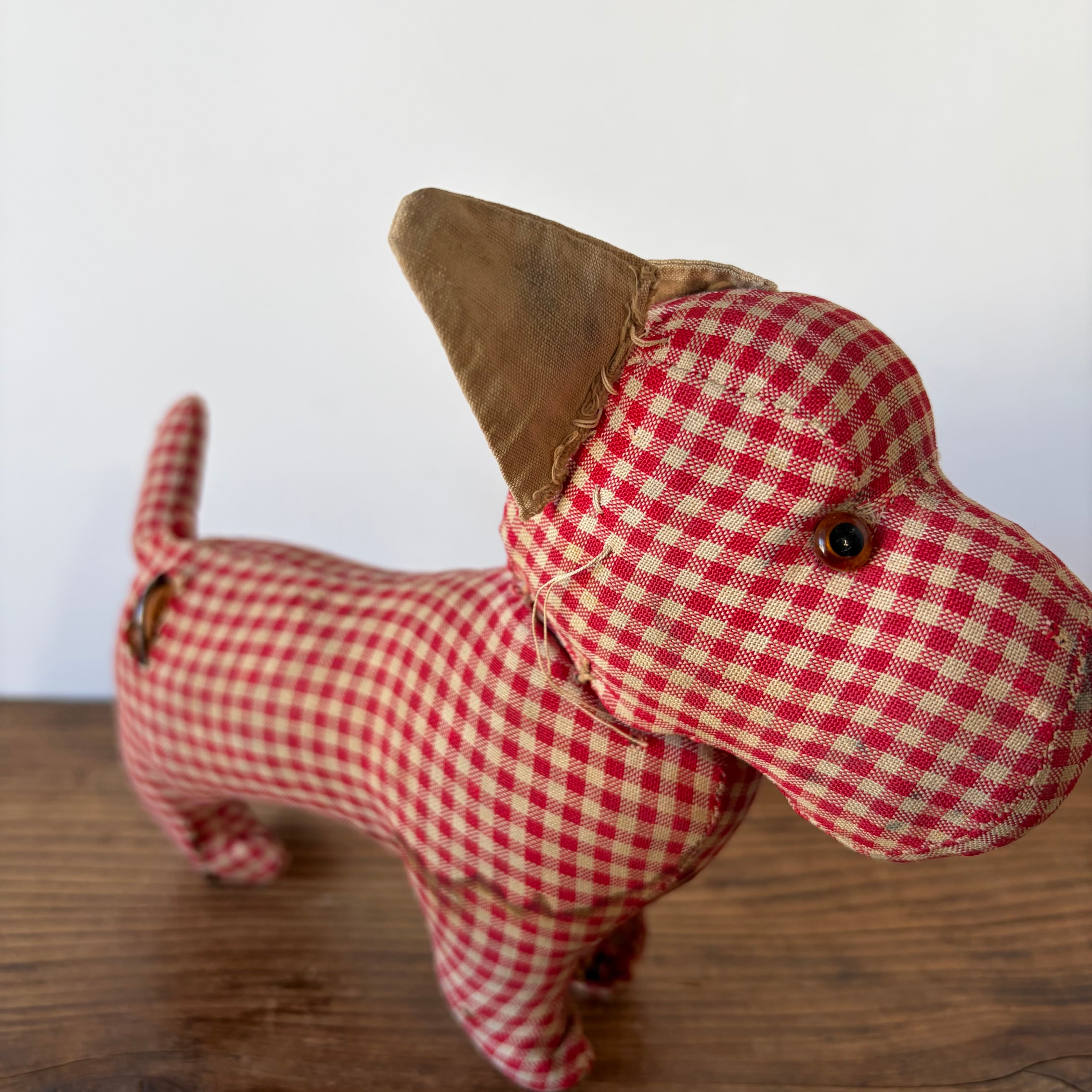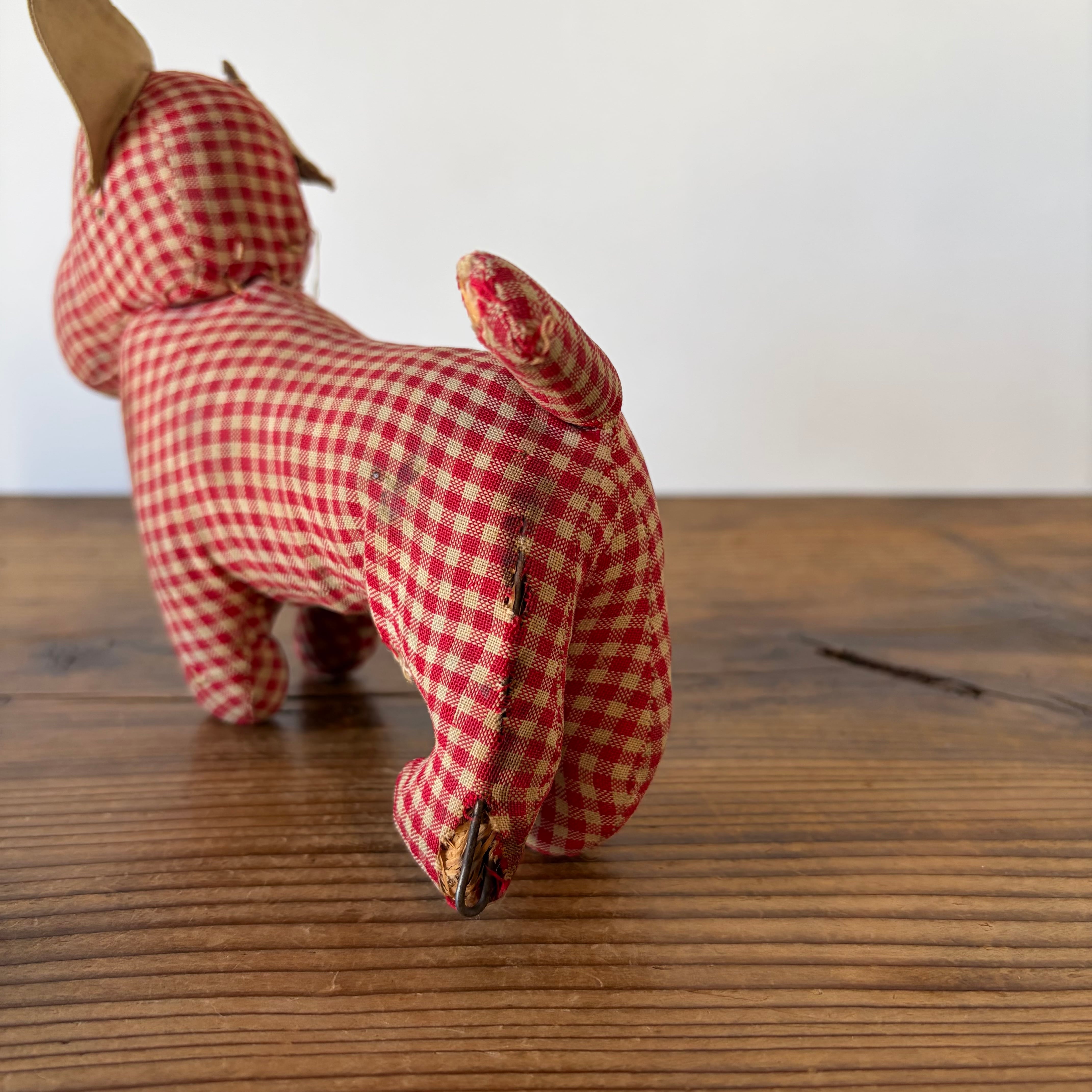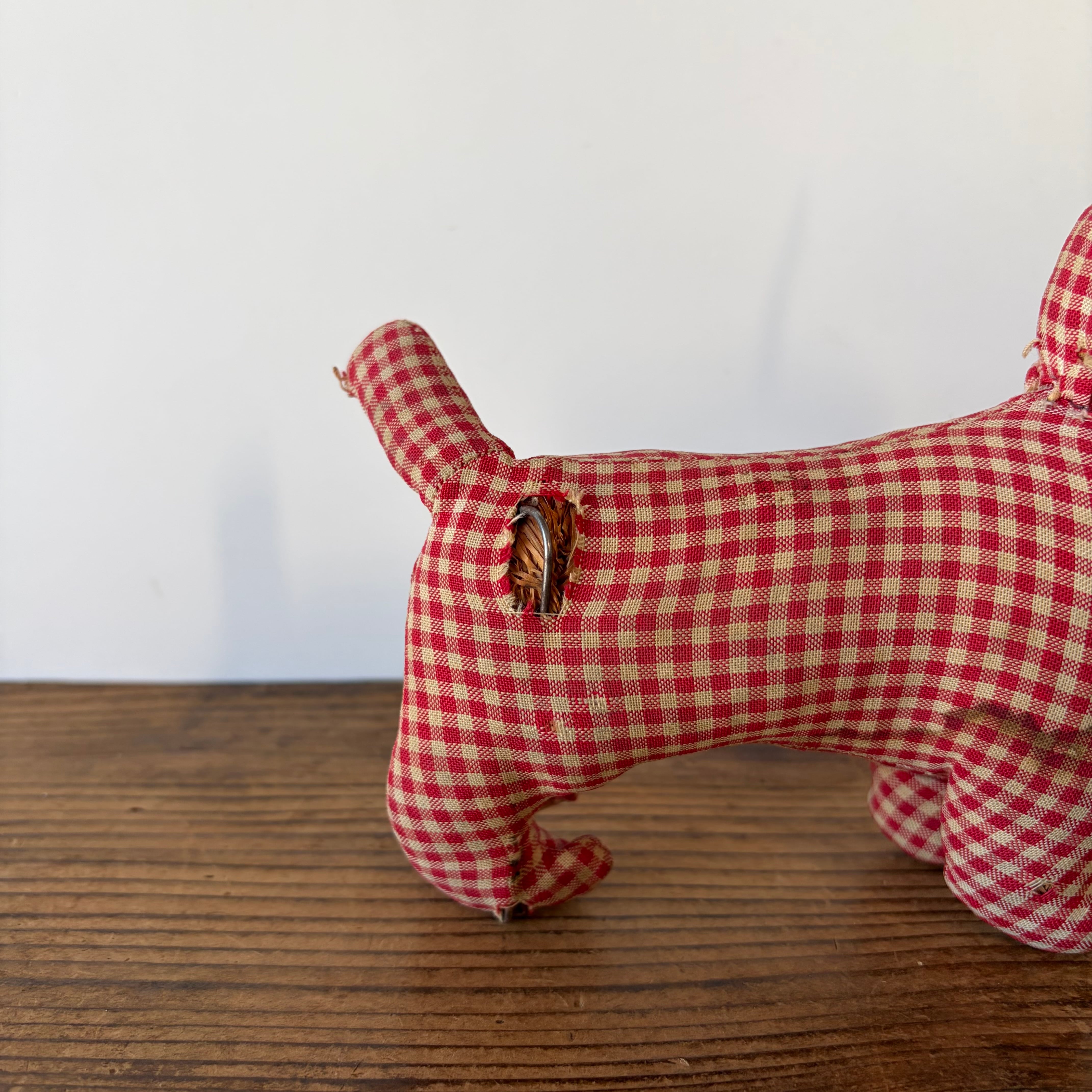 スウェーデンで見つけた、赤×生成りのギンガムチェック生地が印象的な犬のぬいぐるみ。