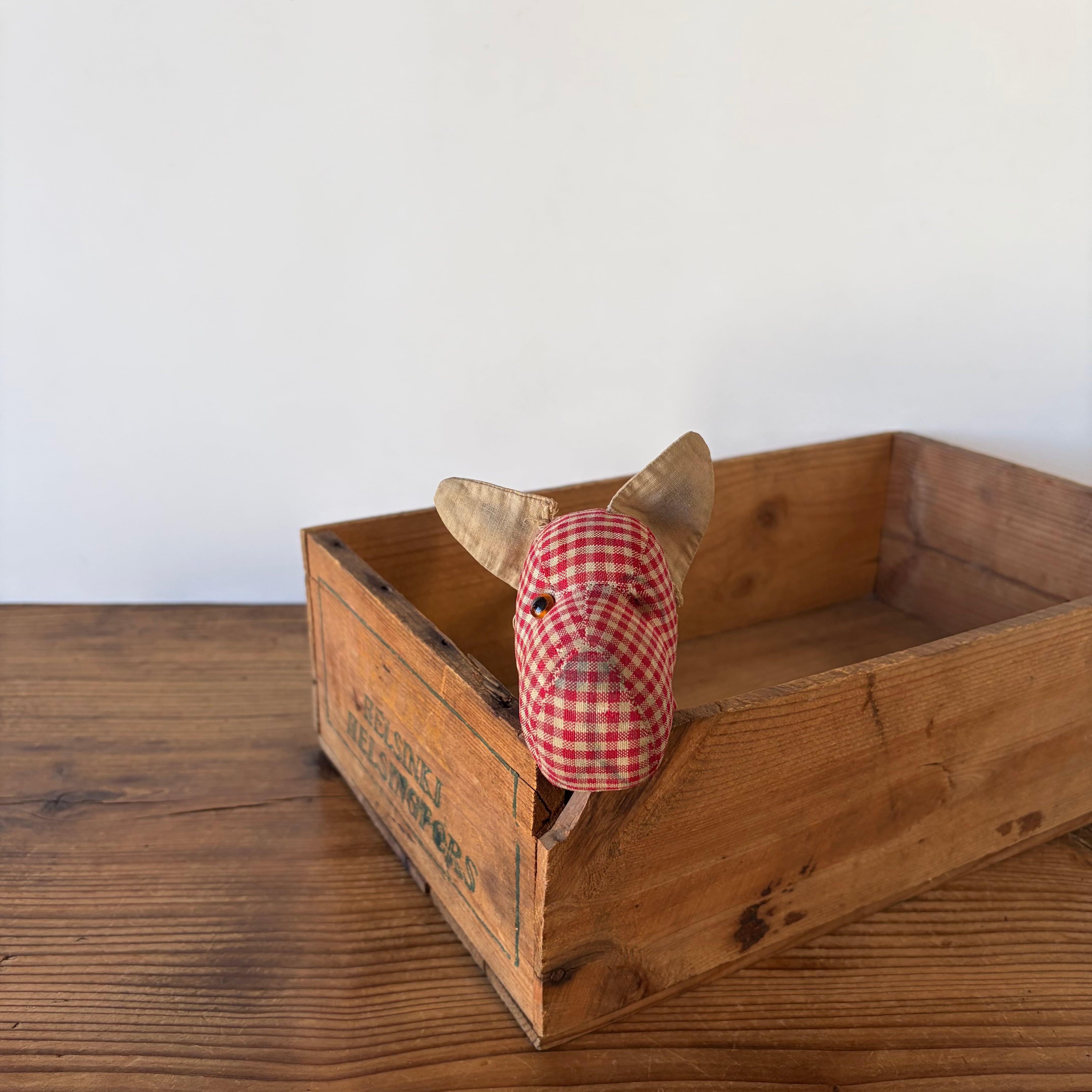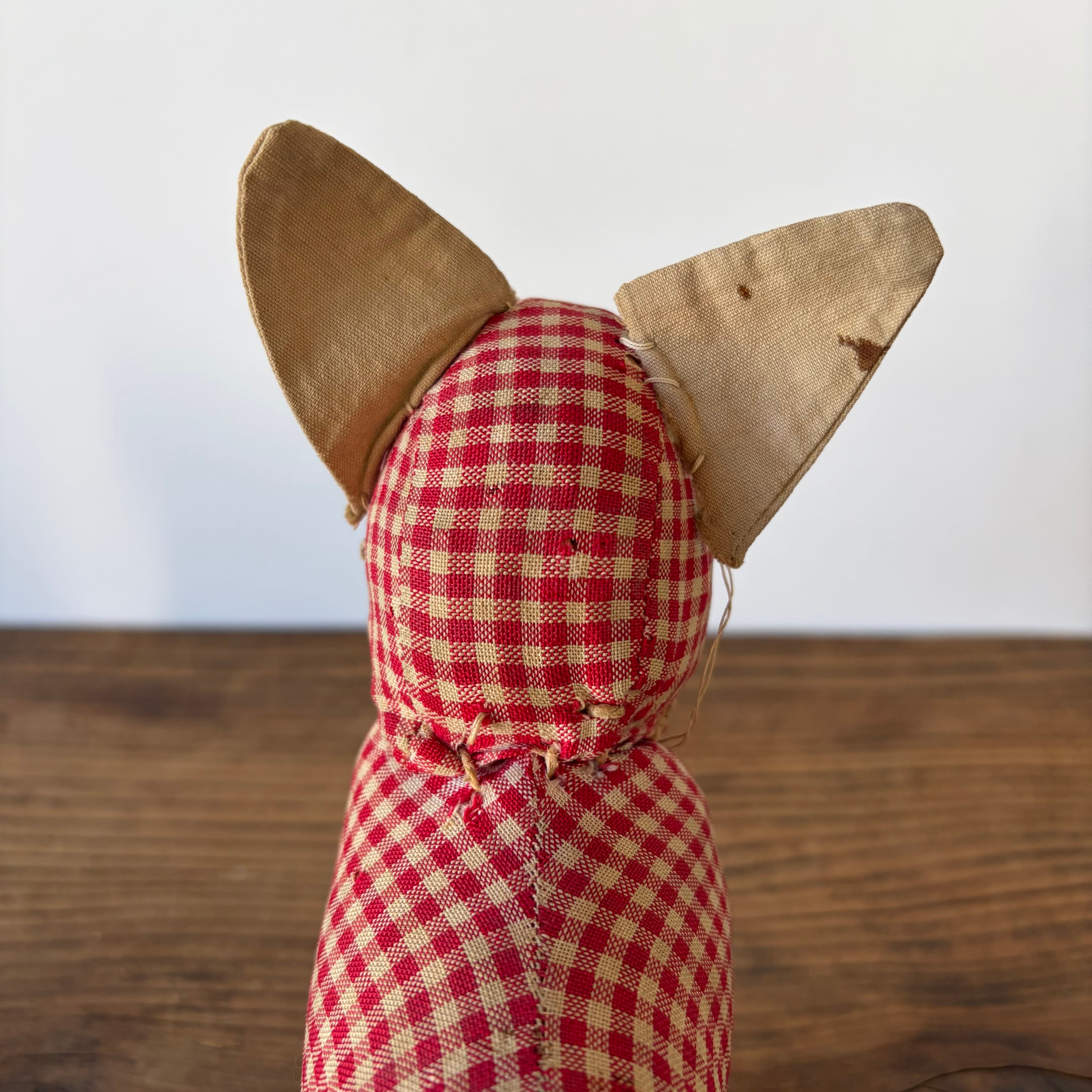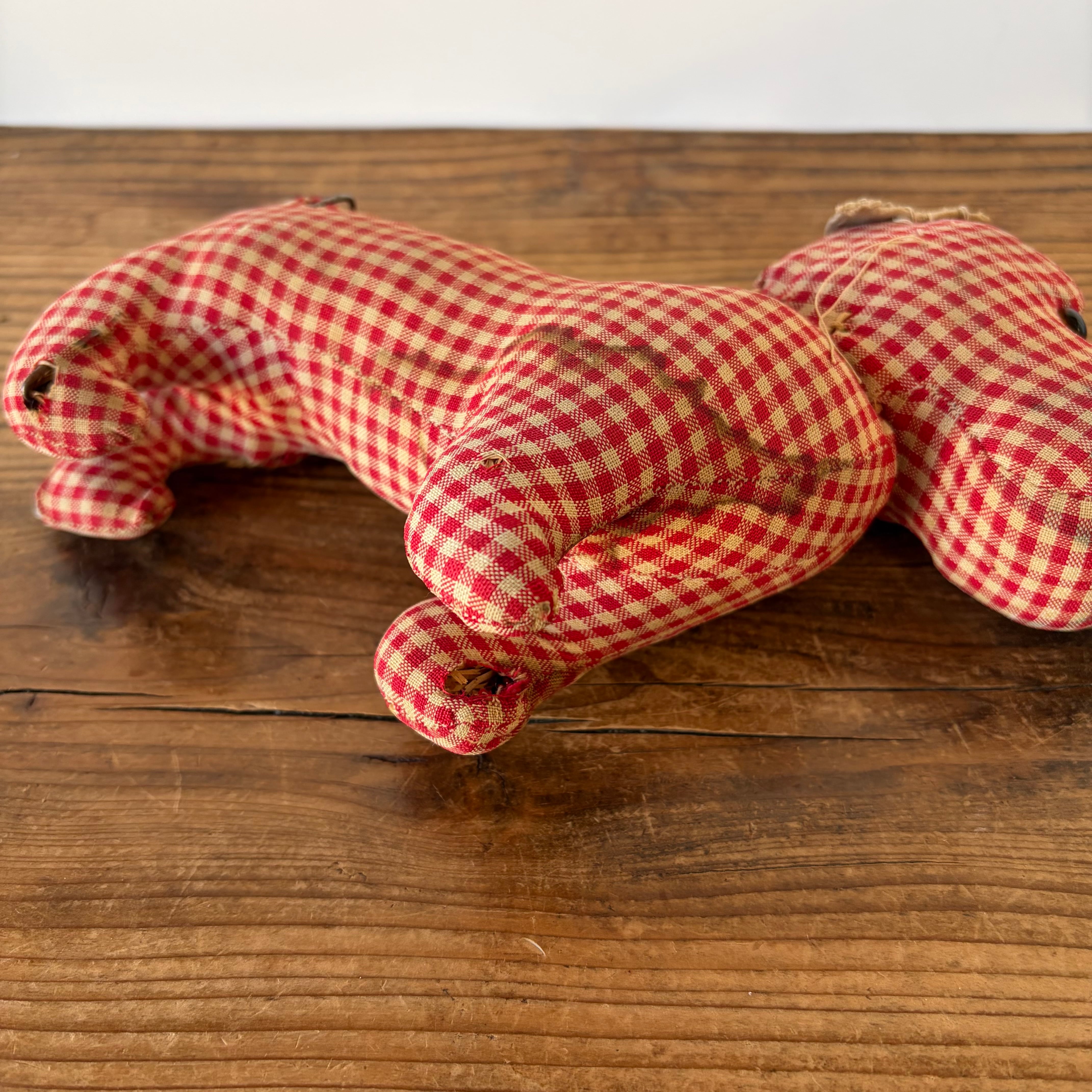 スウェーデンで見つけた、赤×生成りのギンガムチェック生地が印象的な犬のぬいぐるみ。