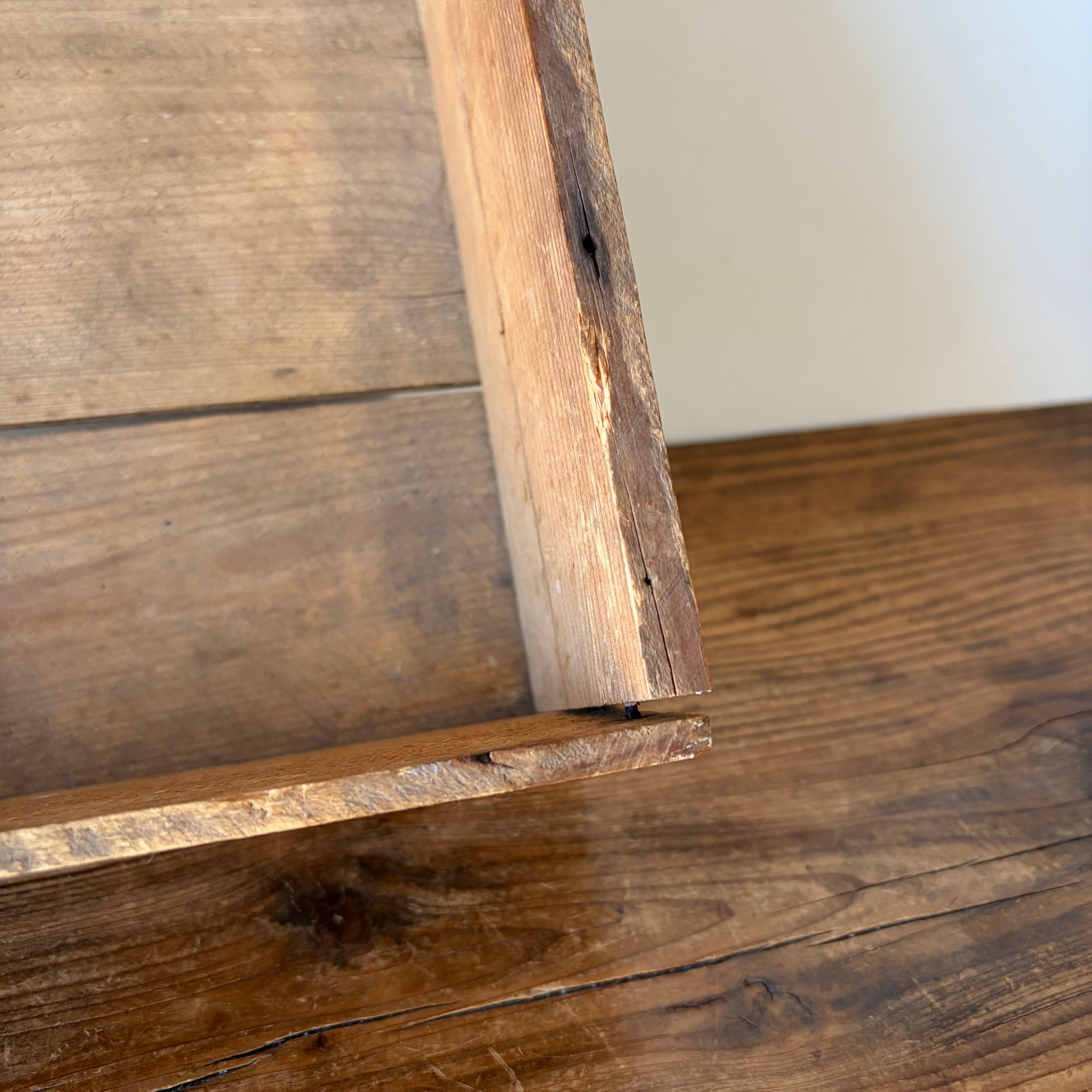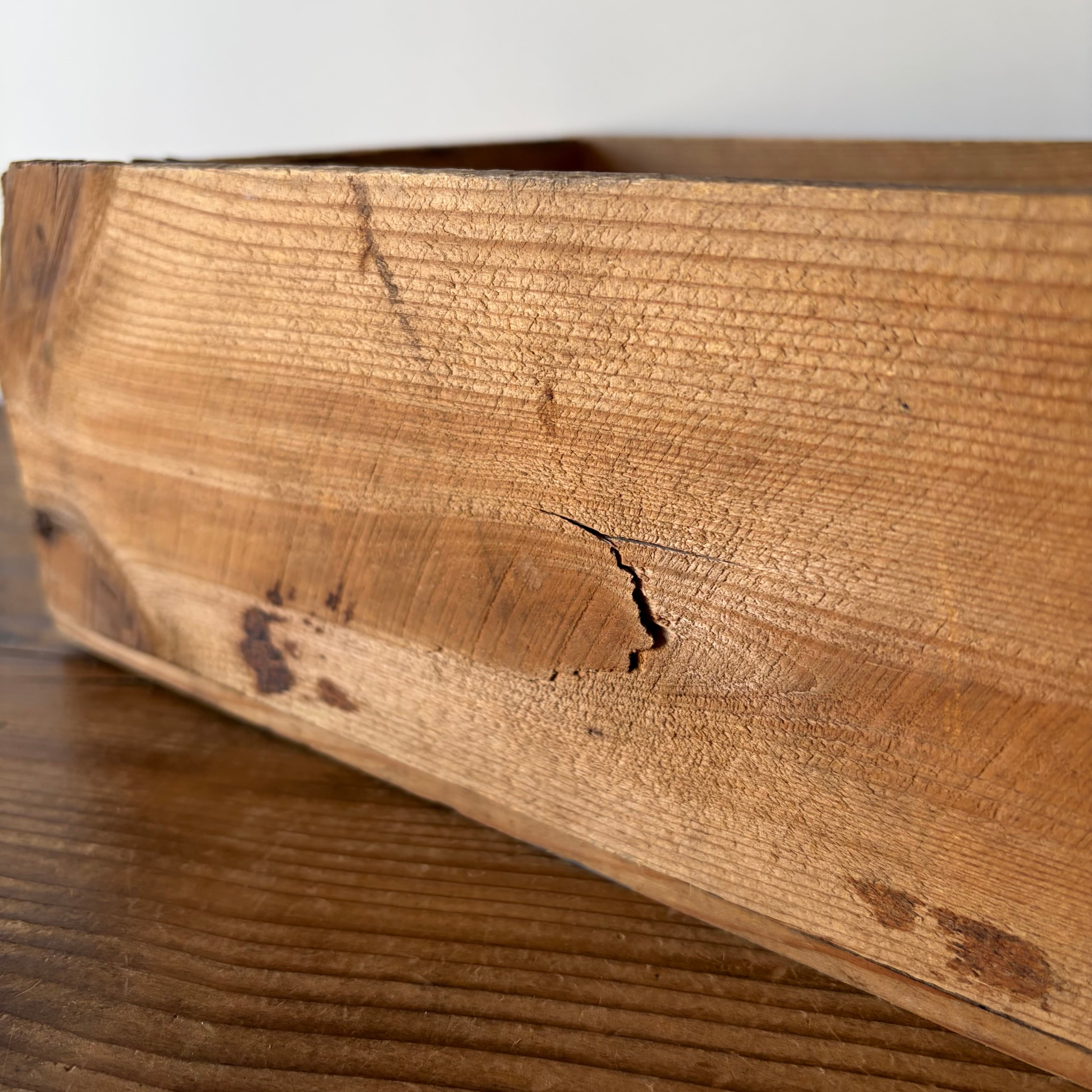 側板・底板・端部には乾燥や経年による亀裂・割れがあり、割れが生じている箇所には釘の浮きや抜けが見られます。その影響で板の歪みやわずかな隙間がある部分もございます。