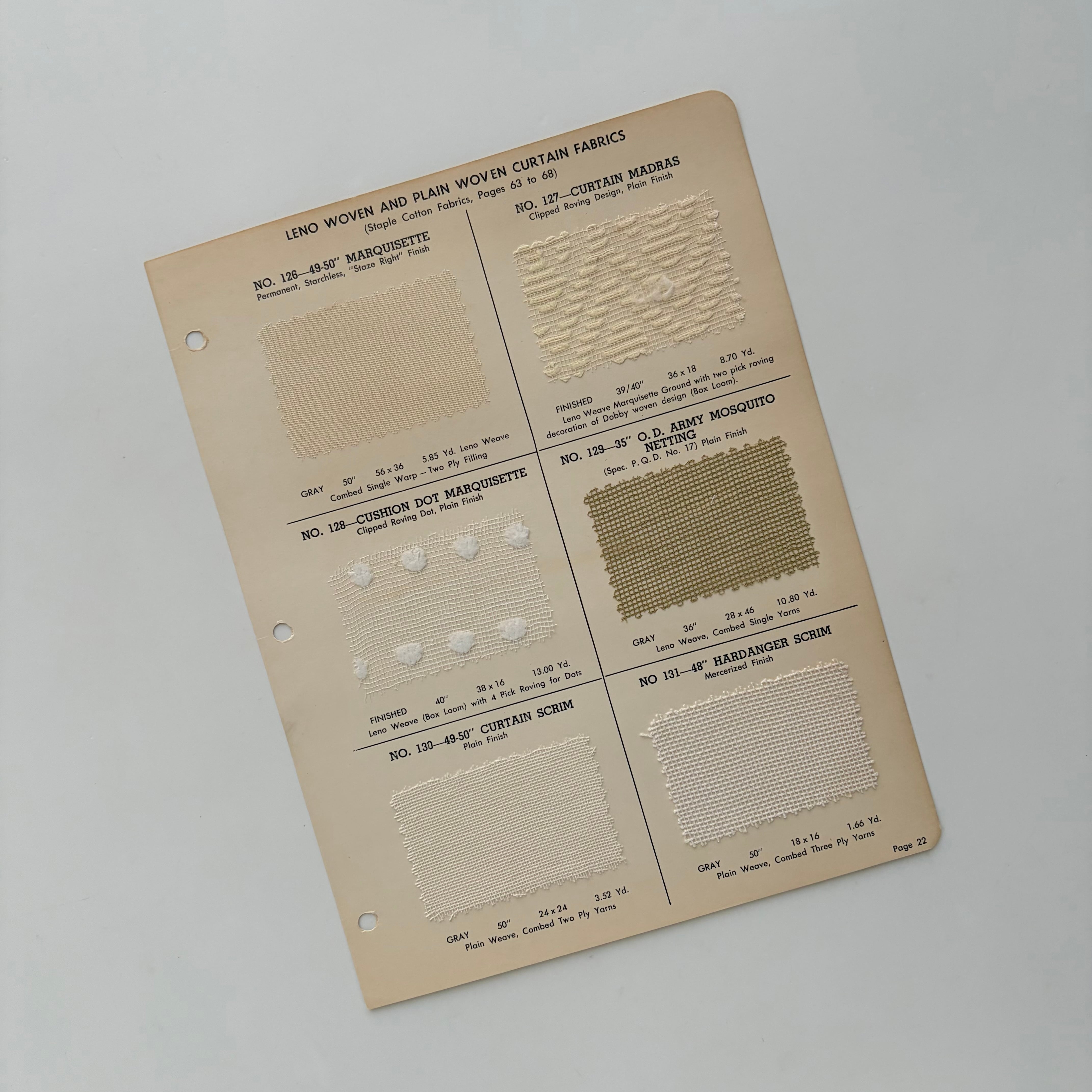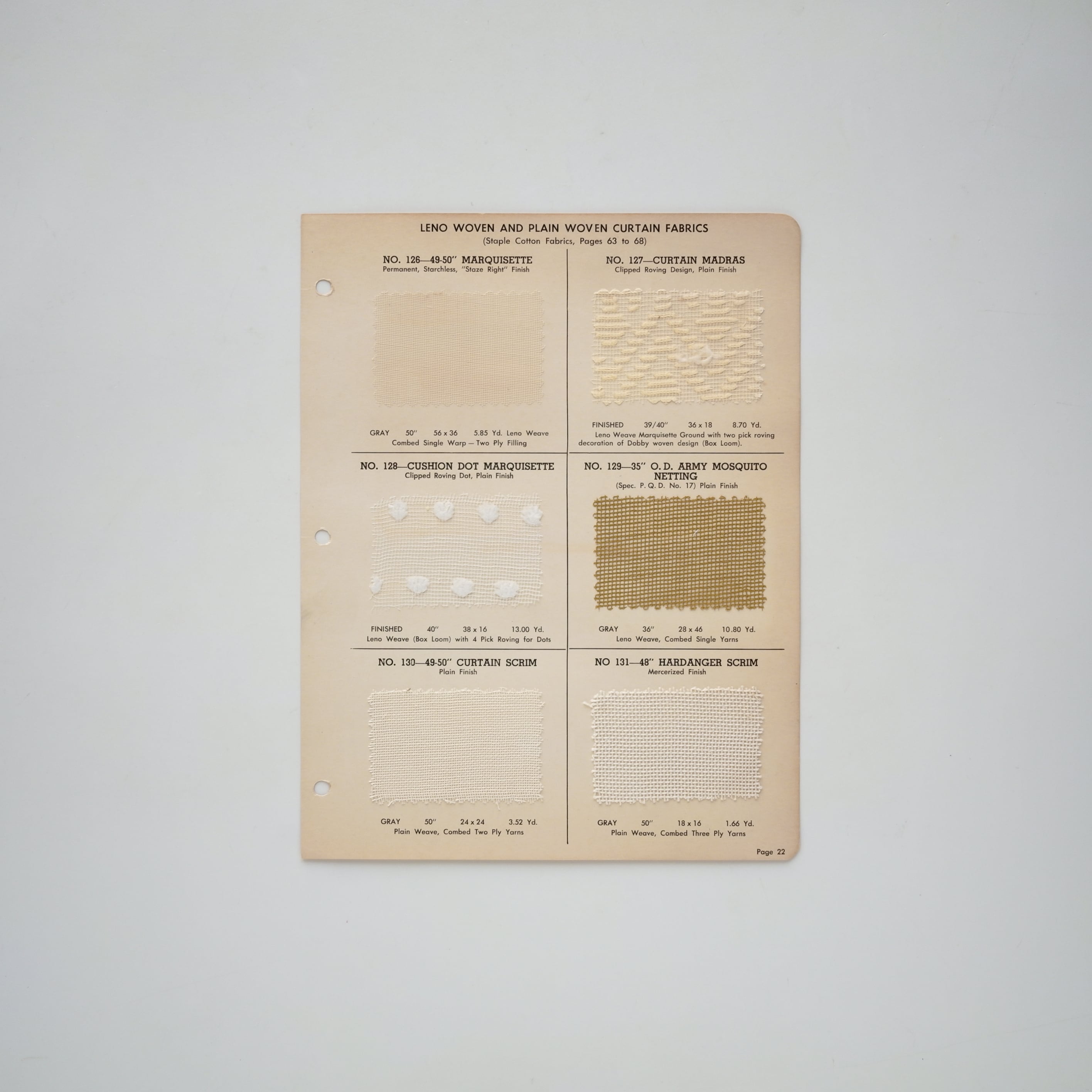 マーキゼット、マドラス、スクリム、モスキート・ネッティングなど、用途別に実際の生地サンプルが構成されており、織り方や糸の種類、仕上げ方法などが英語で詳細に記載されています。