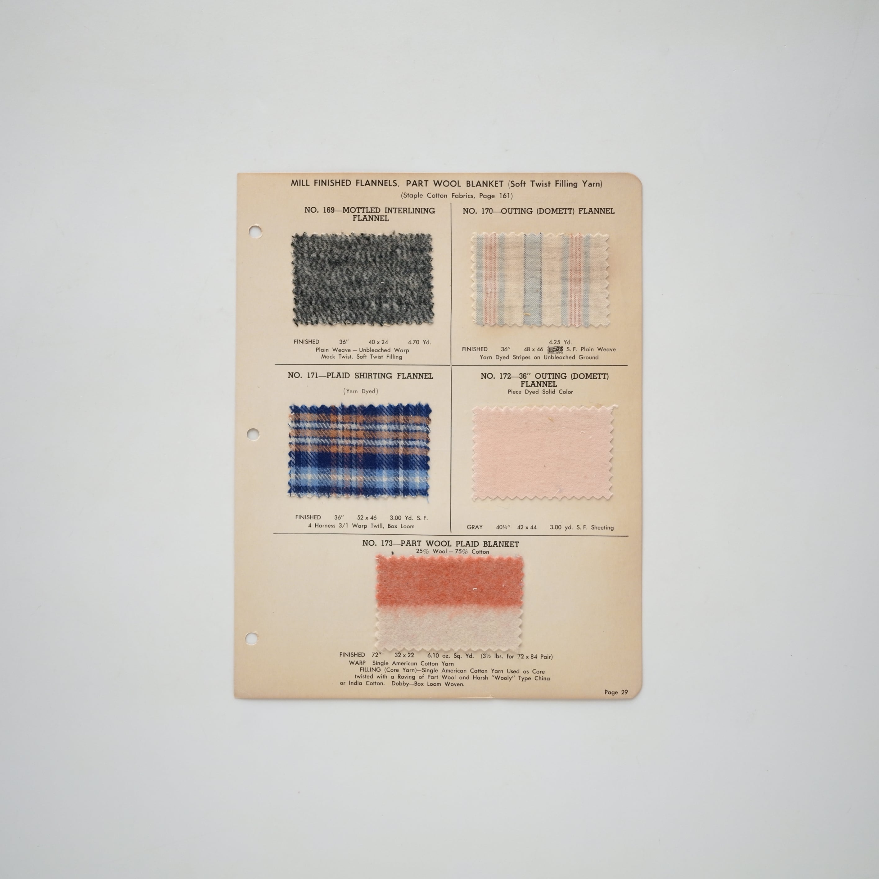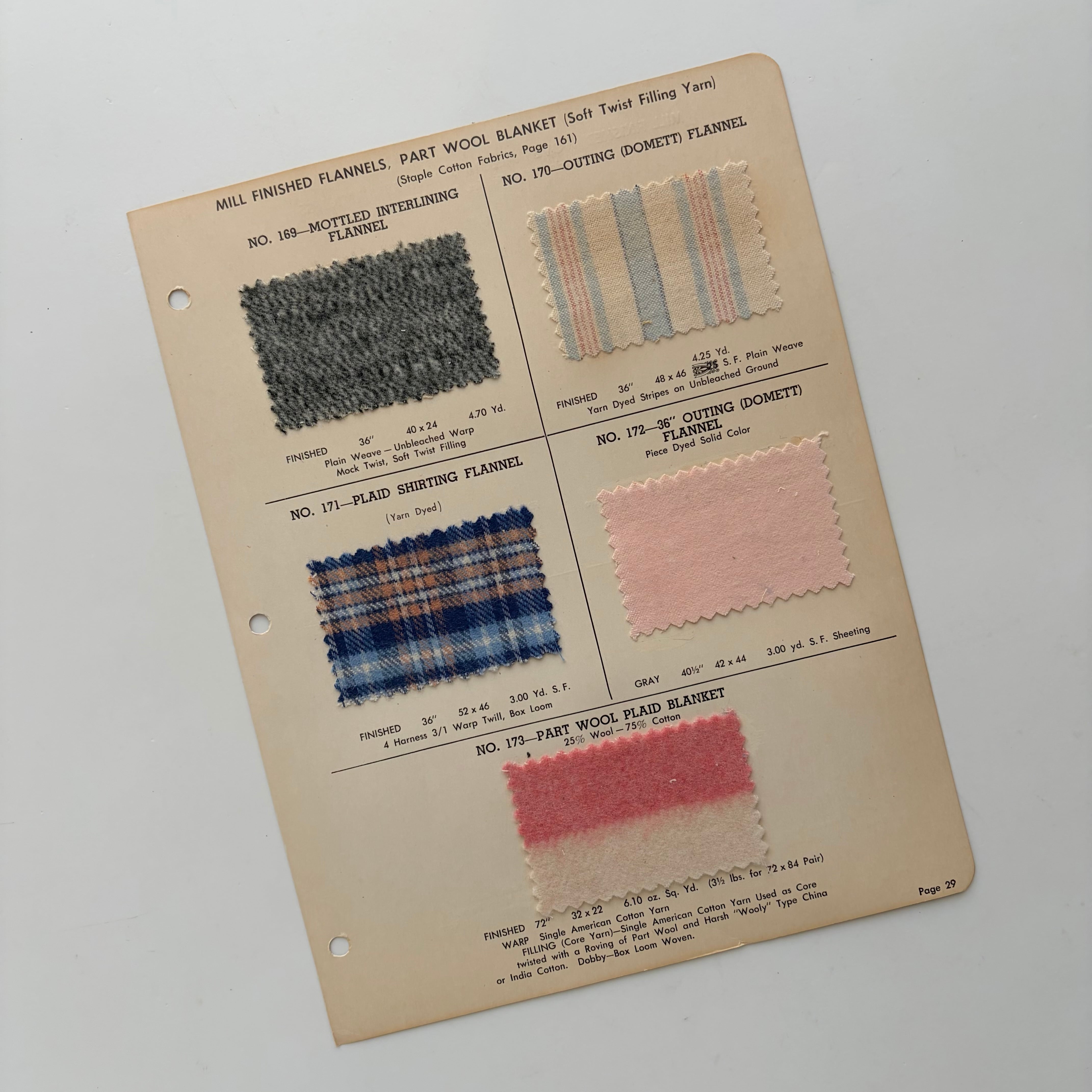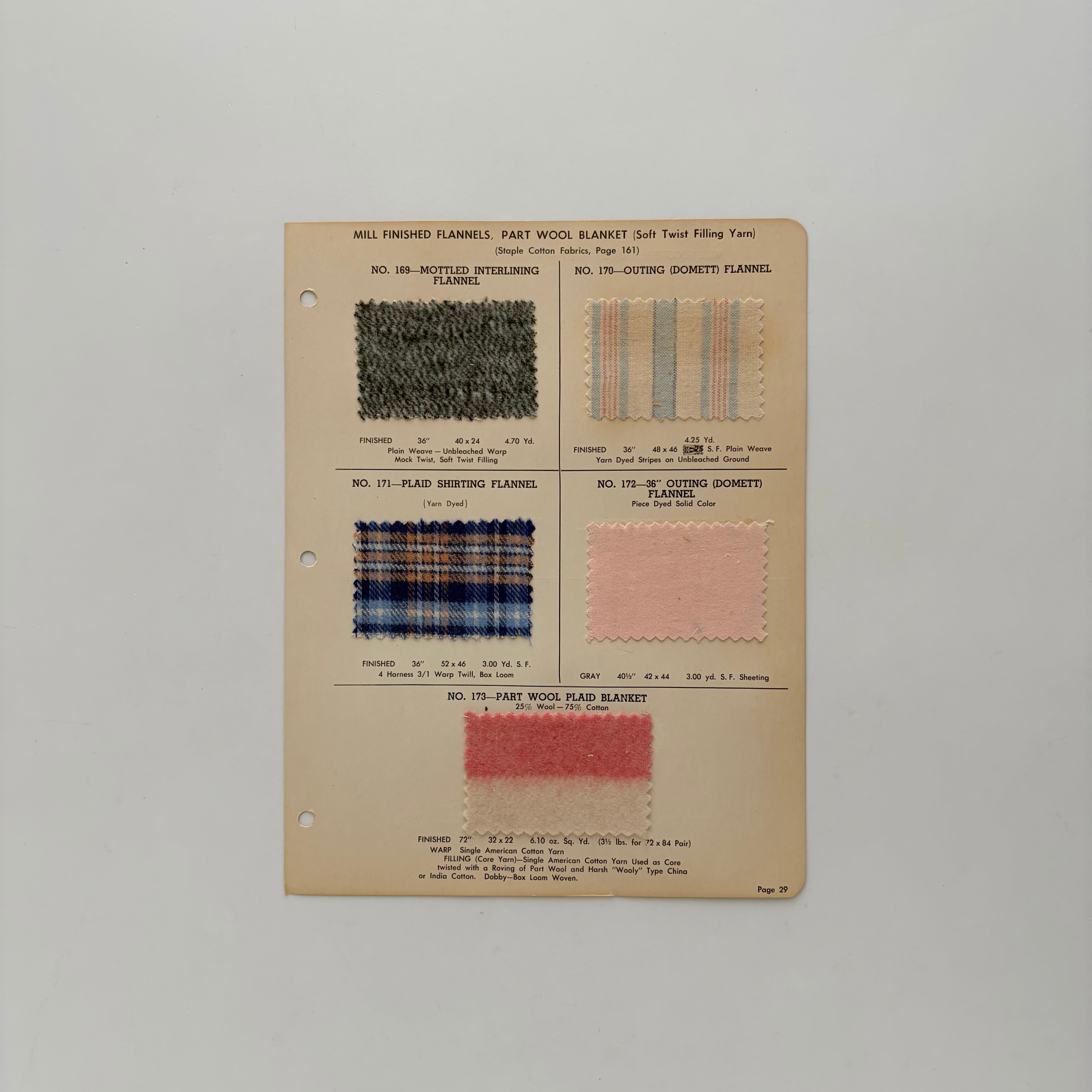 フランネル、シャツ地、毛布用生地、ピロー/マットレス生地など、用途別に実際の生地サンプルが構成されており、織り方や糸の種類、仕上げ方法などが英語で記載されています。