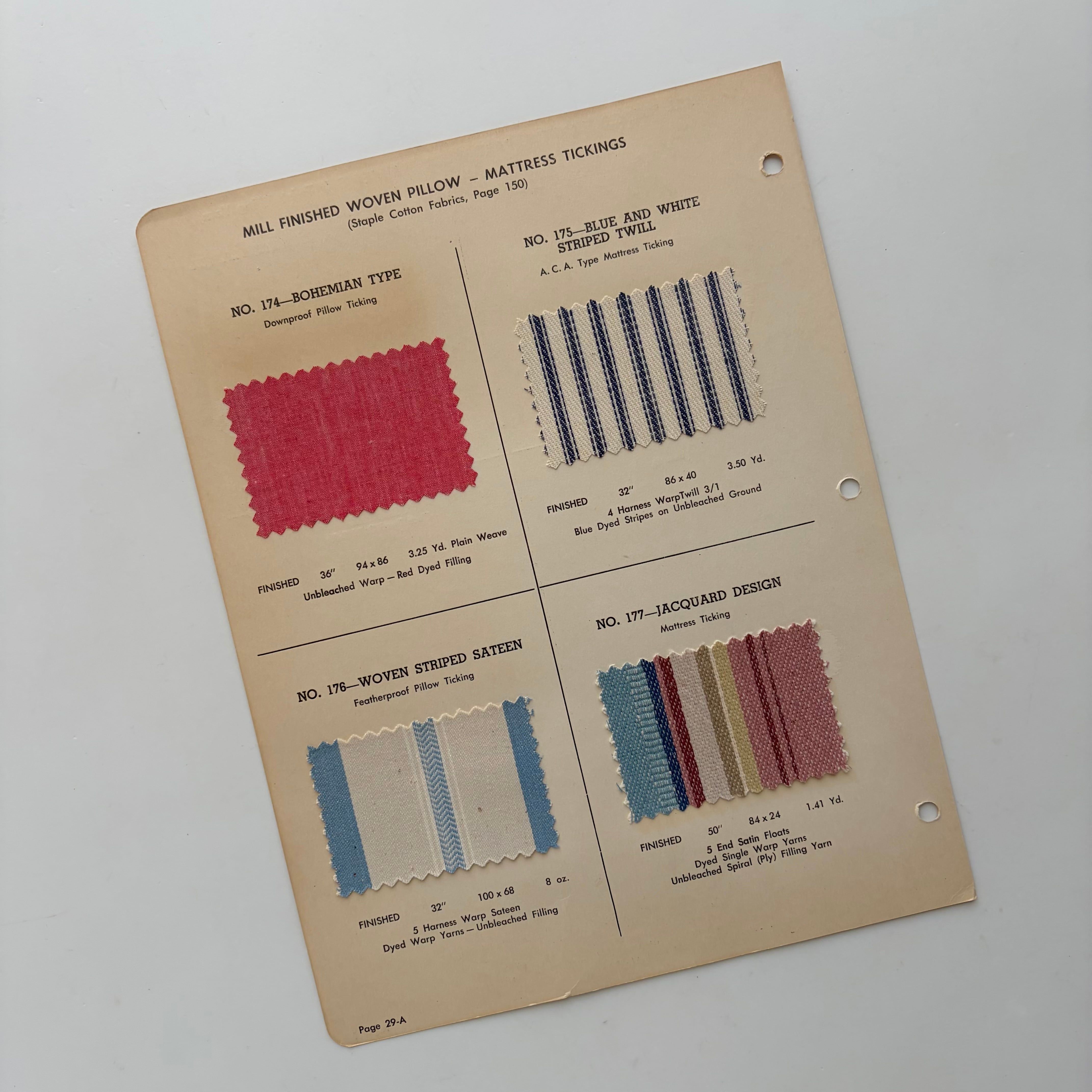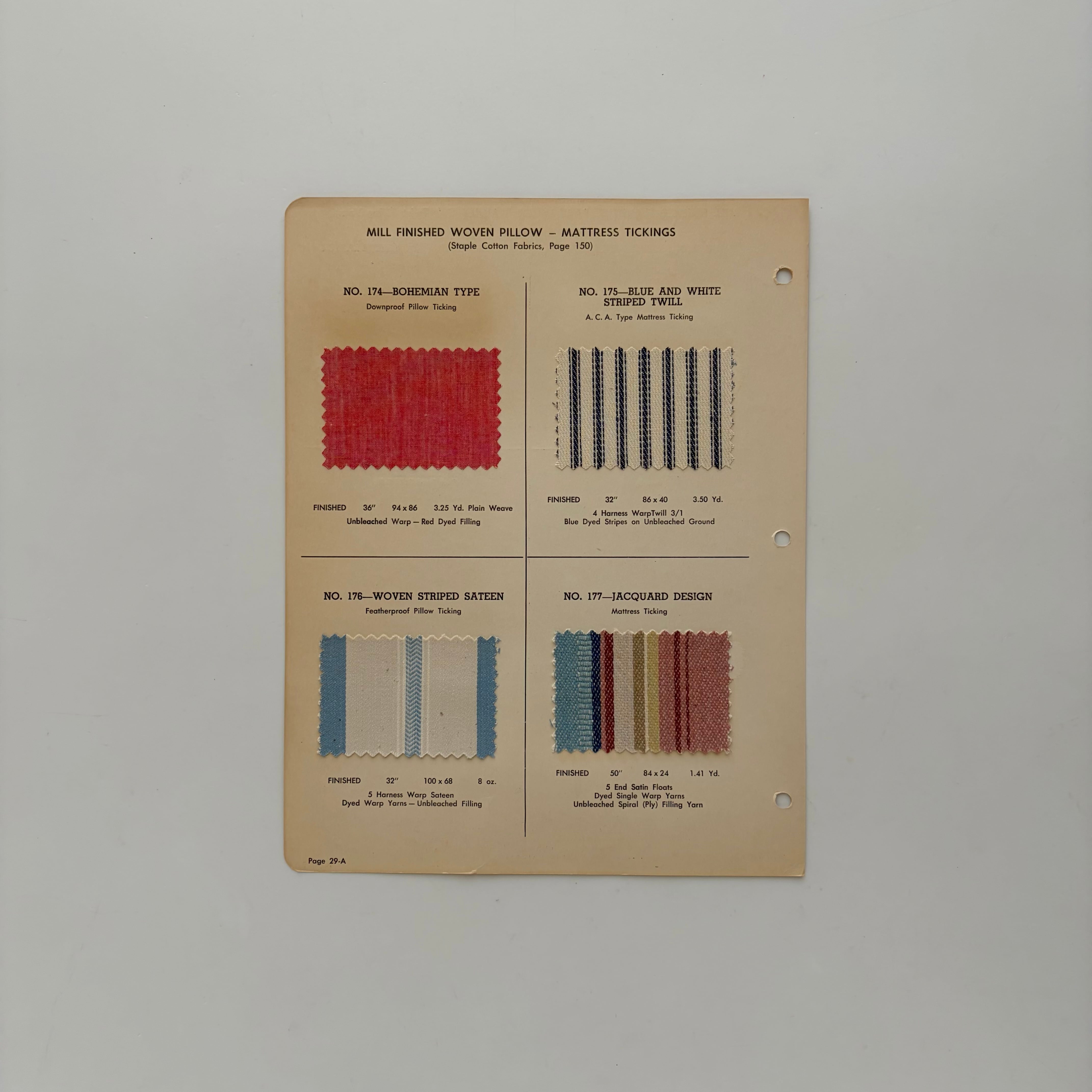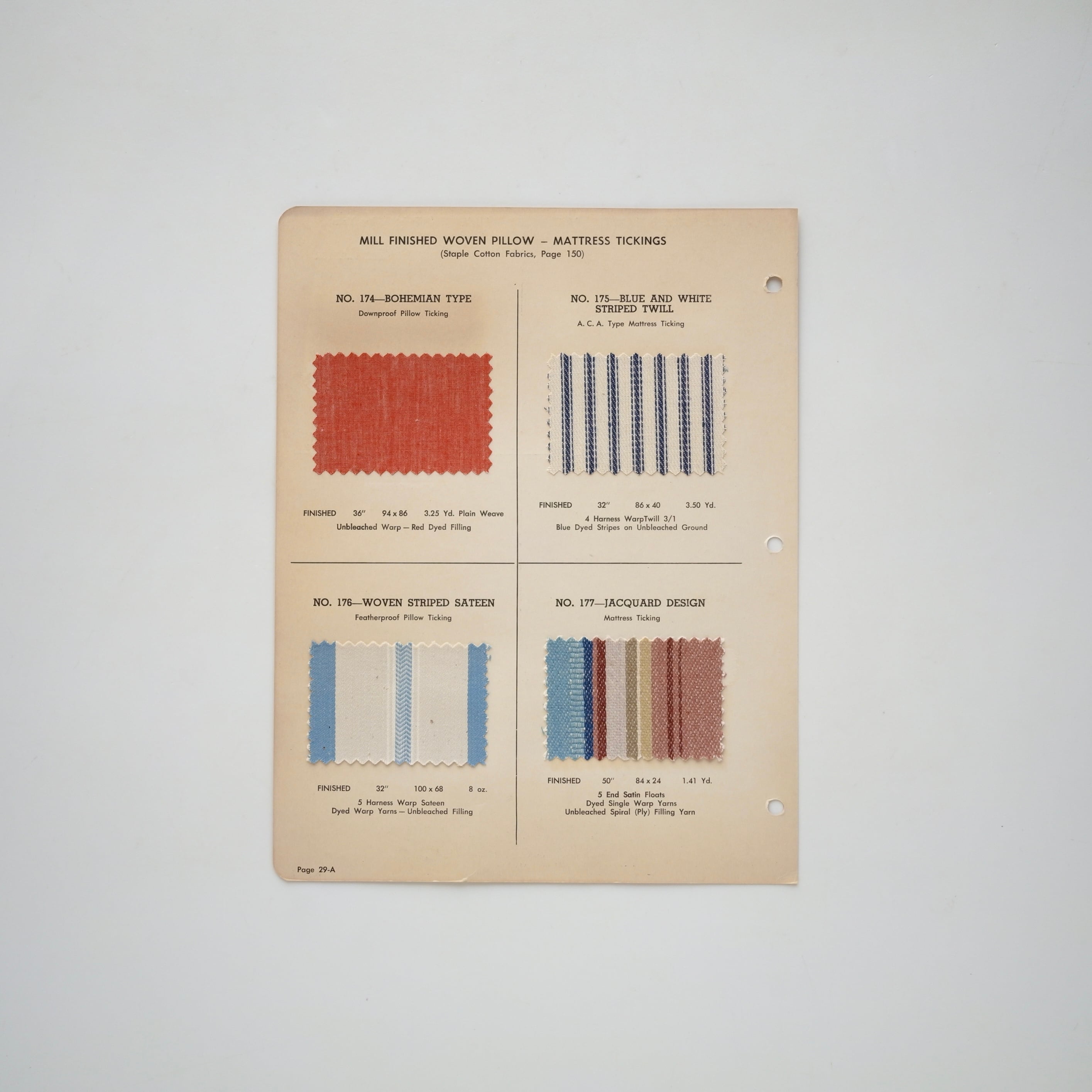 フランネル、シャツ地、毛布用生地、ピロー/マットレス生地など、用途別に実際の生地サンプルが構成されており、織り方や糸の種類、仕上げ方法などが英語で記載されています。