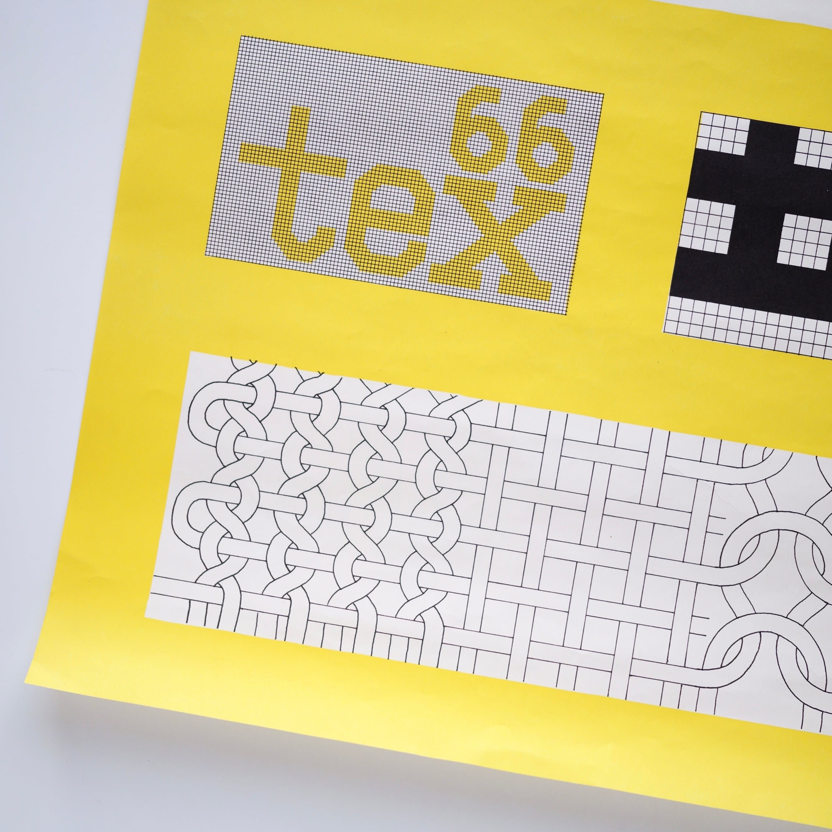 糸玉や織組織を想起させるグラフィカルなモチーフに、グリッド状に構成された「tex 66」のタイポグラフィを組み合わせたデザインが印象的です。