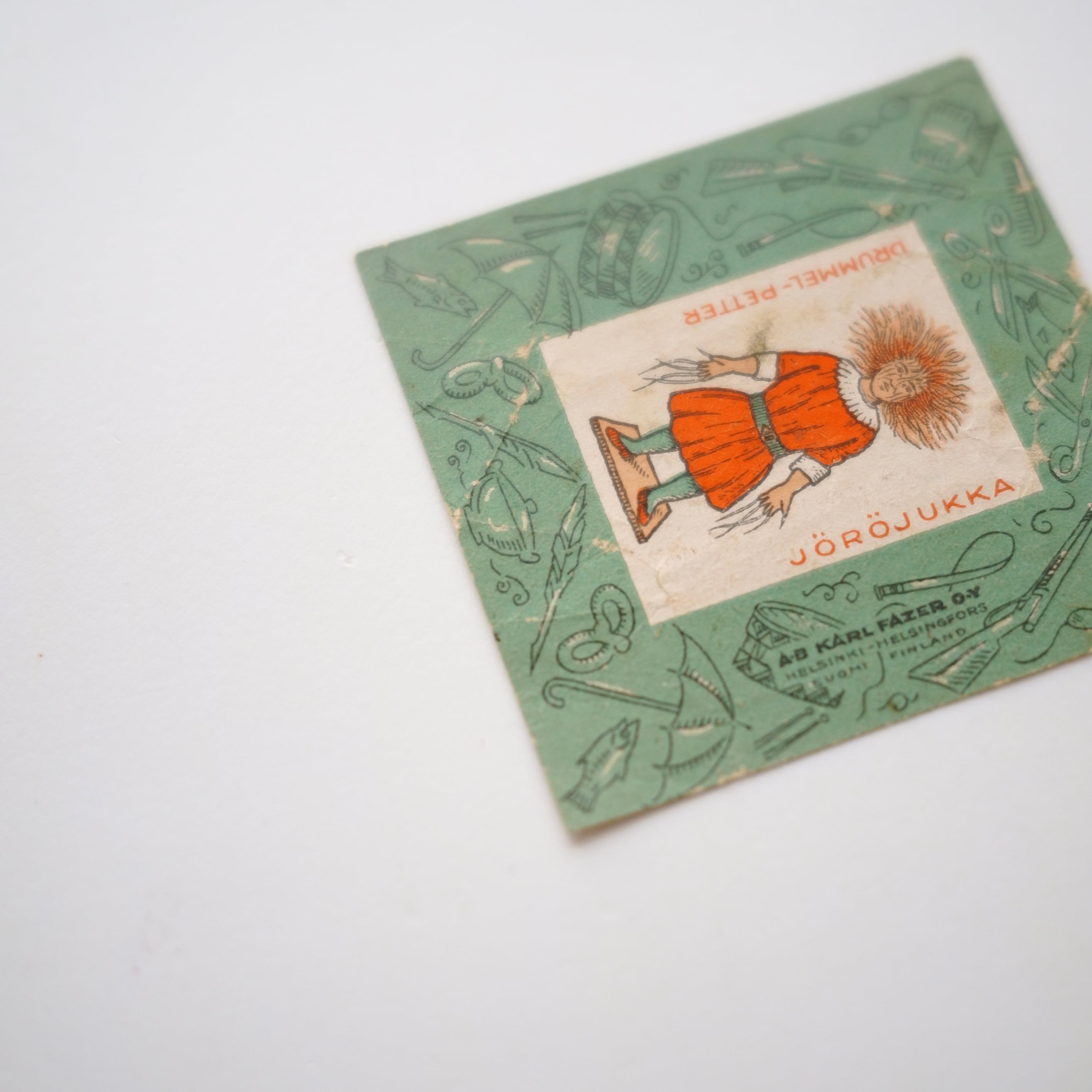 フィンランドの老舗菓子メーカーFazerが製造していた菓子「JÖRÖJUKKA/DRUMMEL-PETTER」の包み紙です。