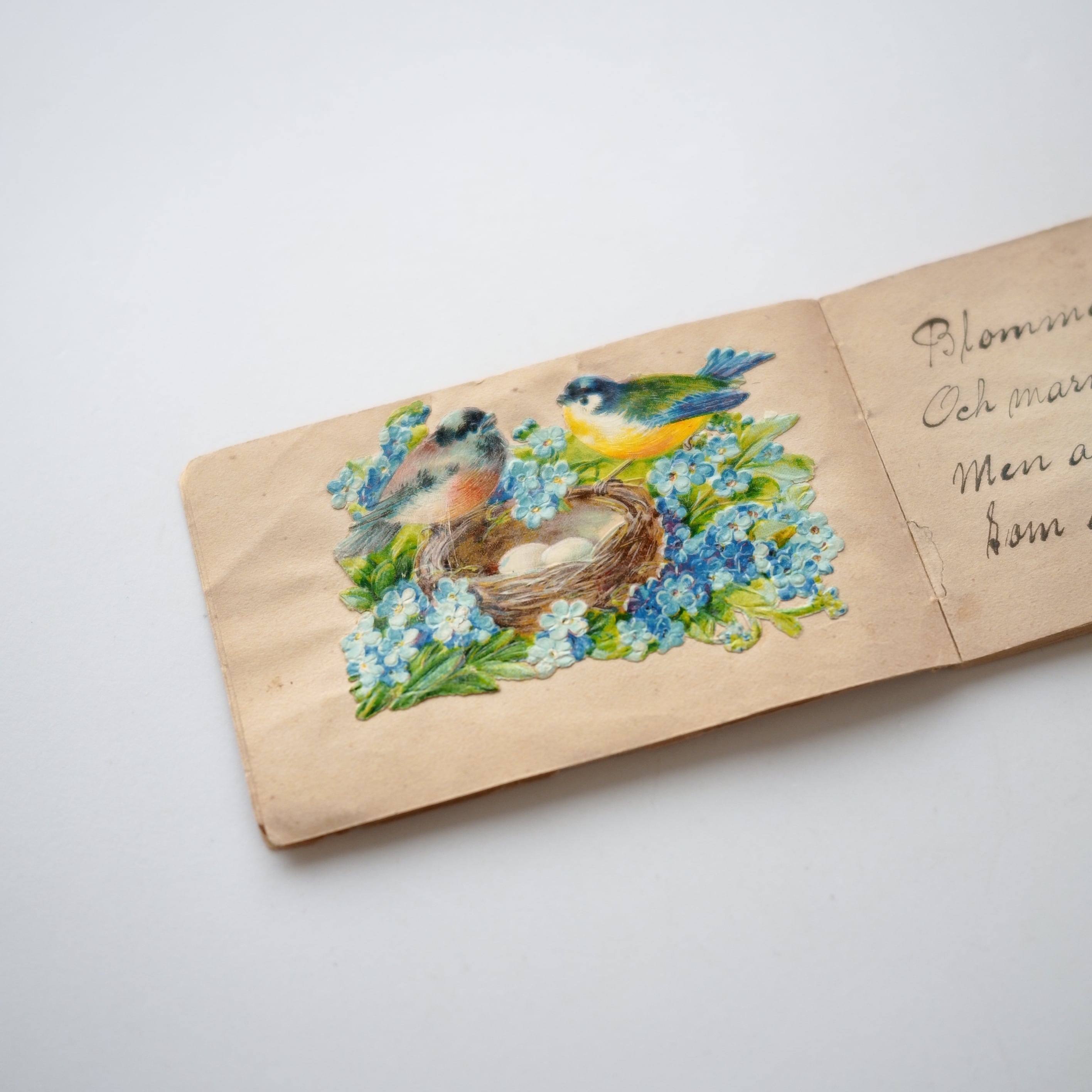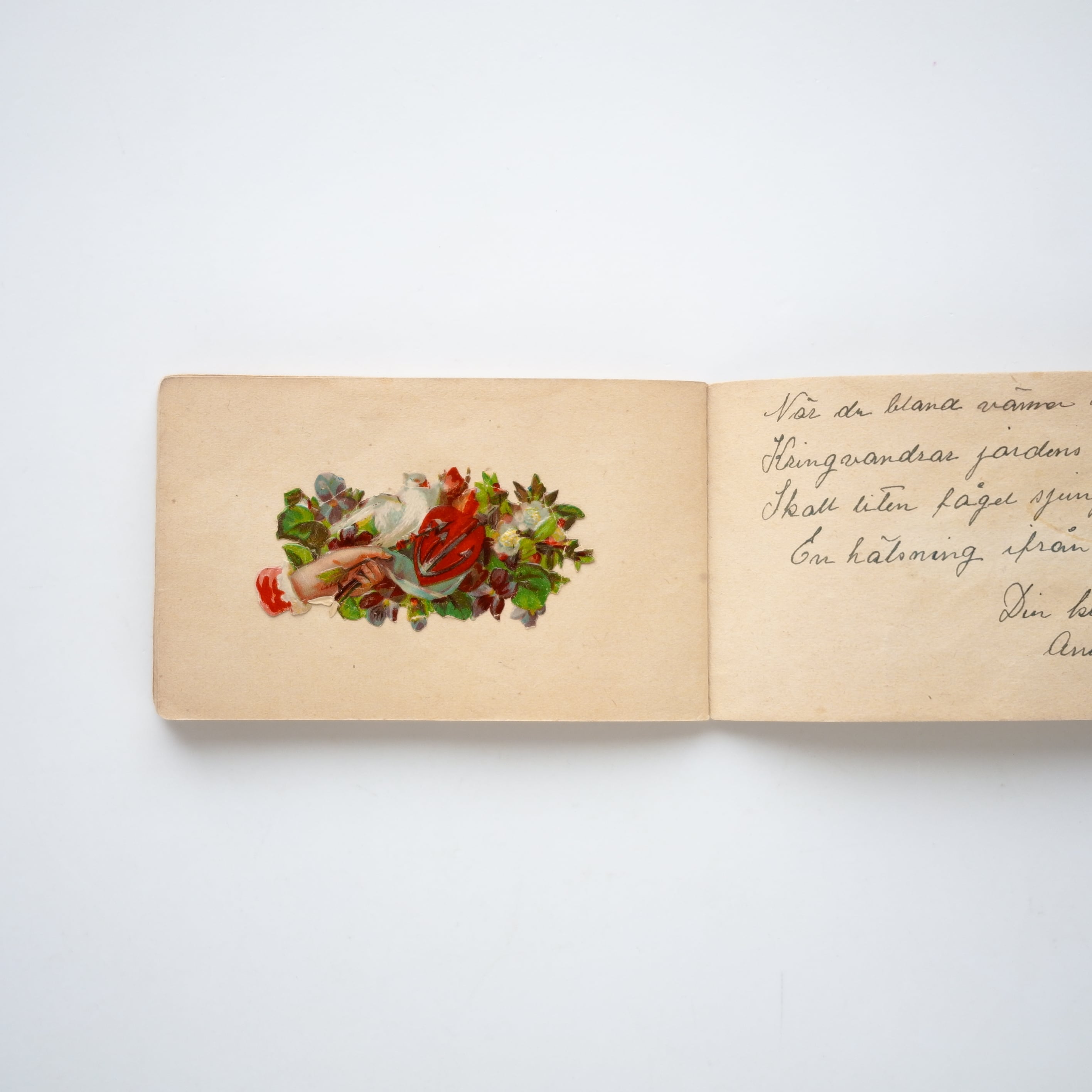 ページには、花束、手、鳥、蝶などの彩色された貼り絵や挿絵が添えられており、当時の持ち主と、その周囲の人々との静かな交流の記憶が感じられます。