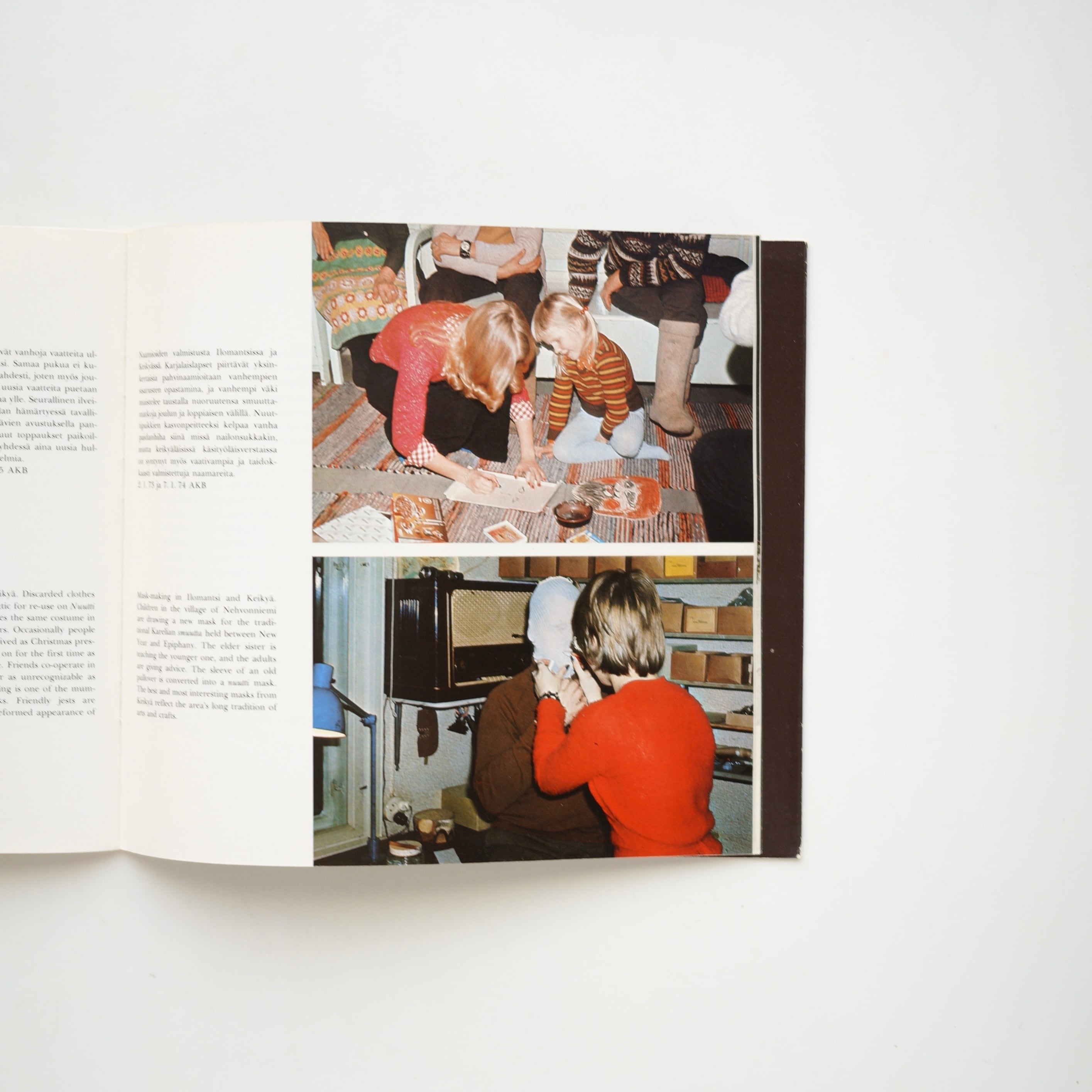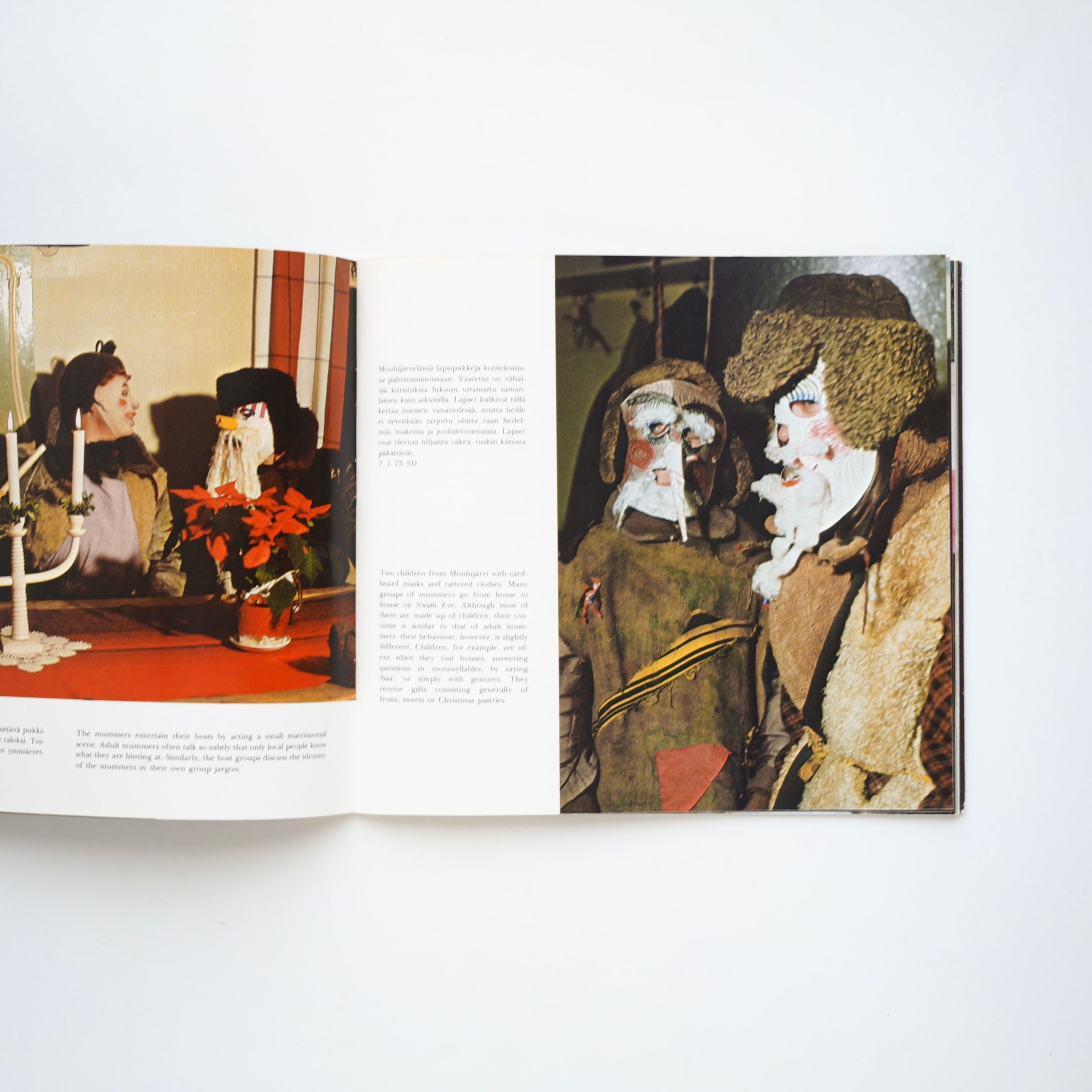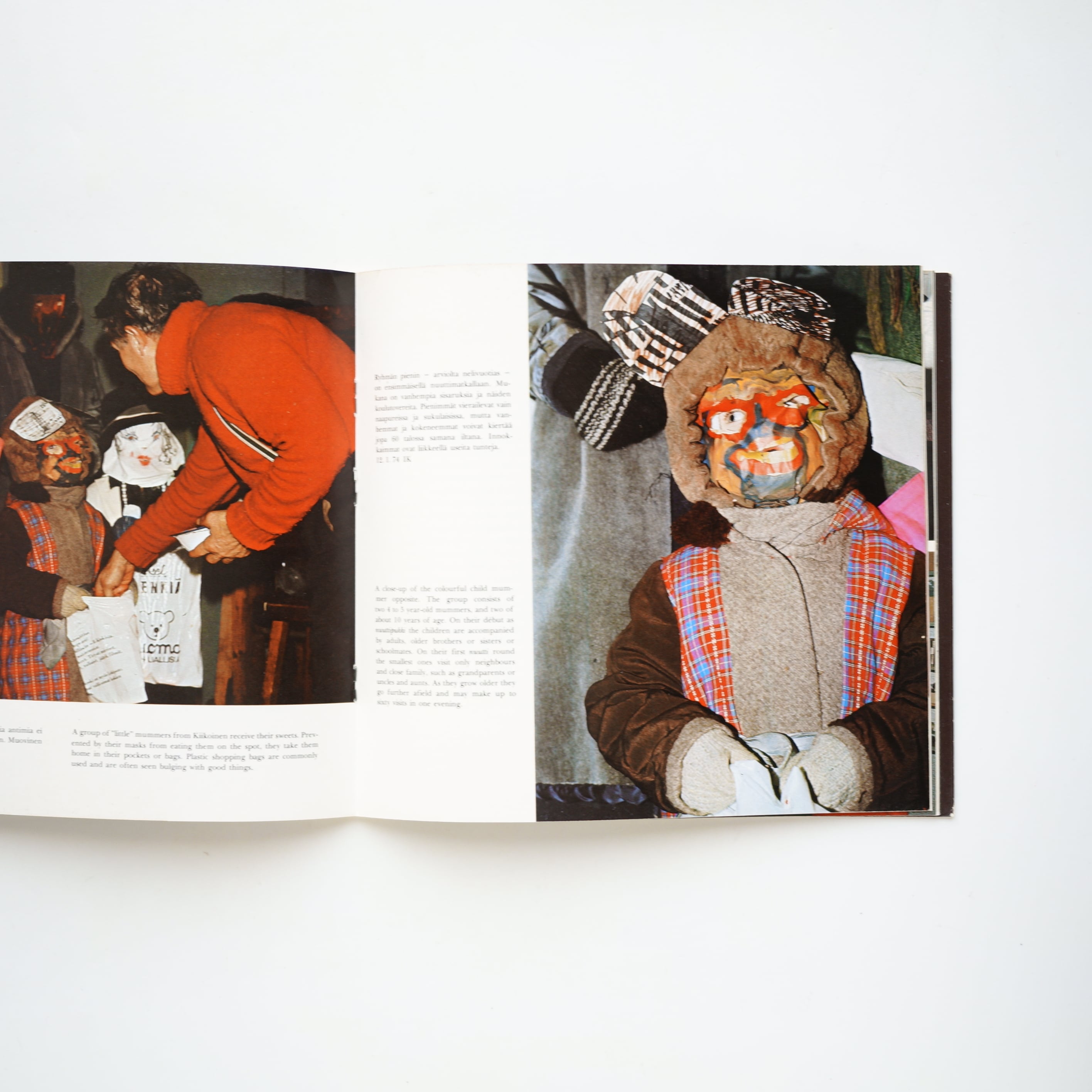 仮面や衣装を身につけた人々が家々を訪れる様子、子どもたちの手作りマスク、夜の村を歩く仮装者たちなど、1970年代当時の記録写真が多数収録されています。