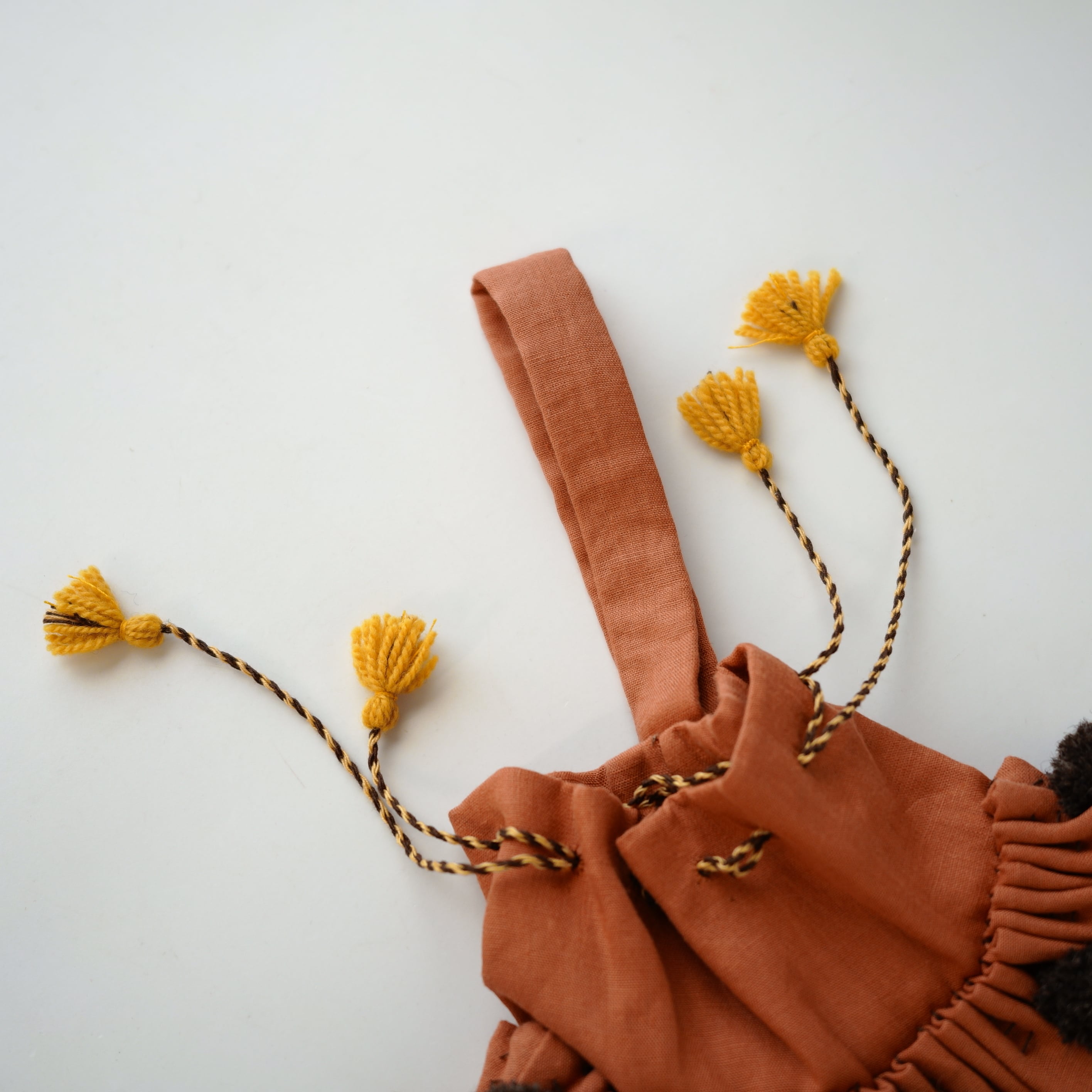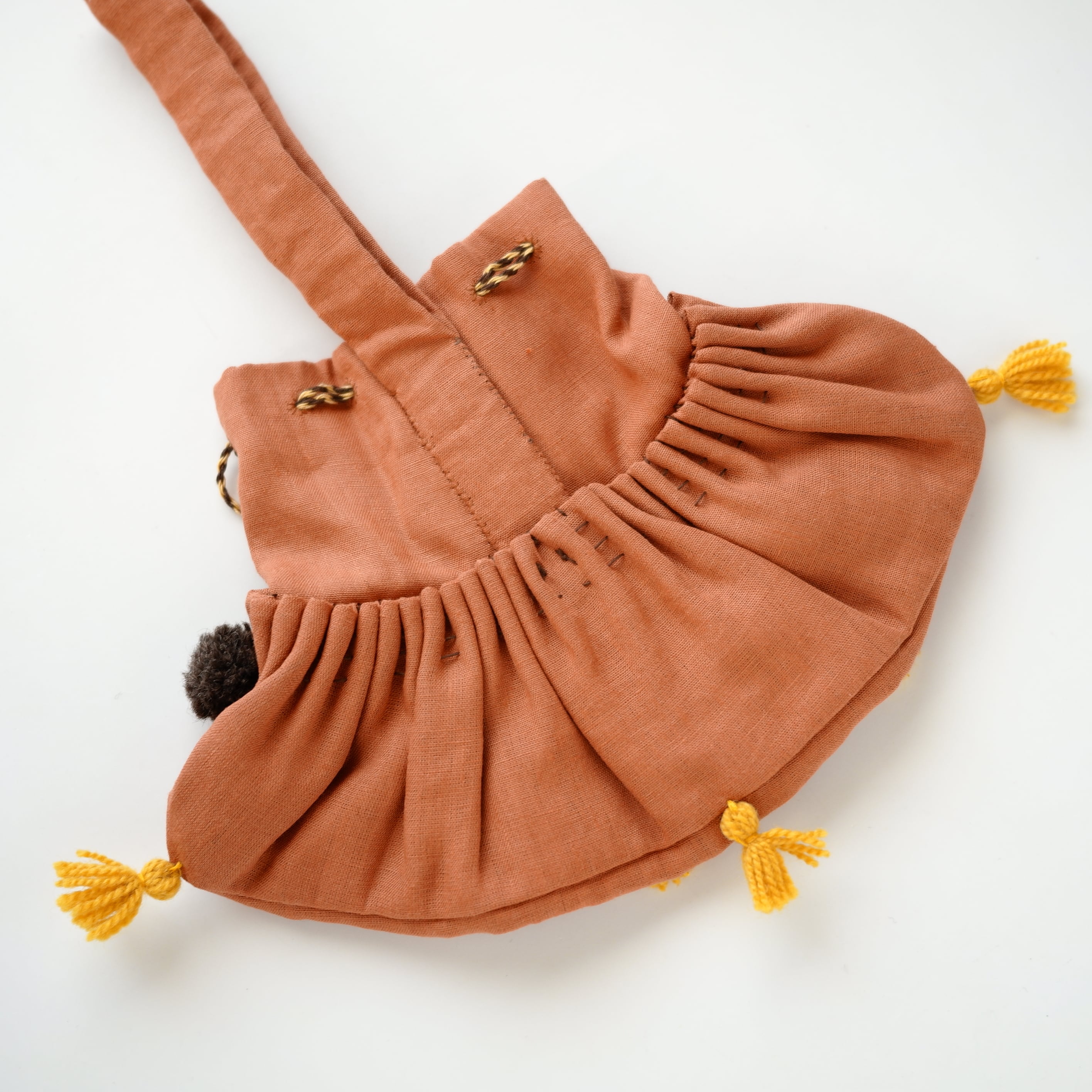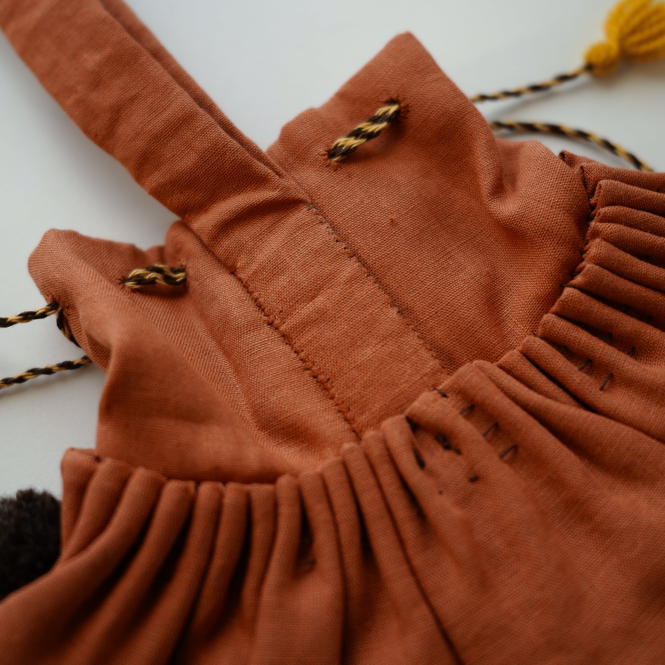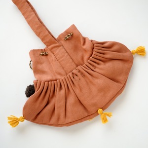 やわらかな布地にたっぷりと寄せられたギャザーと、ひと針ひと針手縫いで仕上げられたディテールが魅力です。ステッチや紐まわりにも手仕事ならではの表情があり、素朴であたたかみのある風合いを楽しめます。