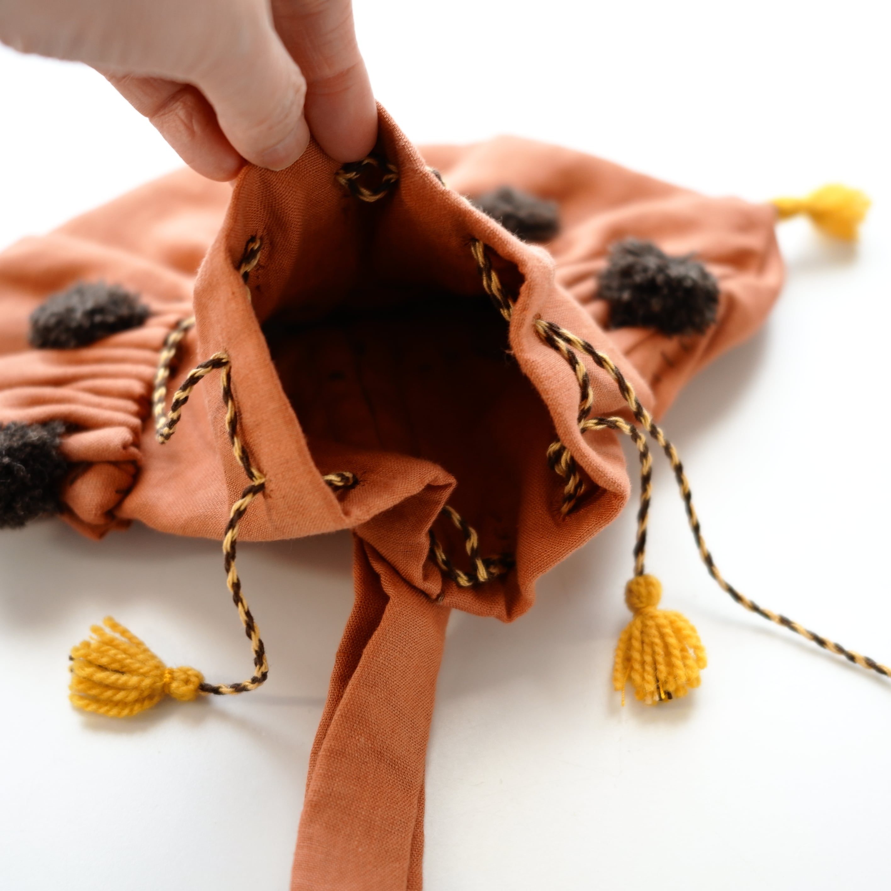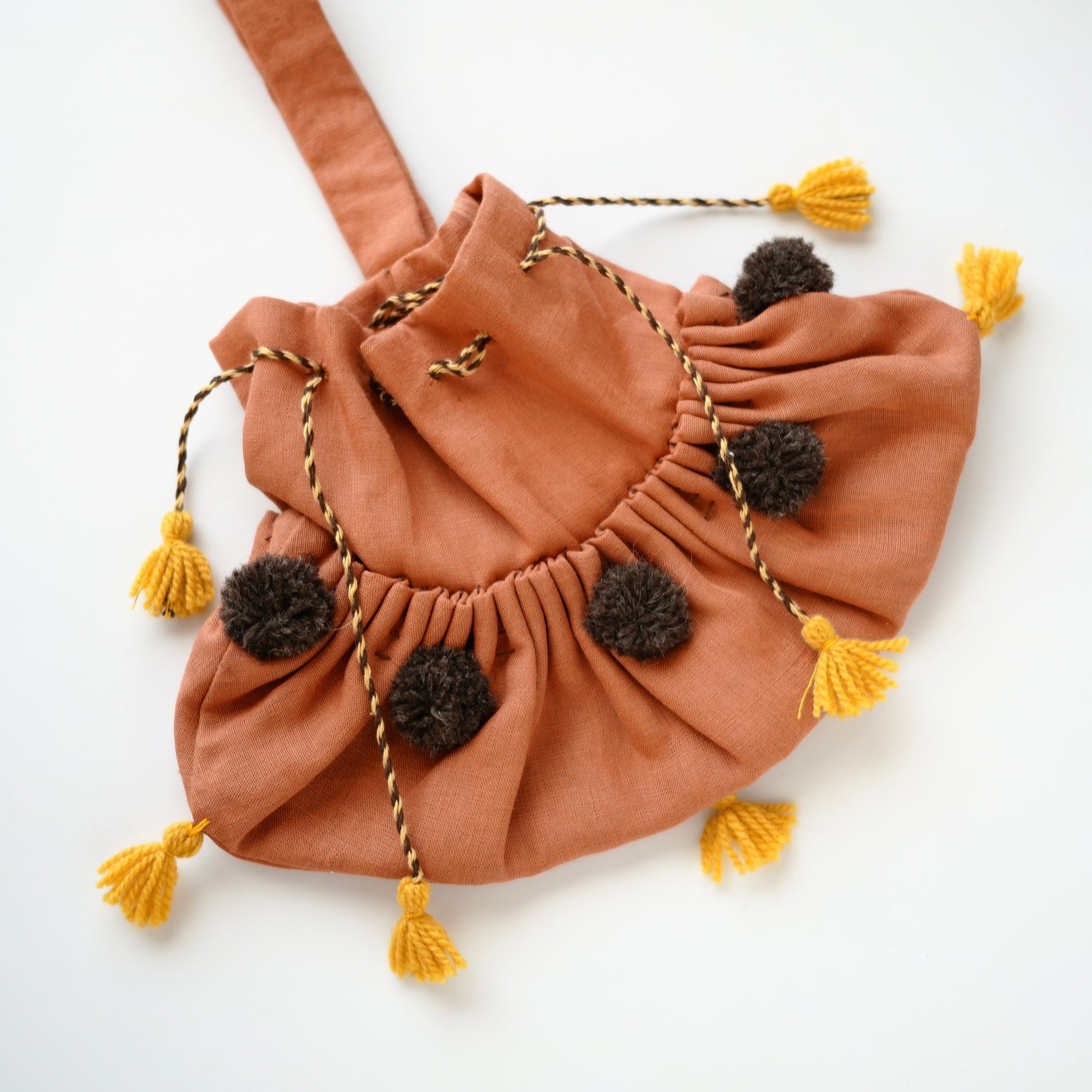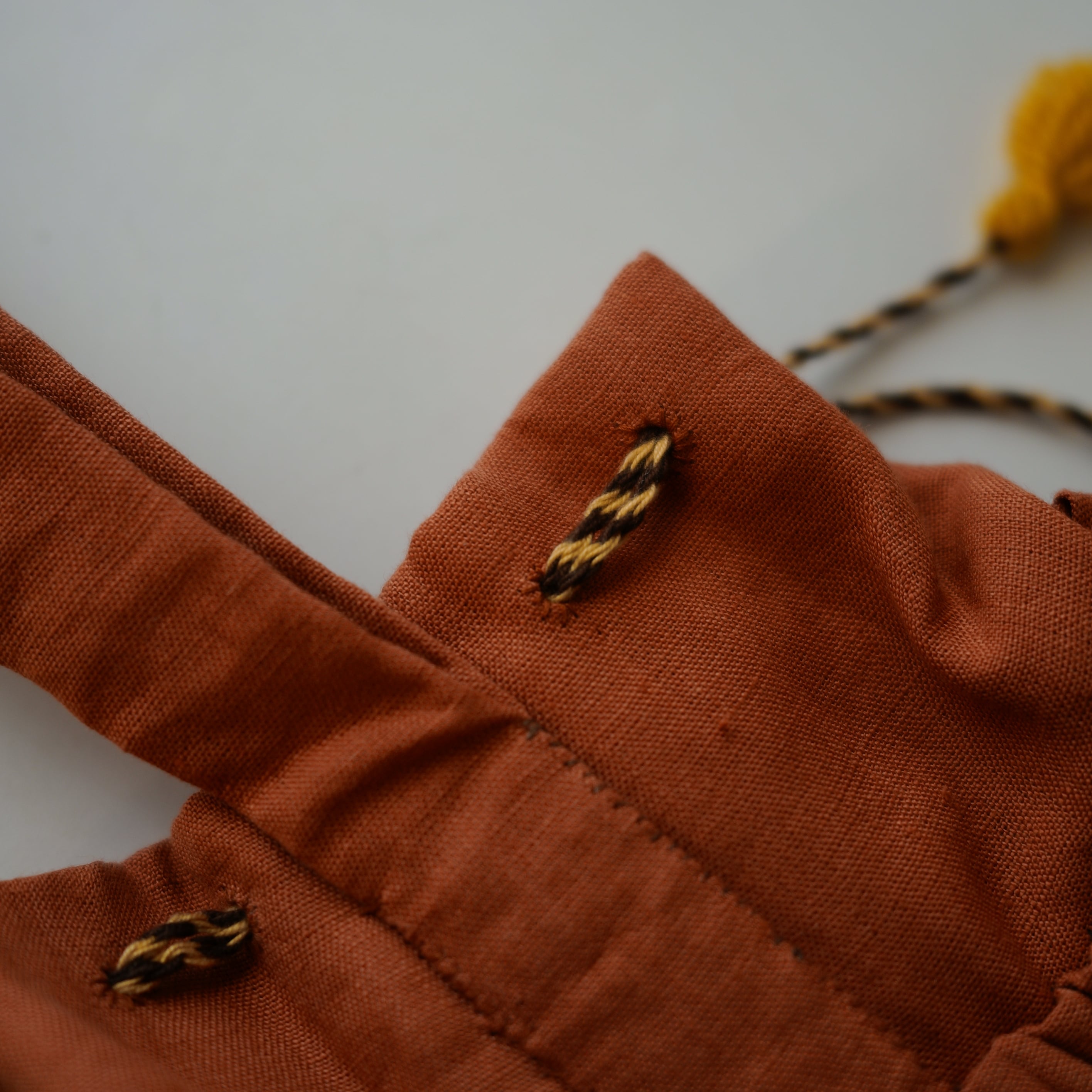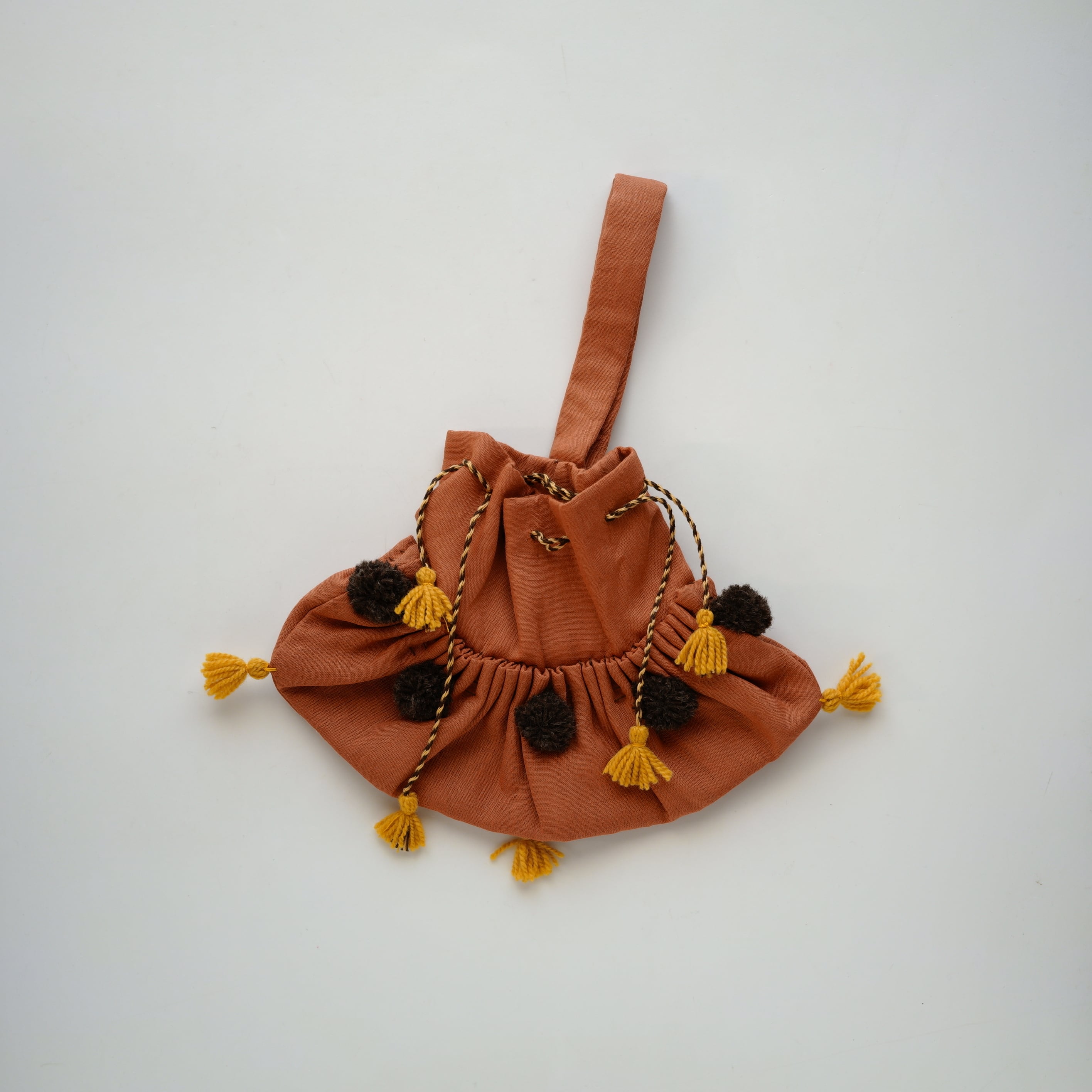やわらかな布地にたっぷりと寄せられたギャザーと、ひと針ひと針手縫いで仕上げられたディテールが魅力です。ステッチや紐まわりにも手仕事ならではの表情があり、素朴であたたかみのある風合いを楽しめます。
