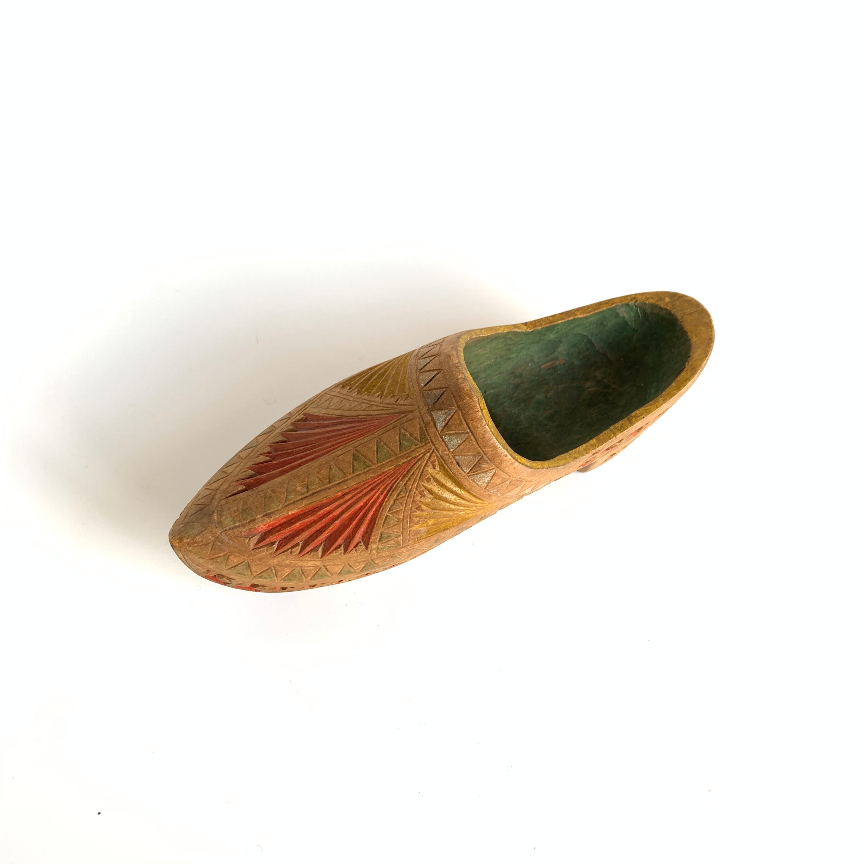 ウッドカービングが施された手彫りの木靴。